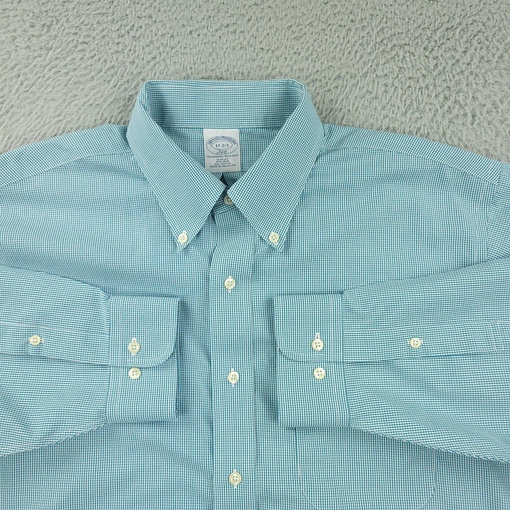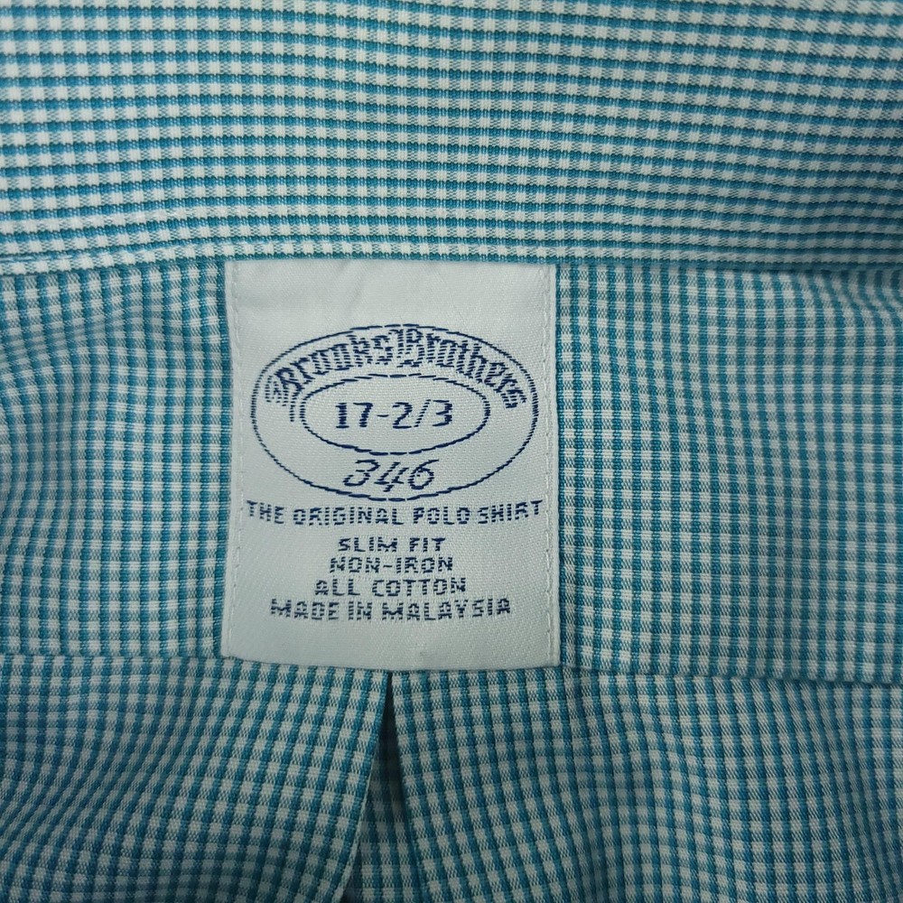 Brooks Brothers 346 Dress Shirt Mens 17 Blue Gingham Slim Non Iron Cotton Brand: Brooks Brothers Style: Mens long sleeve 346 collection dress shirt with slim fit silhouette and button-down collar. Color: Light blue and white micro gingham check pattern. Size on tag: Mens 17, slim fit. Material: 100% cotton non-iron woven shirting fabric. Made in Malaysia. Features: The Original Polo Shirt branding from the Brooks Brothers 346 line, button-down collar, full front button placket with white buttons, single chest pocket, back box pleat for ease of movement, long sleeves with adjustable barrel cuffs, non-iron finish designed to resist wrinkles and minimize ironing, versatile styling appropriate for business office, professional, or smart casual wear. Measurements are included in the photos, compare measurements with your item to ensure proper fit. Items are added daily click here to Visit My Store Combined shipping for US customers is 1.99 for each additional item Items are cleaned per eBay standards & policies