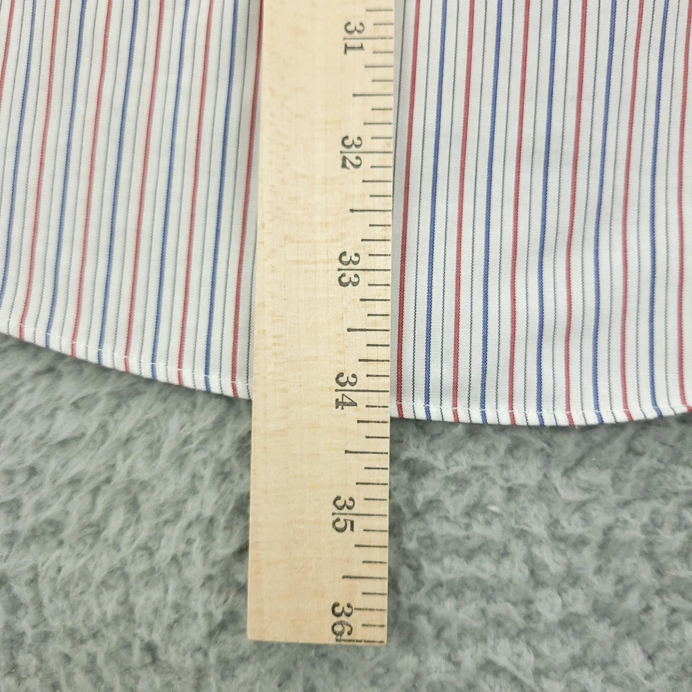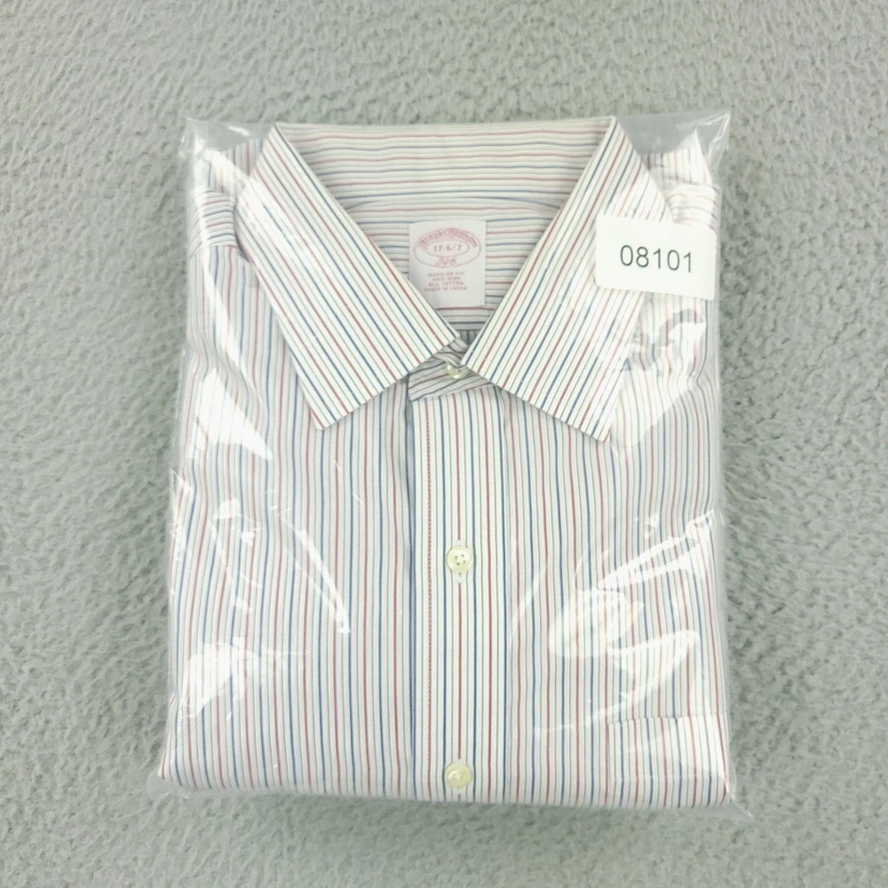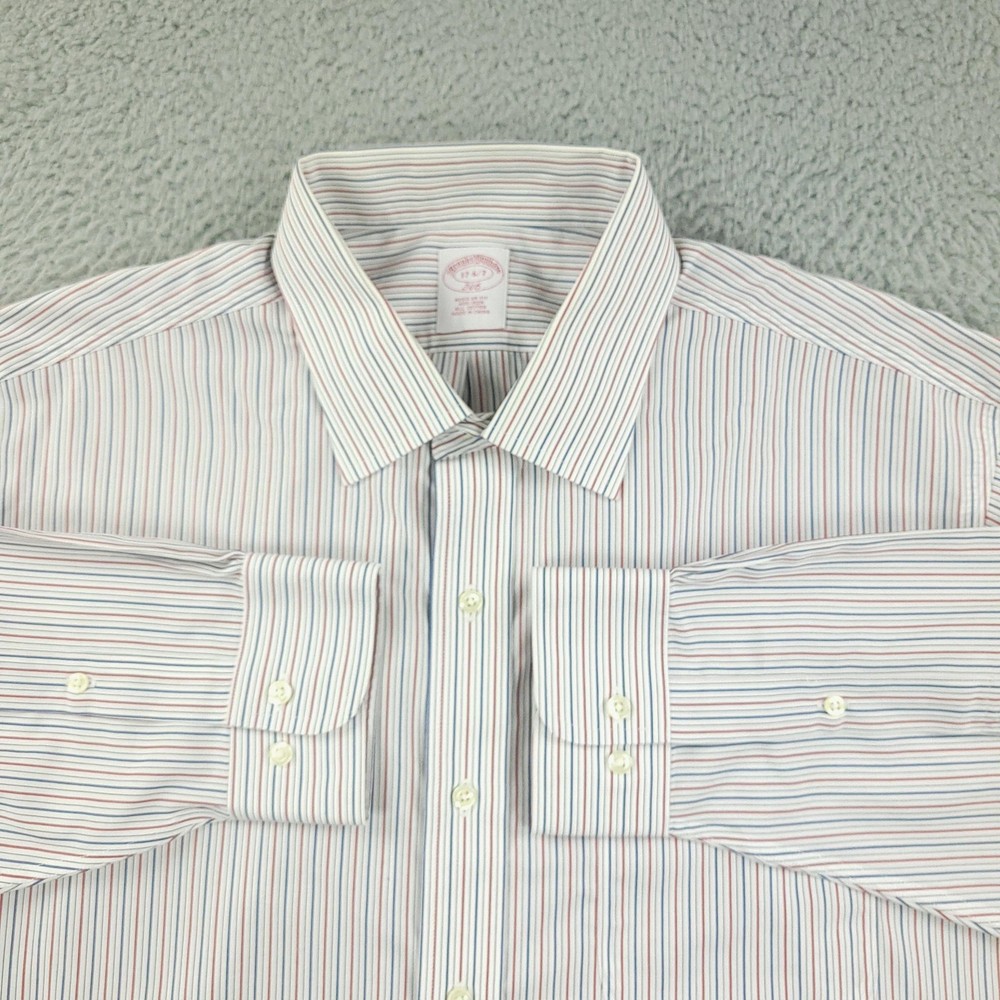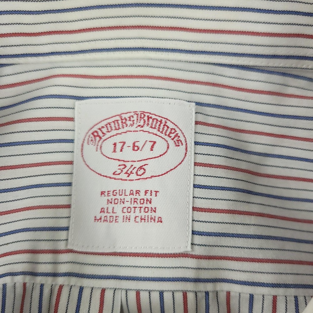 Brooks Brothers 346 Dress Shirt Mens 17 White Stripe Non Iron Cotton Brand: Brooks Brothers 346. Style: Mens long sleeve button-up dress shirt with a full button front and point collar. Color: White base with narrow vertical blue, red, and black pinstripes. Size on tag: Mens 17 Material: 100% cotton woven fabric. Made in China. Features: Regular fit silhouette with non-iron finish for easy care, single chest patch pocket, full button front placket with pearlized buttons, long sleeves with double-button barrel cuffs and sleeve plackets, back yoke with center box pleat for ease of movement, curved shirttail hem designed to be worn tucked, interior neck label with Brooks Brothers 346 branding, size, fit, fabric, and country of origin details. Measurements are included in the photos, compare measurements with your item to ensure proper fit. Items are added daily click here to Visit My Store Combined shipping for US customers is 1.99 for each additional item Items are cleaned per eBay standards & policies