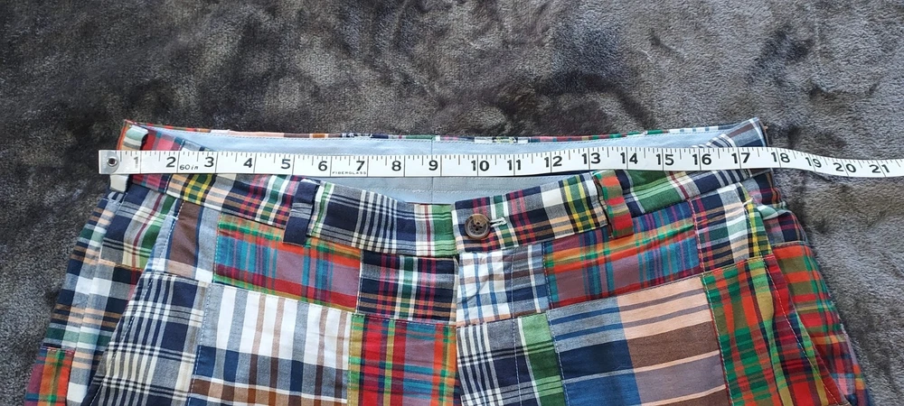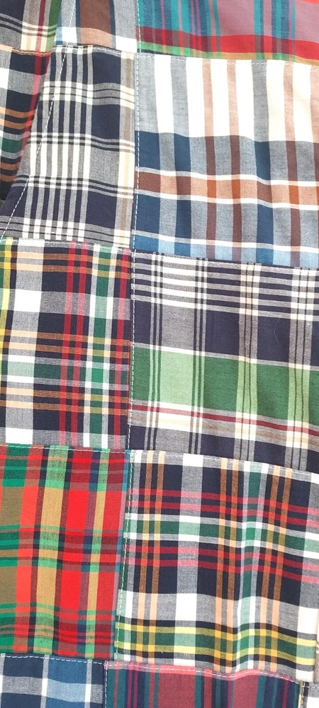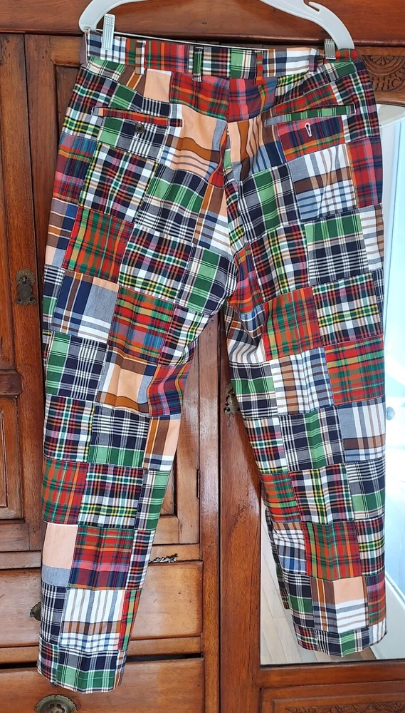 Brooks Brothers "Clark" mens pants. Madras plaid patchwork (not printed patchwork). 5 pocket. 100% cotton. Made in India. Height of preppy golf pants. Pre-owned - Very good condition. No stains, holes, or tears. See photos as added description. Size 36 inch waist x 30 inch inseam. Aprox. 10 inch rise.