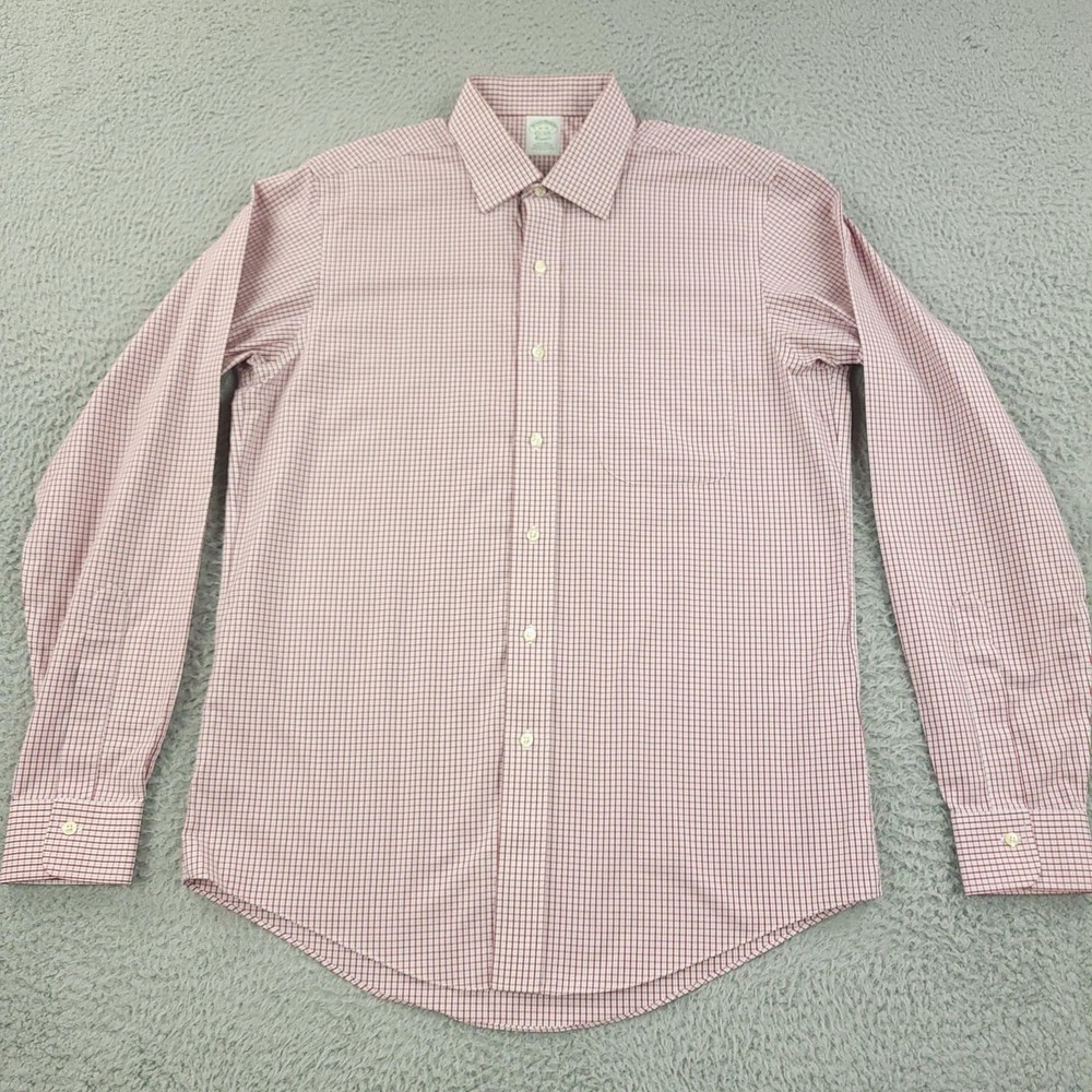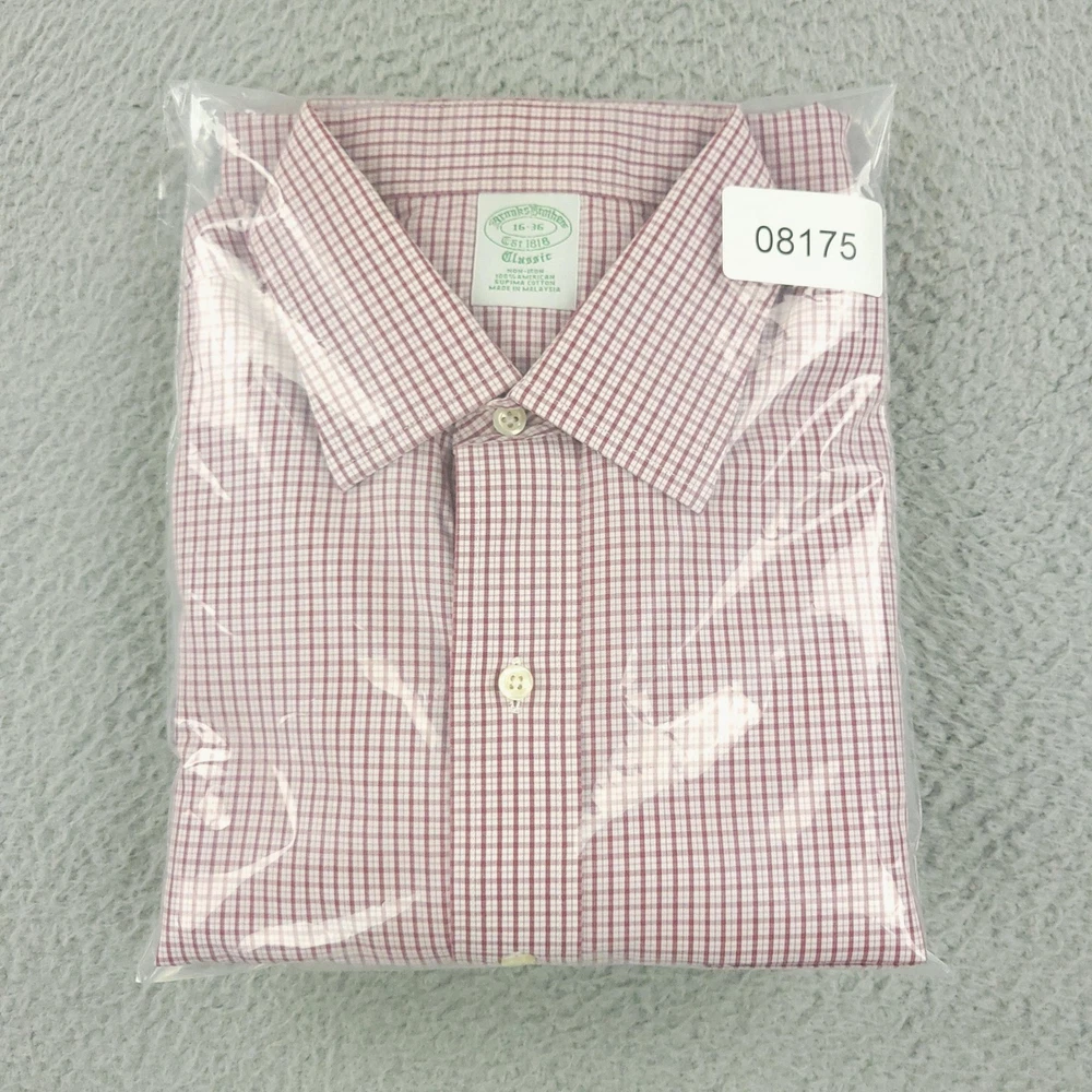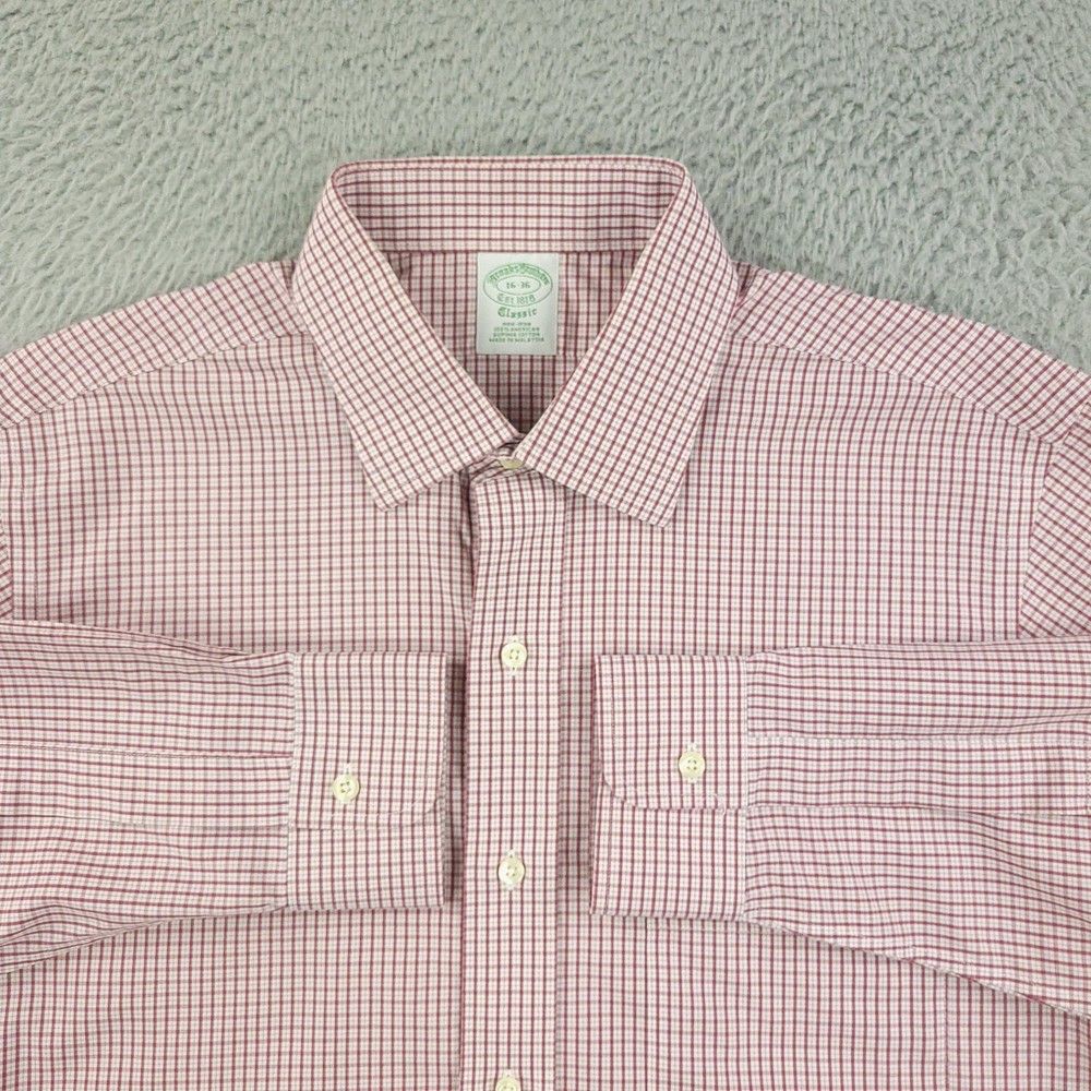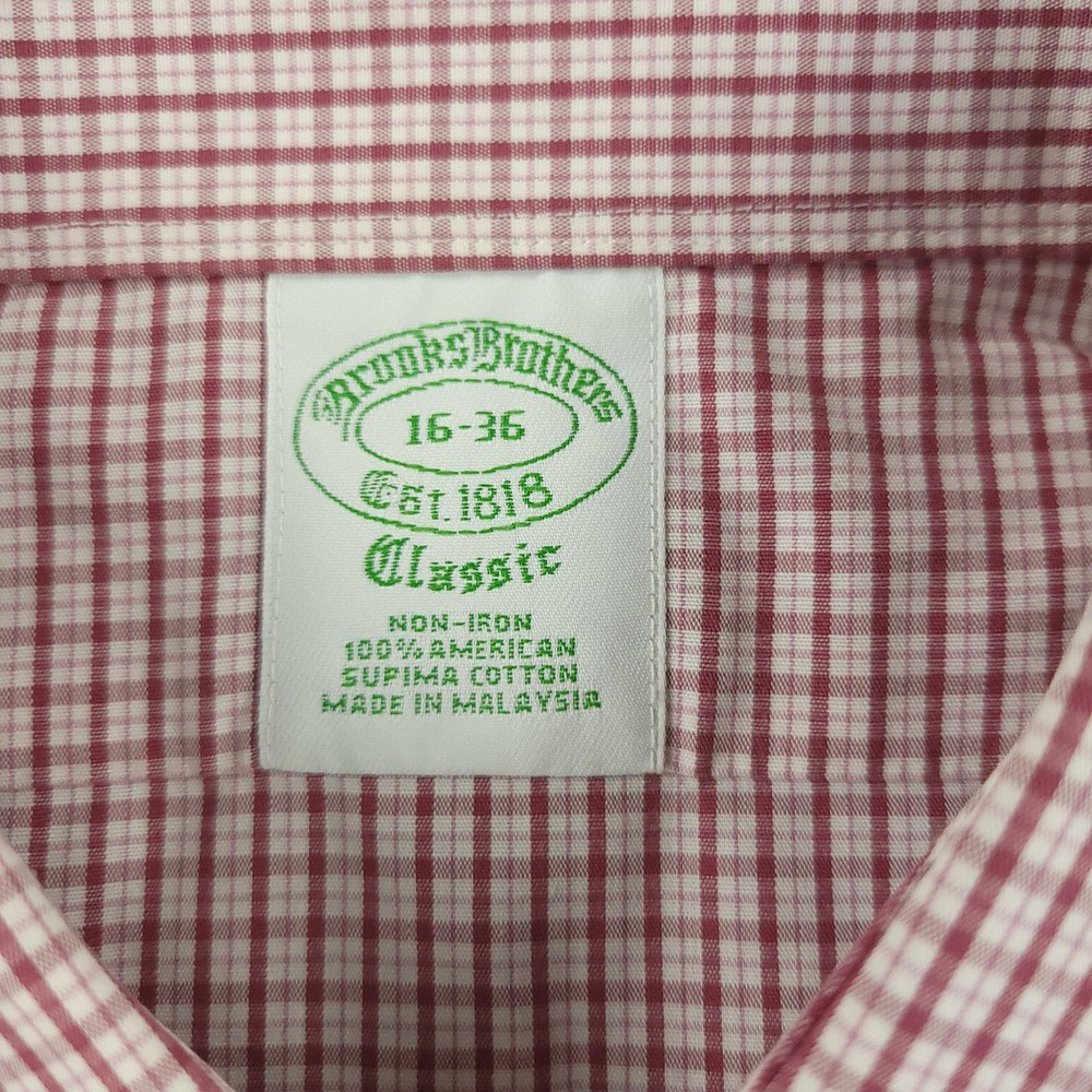 Brooks Brothers Dress Shirt Mens 16 Red Check Classic Non Iron Supima Cotton Brand: Brooks Brothers. Style: Mens long sleeve dress shirt with full button-front placket and point collar. Color: White base with red micro check pattern. Size on tag: Mens 16 Material: Non-iron 100% American Supima cotton woven fabric. Made in Malaysia. Features: Classic fit business shirt silhouette, front button closure with light-colored buttons, single chest patch pocket on left side, long sleeves with barrel cuffs and multiple button closure options, back yoke with center box pleat for ease of movement, curved shirttail hem designed to be worn tucked, interior woven neck label reading Brooks Brothers Est. 1818 Classic 16–36, printed care/content information including non-iron and 100% American Supima cotton. Measurements are included in the photos, compare measurements with your item to ensure proper fit. Items are added daily click here to Visit My Store Combined shipping for US customers is 1.99 for each additional item Items are cleaned per eBay standards & policies