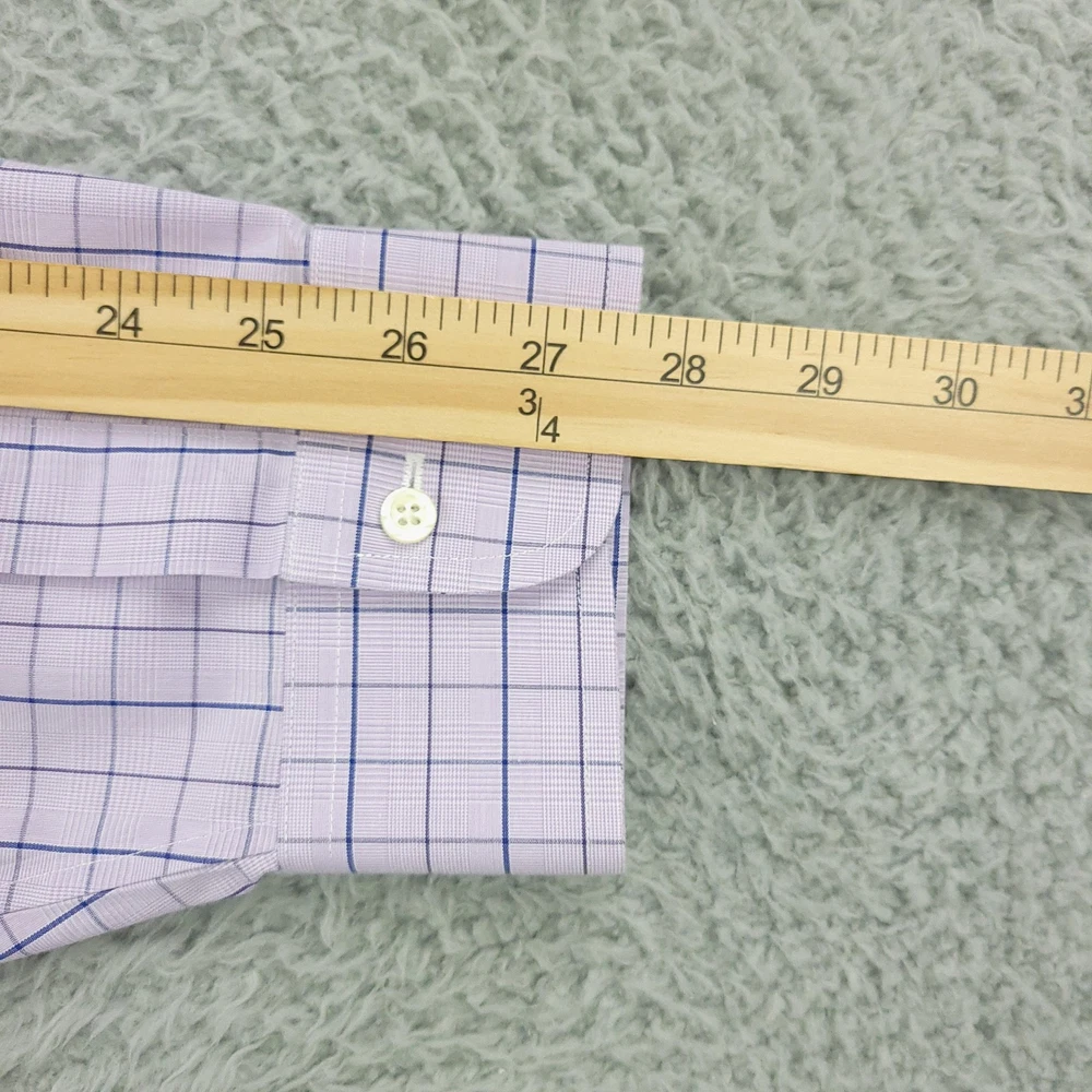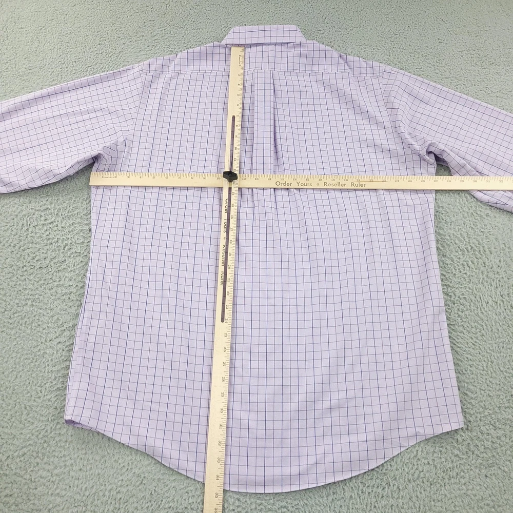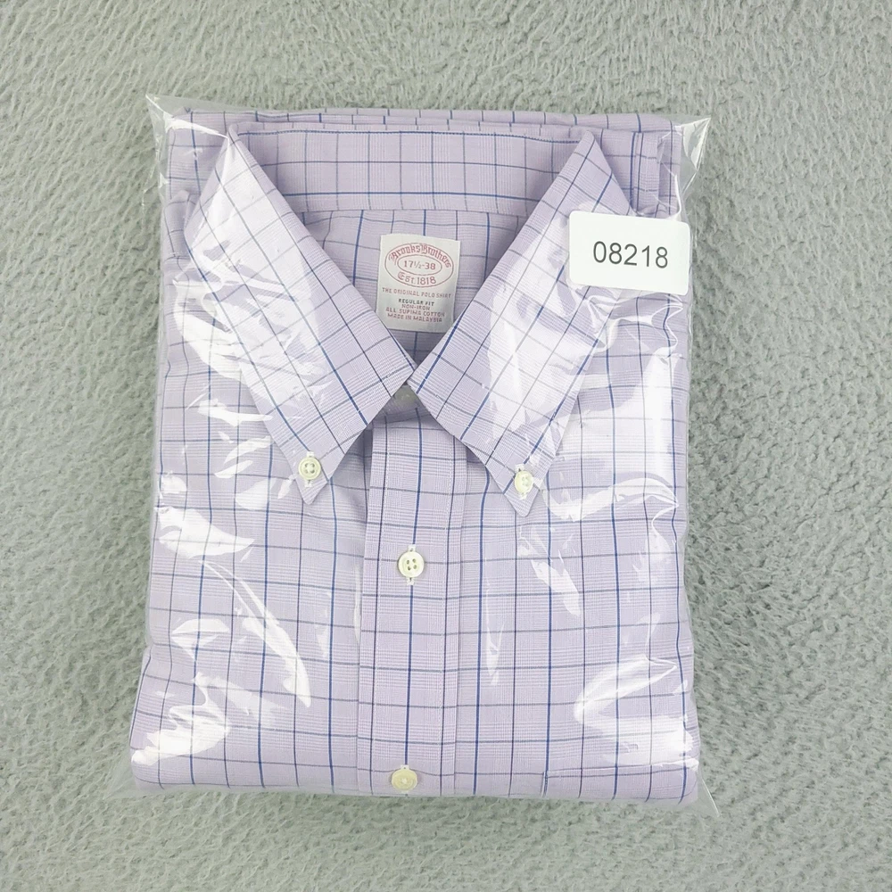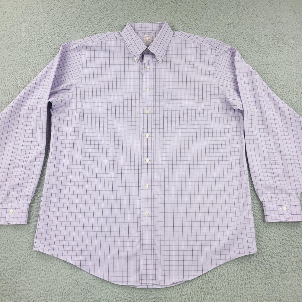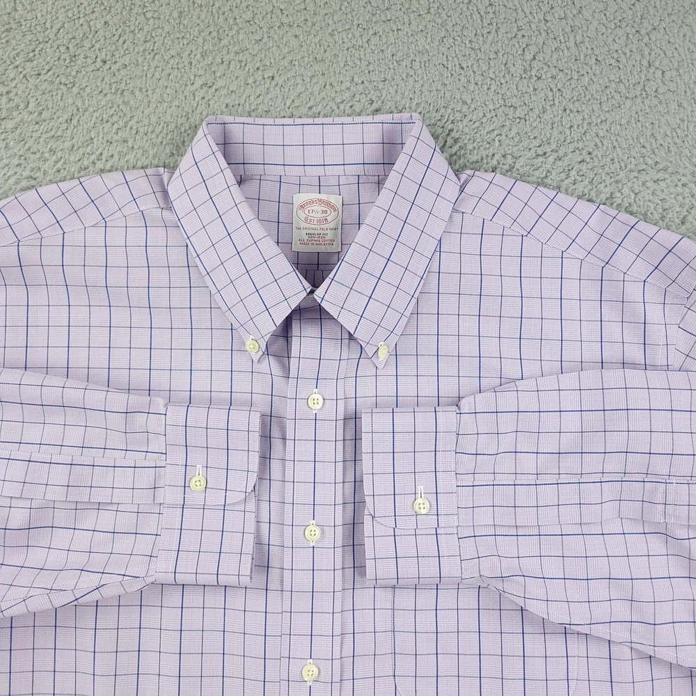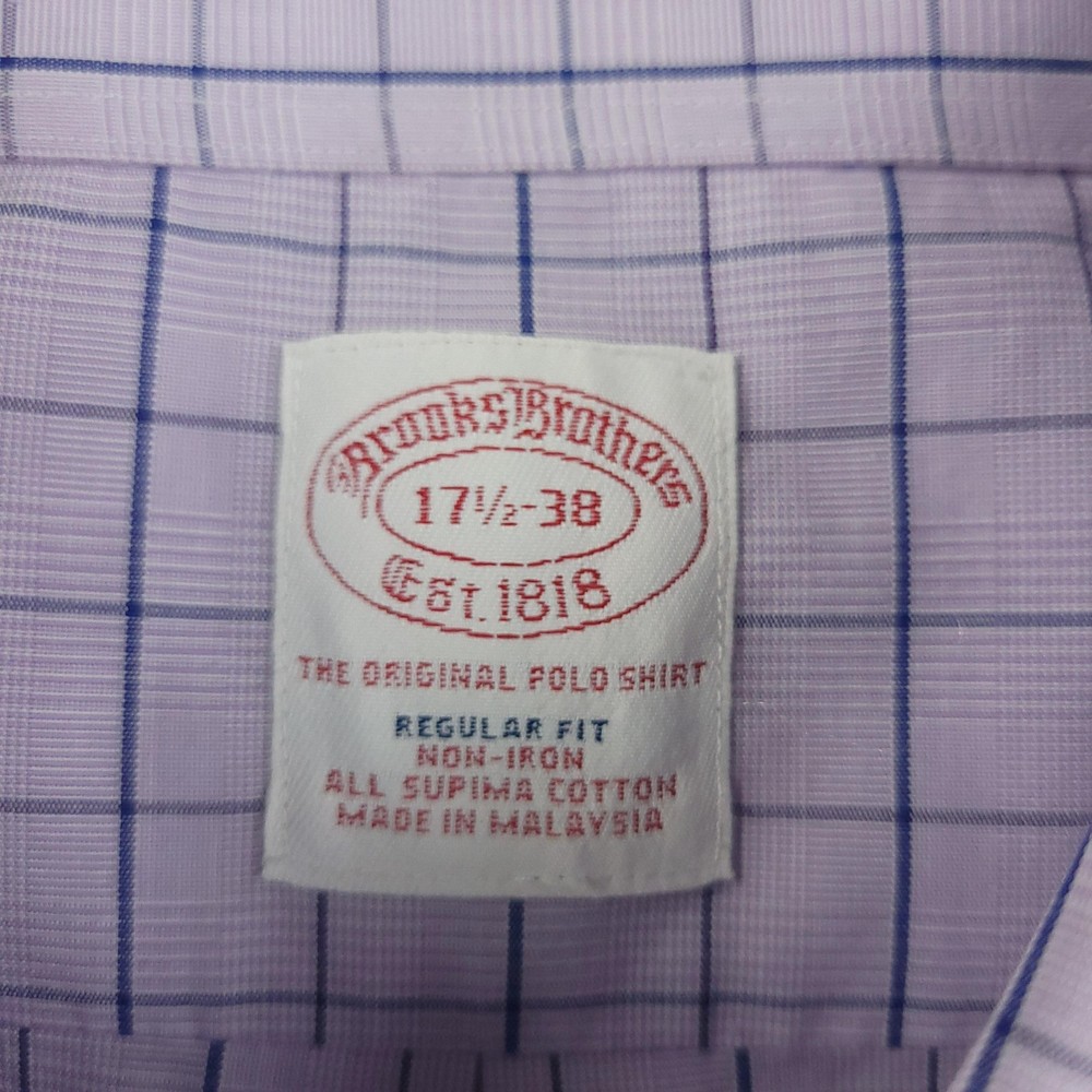 Brooks Brothers Dress Shirt Mens 17.5 Purple Check Regular Non Iron Supima Brand: Brooks Brothers. Style: Mens long sleeve button-front dress shirt in the Regular Fit with a button-down collar. Color: Light purple base with blue and lavender check pattern. Size on tag: Mens 17.5 Material: 100% Supima cotton woven fabric. Made in Malaysia. Features: Button-down point collar, full front button placket with white buttons, single left chest patch pocket, long sleeves with buttoned barrel cuffs and sleeve plackets, curved shirttail hem, back yoke with center box pleat for ease of movement, non-iron Supima cotton fabric for easy care, and interior neck label with Brooks Brothers Est. 1818 branding noting Regular Fit, All Supima Cotton, and country of origin. Measurements are included in the photos, compare measurements with your item to ensure proper fit. Items are added daily click here to Visit My Store Combined shipping for US customers is 1.99 for each additional item Items are cleaned per eBay standards & policies