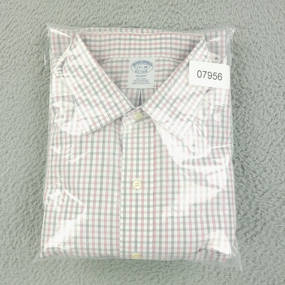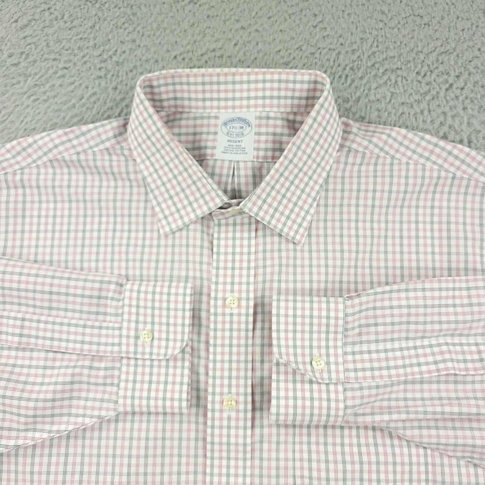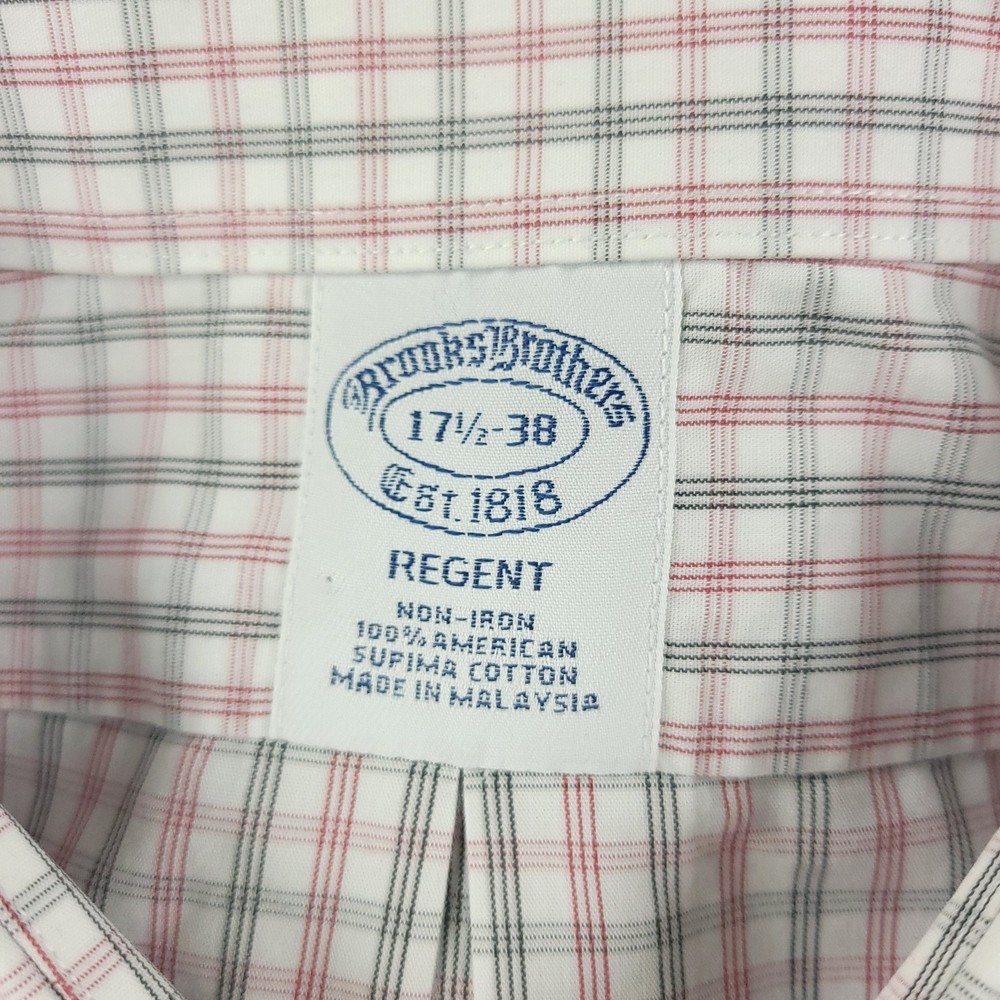 Brooks Brothers Dress Shirt Mens 17.5 White Pink Check Regent Non Iron Cotton Brand: Brooks Brothers Style: Mens long sleeve dress shirt with a full button front, point collar, and classic Regent silhouette. Color: White base with small pink and gray check pattern. Size on tag: Mens 17.5 Material: 100% American Supima cotton non-iron fabric. Made in Malaysia. Features: Wrinkle-resistant non-iron cotton for easy care, standard shirttail hem designed to be worn tucked in, long sleeves with barrel cuffs, left chest patch pocket, back yoke with box pleat for ease of movement, versatile dress shirt suitable for business, office, or smart casual wear. Measurements are included in the photos, compare measurements with your item to ensure proper fit. Items are added daily click here to Visit My Store Combined shipping for US customers is 1.99 for each additional item Items are cleaned per eBay standards & policies