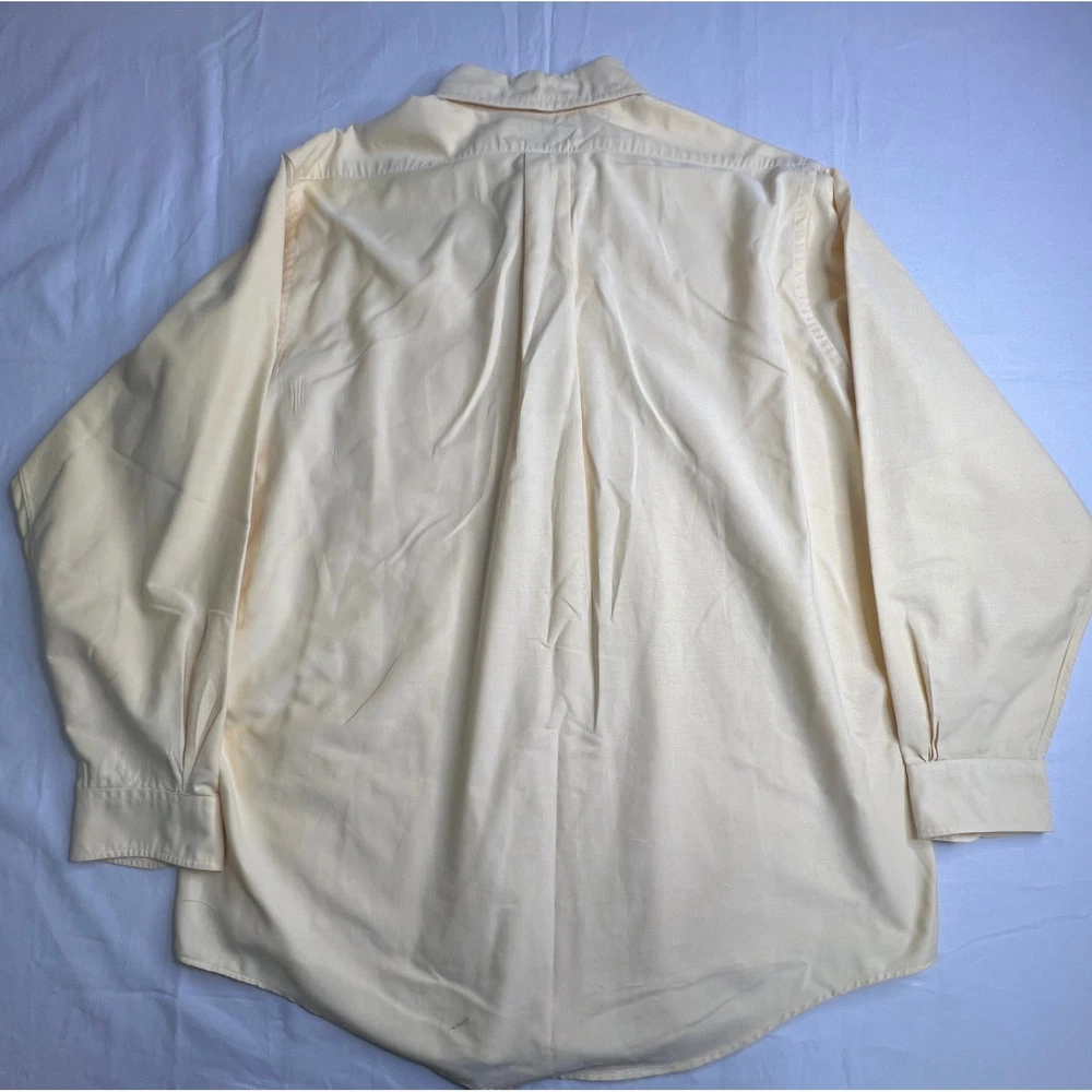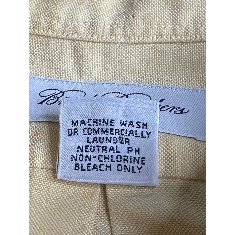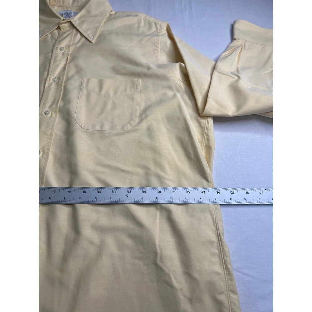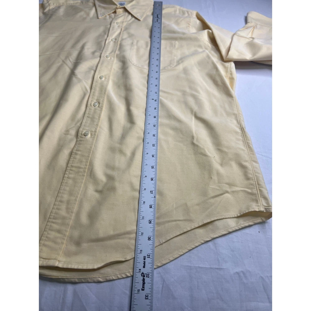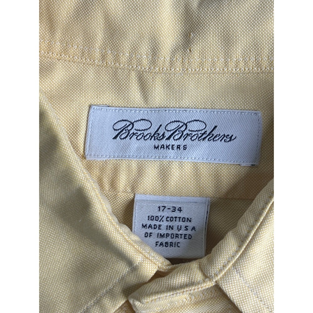 Classic sophistication defines this Brooks Brothers dress shirt, ready to elevate your wardrobe. A timeless piece, this shirt offers a clean, polished look with a single chest pocket. Perfect for business meetings, sophisticated dinners, or simply adding a touch of class to your everyday attire. Measurements: • Neck: 17 inches • Sleeve Length: 34 inches • Length: 32 inches • Pit to pit: 24 inches Department: Men Neck Size: 17 in Fit: Regular Sleeve Length: Long Sleeve Pattern: Solid Type: Dress Shirt Material: 100% Cotton, Cotton Collar Style: Button-Down Top Cuff Style: Barrel Cuff Features: Easy Care Neckline: Collared Keywords: Brooks Brothers, dress shirt, men's shirt, yellow shirt, long sleeve shirt, cotton shirt, button down shirt, business casual, office wear, menswear, classic, vintage, 17-34