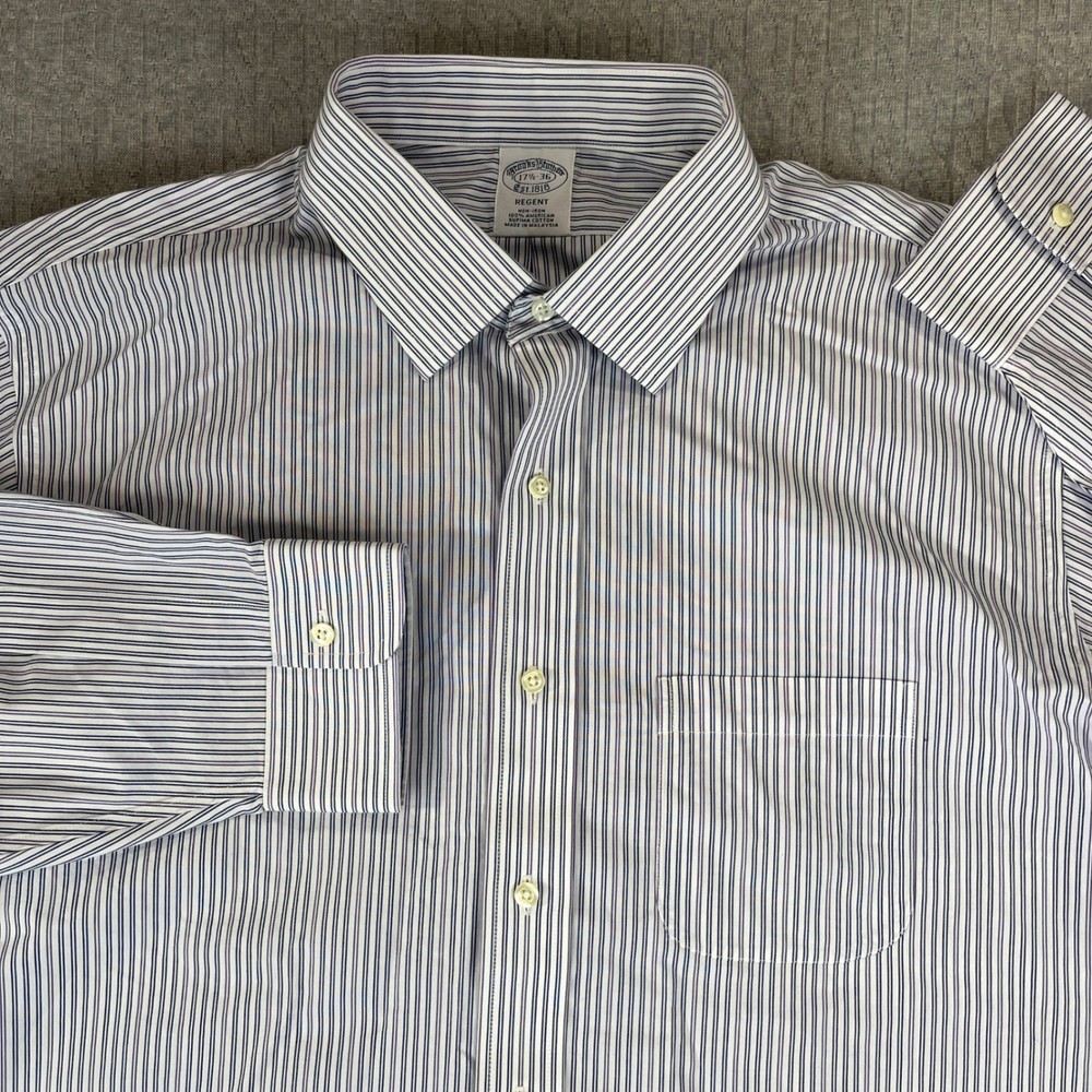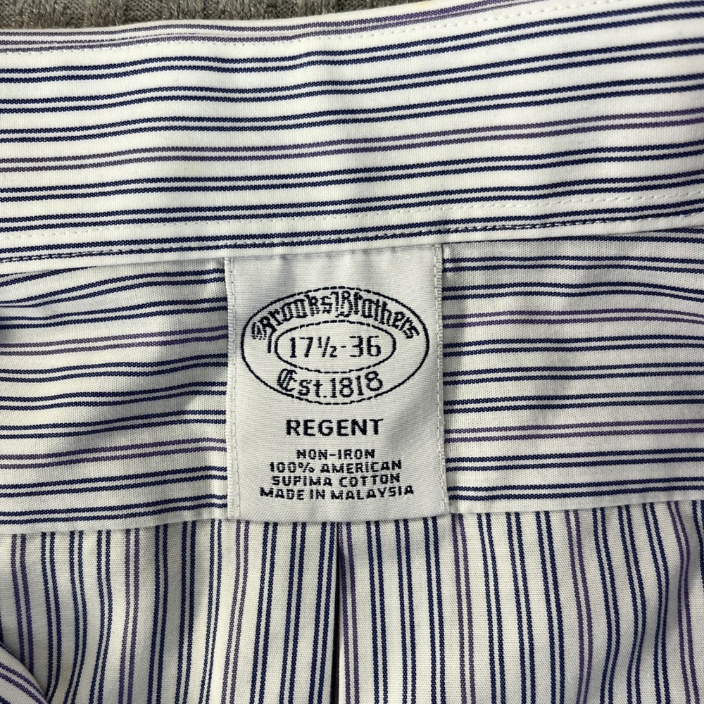 Excellent condition, please examine all photos for measurements and exact fit Department: Men Neck Size: 17.5 in Sleeve Length: Long Sleeve Pattern: Pinstripe Type: Dress Shirt Collar Style: Button-Down Material: 100% Cotton, Supima Cotton Top Cuff Style: Barrel Cuff Features: Non-Iron Neckline: Collared Keywords: Brooks Brothers dress shirt, Regent Fit shirt, Non-iron shirt, Supima Cotton shirt, Men's striped shirt, 17 1/2 neck shirt, 36 sleeve shirt, Professional shirt, Business attire, Classic menswear, Formal shirt, Button down shirt, Pinstripe shirt