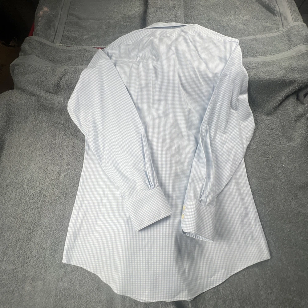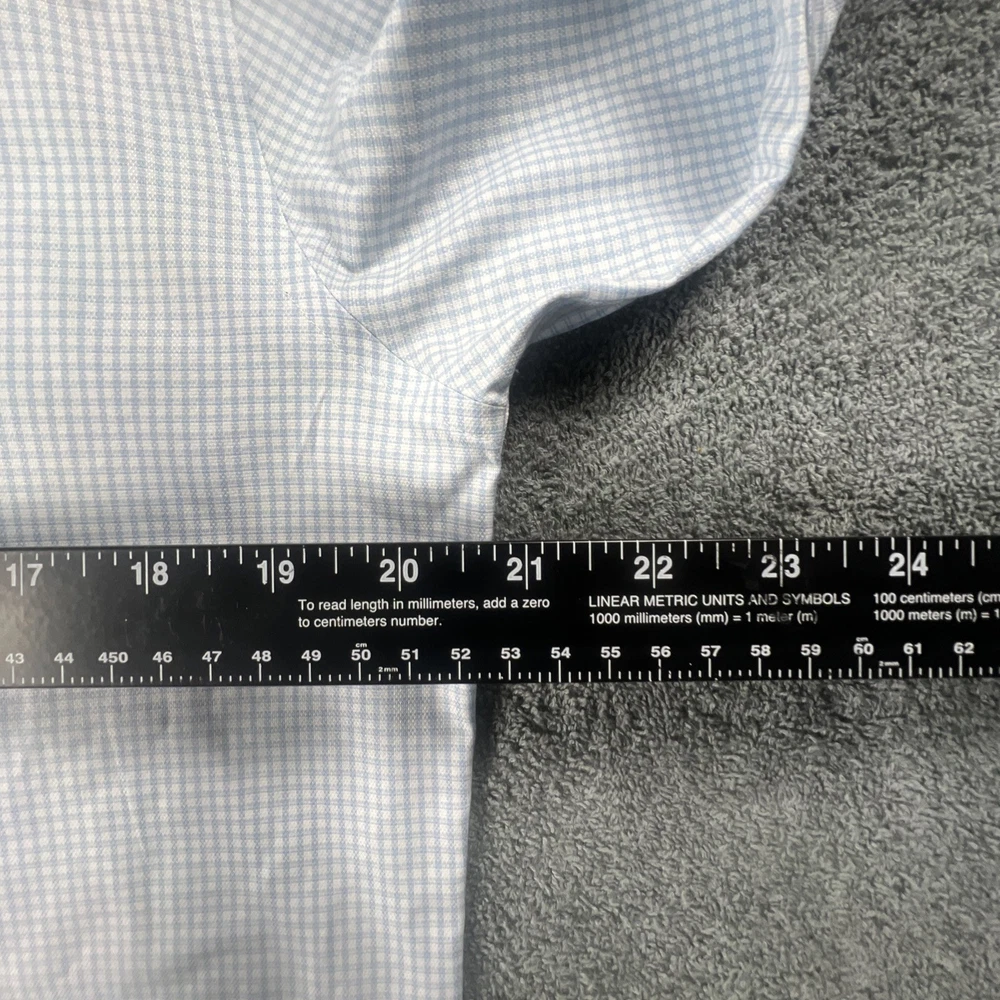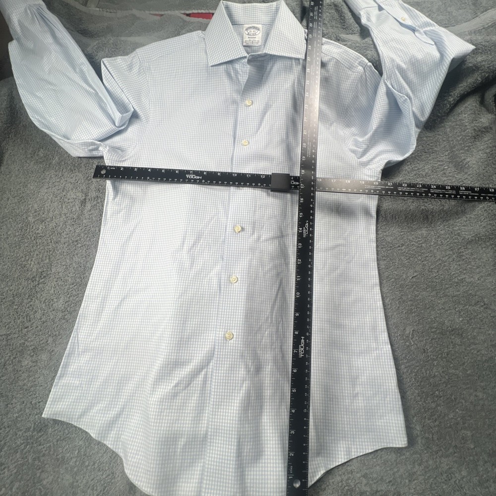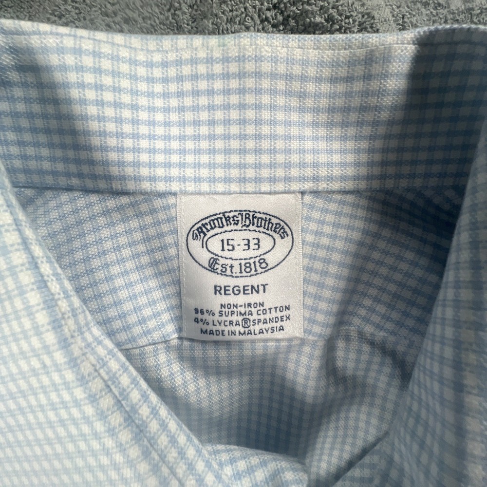 The Brooks Brothers Men's Regent Dress Shirt in size 15 with a non-iron, wrinkle-free feature is a premium quality garment made from 100% cotton Supima. This stylish shirt is perfect for any occasion, featuring a check pattern in a classic blue color. With a collared neckline, long sleeves, and a spread collar style, this regular fit shirt is easy to care for and suitable for all seasons. Perfect for the modern man looking for a sophisticated and convenient dress shirt option.