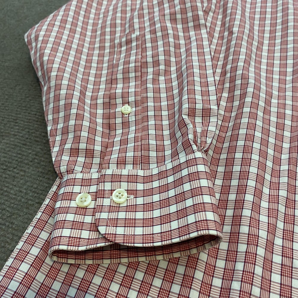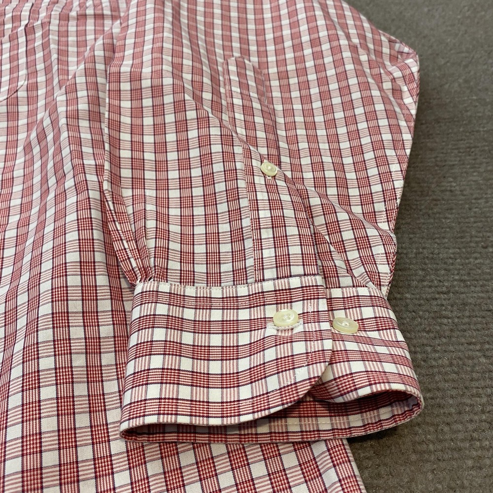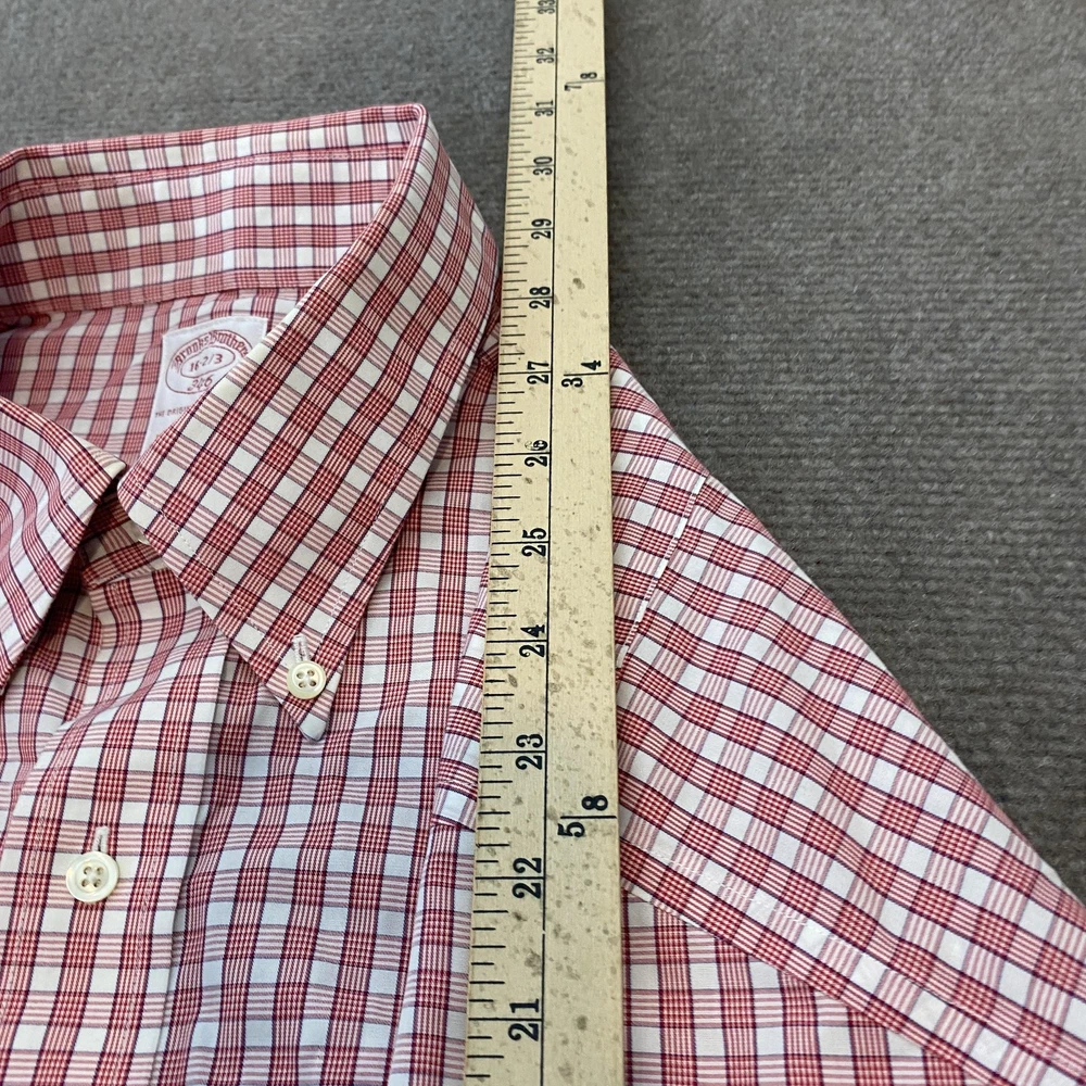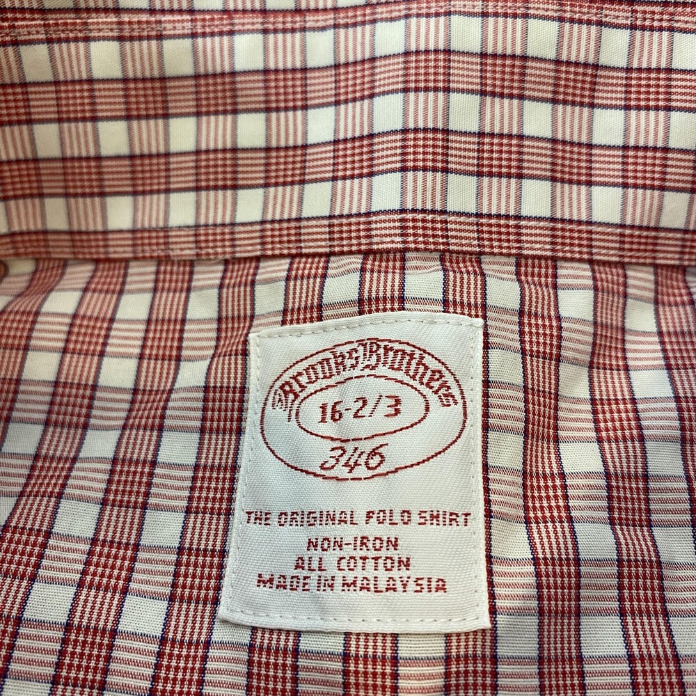 Brand: Brooks Brothers (346 line) Gently worn, no visible flaws. Buttons intact and functioning; collar and cuffs clean with no fraying observed. No stains, holes, or tears noted on inspection. Tag reads: 16-2/3 Line/Label: 346 The Original Polo Shirt Fabric: All Cotton Finish: Non-Iron Made in Malaysia (per tag) Color/Pattern: Red and white check plaid Style: Long-sleeve dress shirt with button-down collar and full button front Details: Two-button adjustable barrel cuffs; back box pleat; curved shirttail hem Notes: Classic Brooks Brothers styling suitable for office, business, or smart casual wear