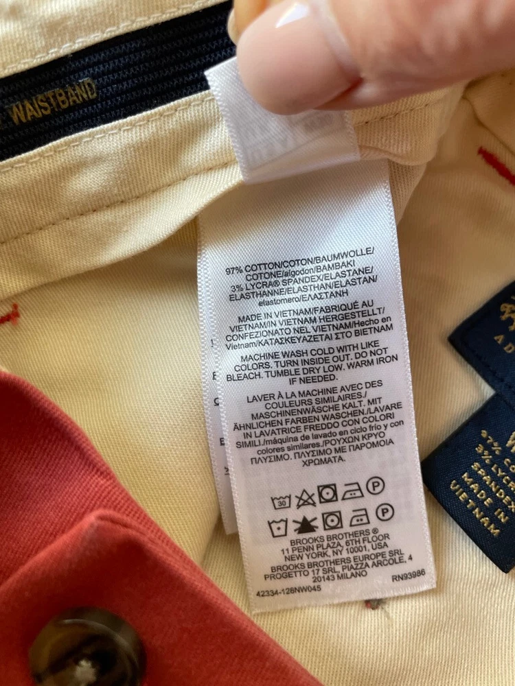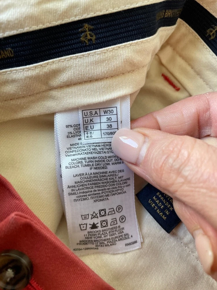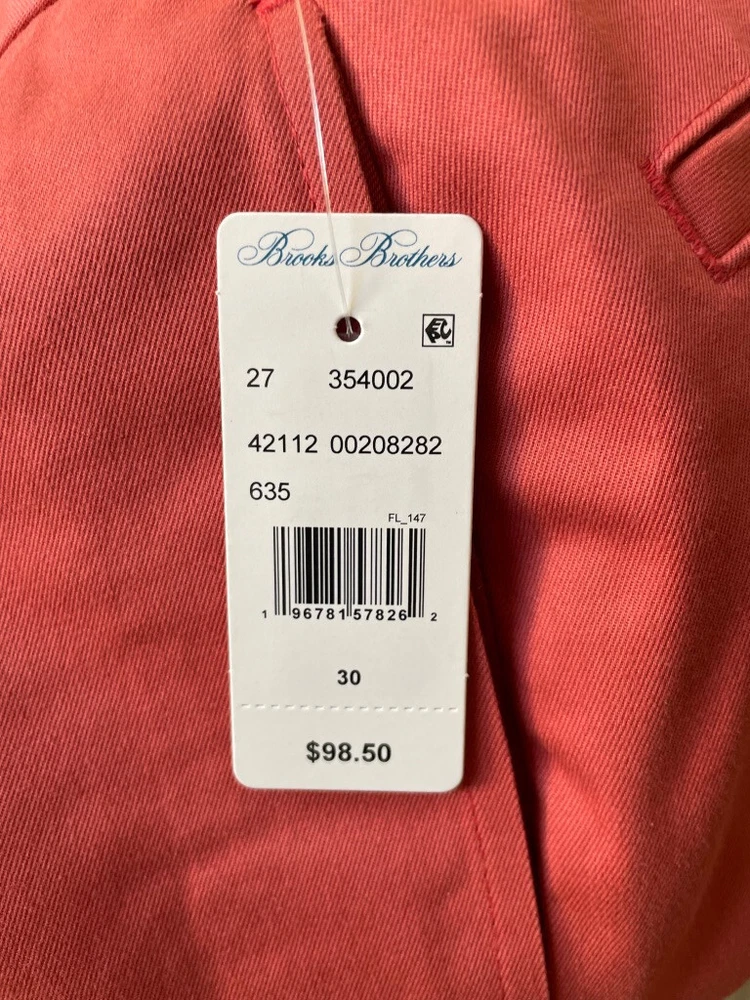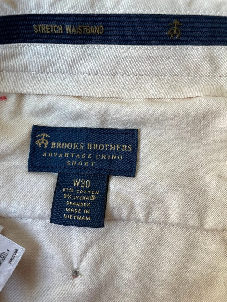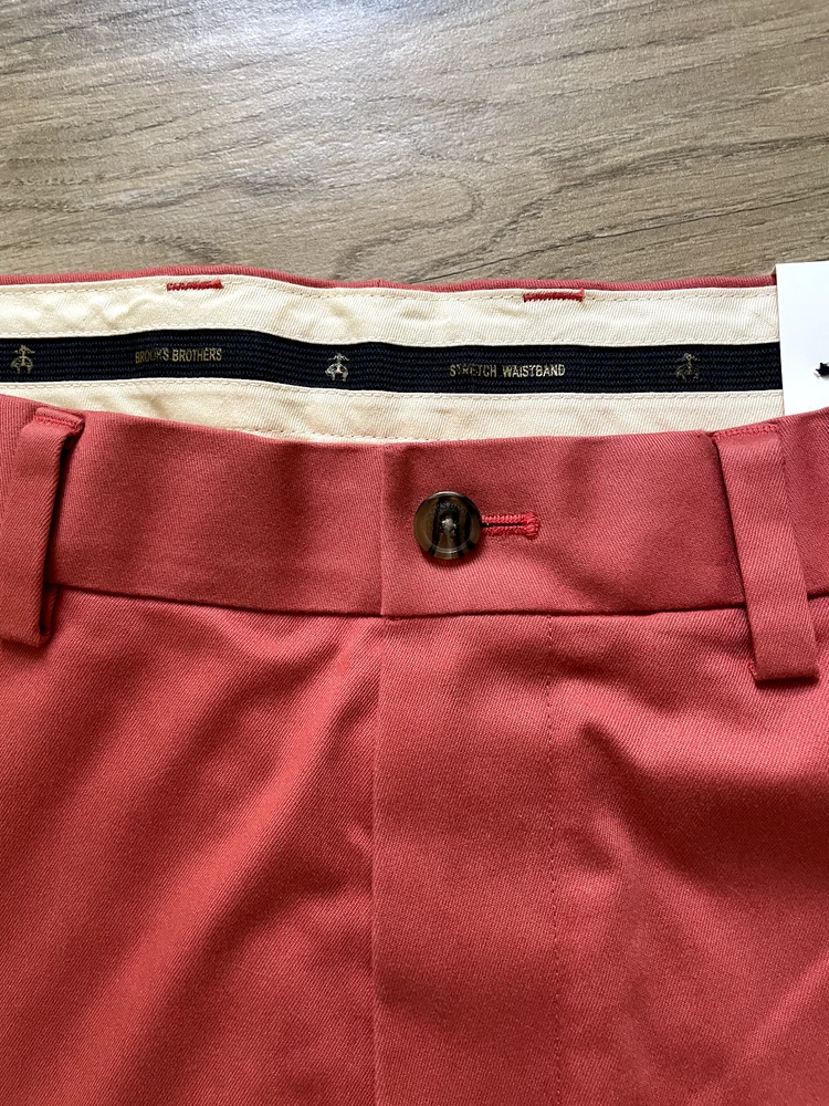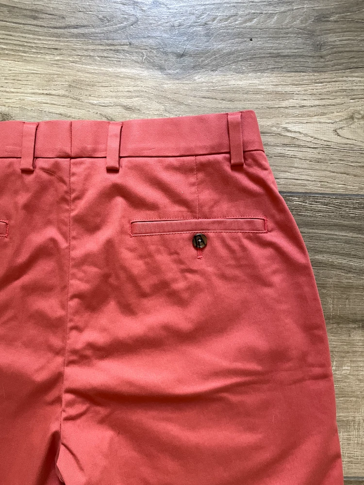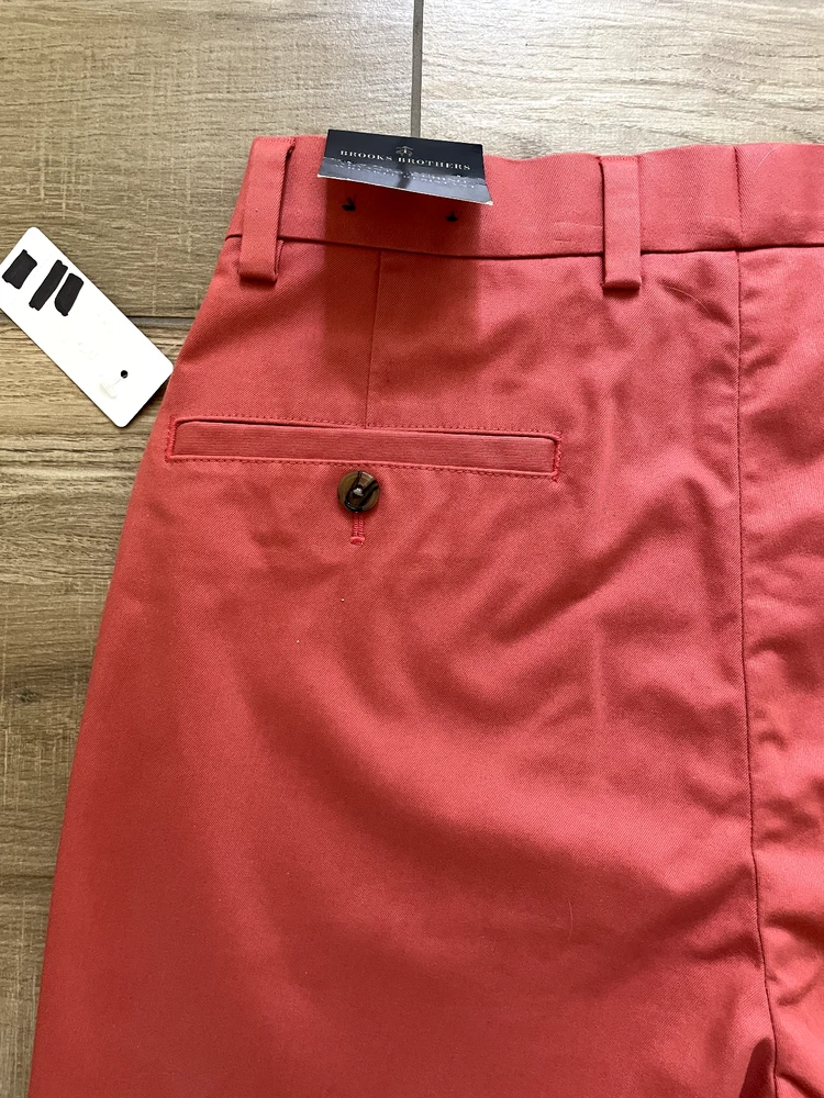 Brooks Brothers Advantage Chino Short Style: 9" Flat front classic Short Color: Dusty red pink Fabric: 97% Cotton, 3% Lycra Features: Zip & button fly, slit pockets, buttoned back pockets, flat front Approximate flat measurements: Waist 15 1/2", Rise 10 1/2", Inseam 9" Condition: New with tags, originally $98 Size: Tag size 30