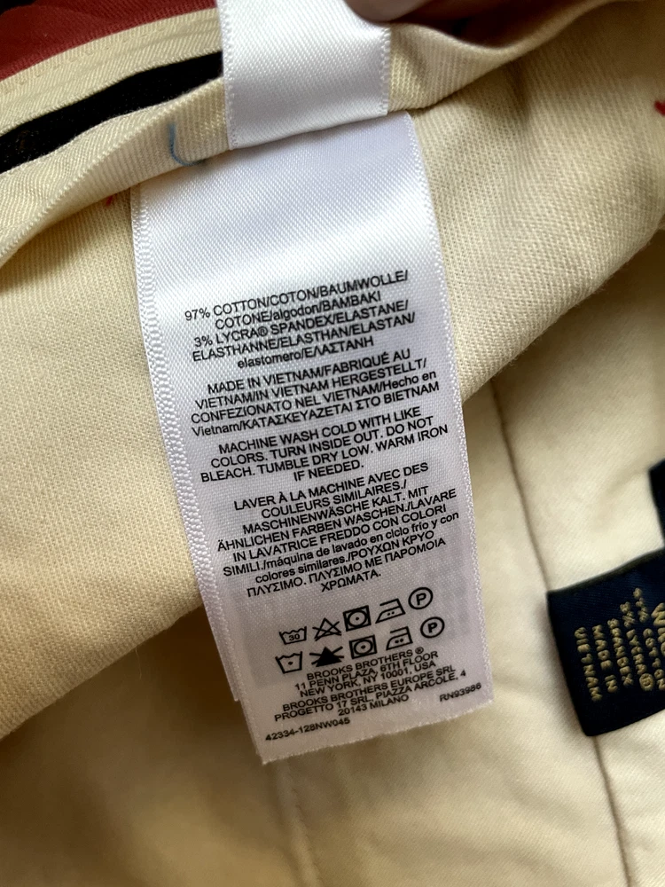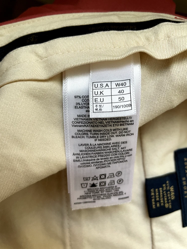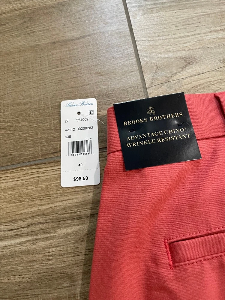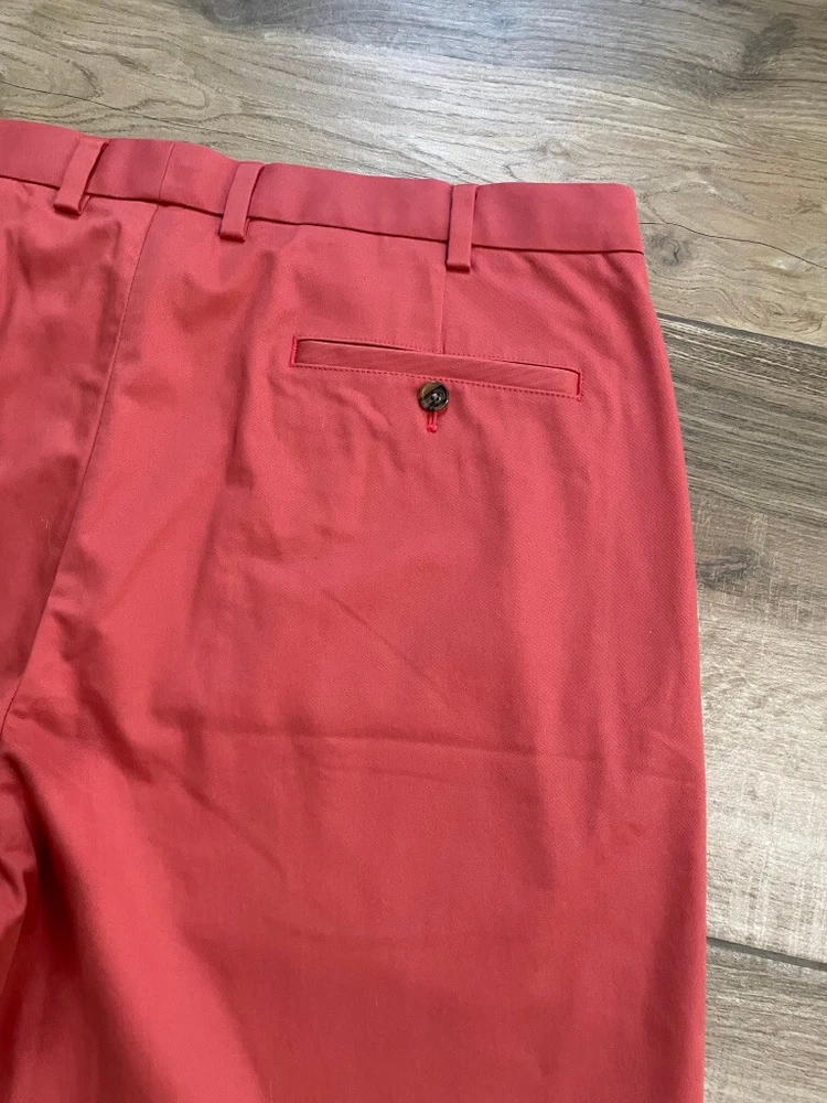 Brooks Brothers Advantage Chino Short Style: 9" Flat front classic Short Color: Dusty red pink Fabric: 97% Cotton, 3% Lycra Features: Zip & button fly, slit pockets, buttoned back pockets, flat front Approximate flat measurements: Waist 20 1/2", Rise 12 1/2", Inseam 9" Condition: New with tags, originally $98 Size: Tag size 40