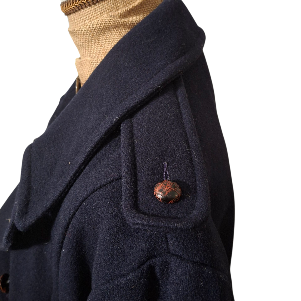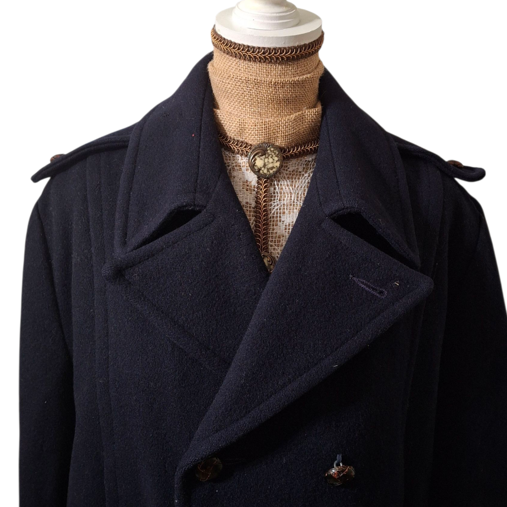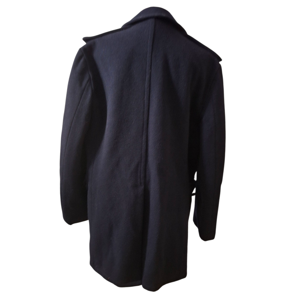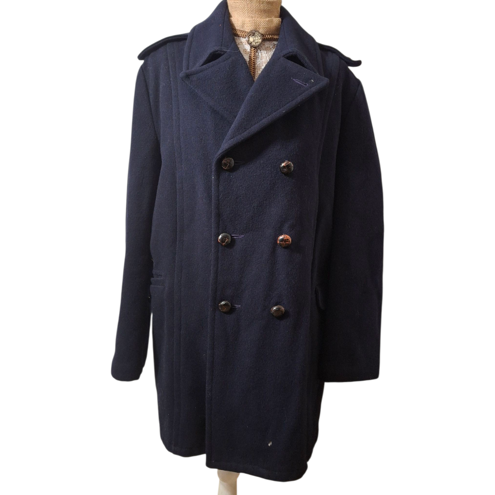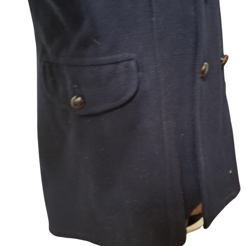 Classic and refined, this navy double-breasted coat offers timeless preppy style. Featuring structured shoulders, button-front closure, and a tailored fit, it’s designed for both warmth and sophistication. Perfect for layering over workwear or casual looks, this versatile coat is a wardrobe staple that brings polished elegance to cool-weather dressing. ** there are some small holes in the wool as pictured. One on the right lapel and one on the bottom right** shoulder to hem 34.5" sleeve length 25" Pit to pit 23.5" Classic and refined, this navy double-breasted coat offers timeless preppy style. Featuring structured shoulders, button-front closure, and a tailored fit, it’s designed for both warmth and sophistication. Perfect for layering over workwear or casual looks, this versatile coat is a wardrobe staple that brings polished elegance to cool-weather dressing.