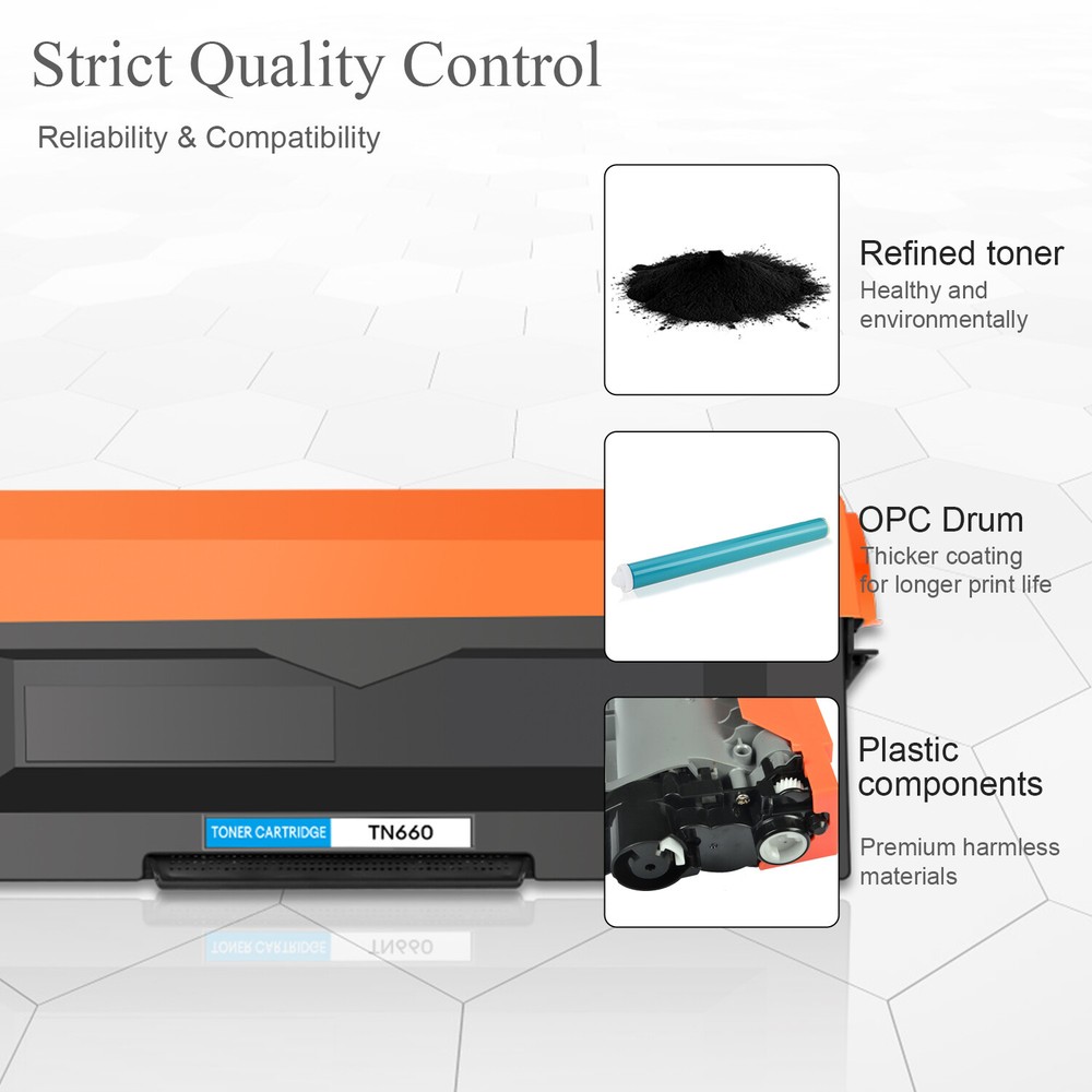 GREENCYCLE compatible TN660 toner is the replacement of the OEM model with the higher standards of quality and compatibility. We are committed to help more photographers, graphic designers, publishers set up awesome works. More details we care about ensure you experience outstanding print quality. Item Name: GREENCYCLE compatible TN660 toner cartridges replacement compatible for Brother laser printer. Model: Compatible for Brother TN660 TN-660 TN630 TN-630 Black Toner Cartridge Brand: GREENCYCLE Color: Black Page Yield: 2,600 pages per toner cartridge at 5% Coverage of letter/A4 Compatibility List: Compatible for HL-L2300D HL-L2305W HL-L2315DW HL-L2320D HL-L2340DW HL-L2360DW HL-L2380DW MFC-L2680W MFC-L2685DW MFC-L2700DW MFC-L2705DW MFC-L2707DW MFC-L2720DW MFC-L2740DW DCP-L2520DW DCP-L2540DW Printers Q Is this a compatible toner cartridge? A Yes. But its compatibility is the same as the original. Q Is this product compatible for Brother printer? A Yes, it is compatible for Brother HL-L2300D HL-L2305W HL-L2315DW HL-L2320D HL-L2340DW HL-L2360DW HL-L2380DW MFC-L2680W MFC-L2685DW MFC-L2700DW MFC-L2705DW MFC-L2707DW MFC-L2720DW MFC-L2740DW DCP-L2520DW DCP-L2540DW Printers Superior Quality Each of the toner cartridge has been ensured full working condition and a superior print quality. Consistent Printing Our higher quality photo conductor drum provides clear and smooth printouts. Stable print quality keeps you away from lines, spots and leakage. Multi-layer Sealed Packaging Our products come in multi-layer sealed shock-proof packaging. This multi-layer packaging ensures that the product can be stored better and longer. Same Compatibility as OEM GREENCYCLE toners' compatibility is the same as OEM. It is suitable with all models of printers that are written in the list of compatible printer.