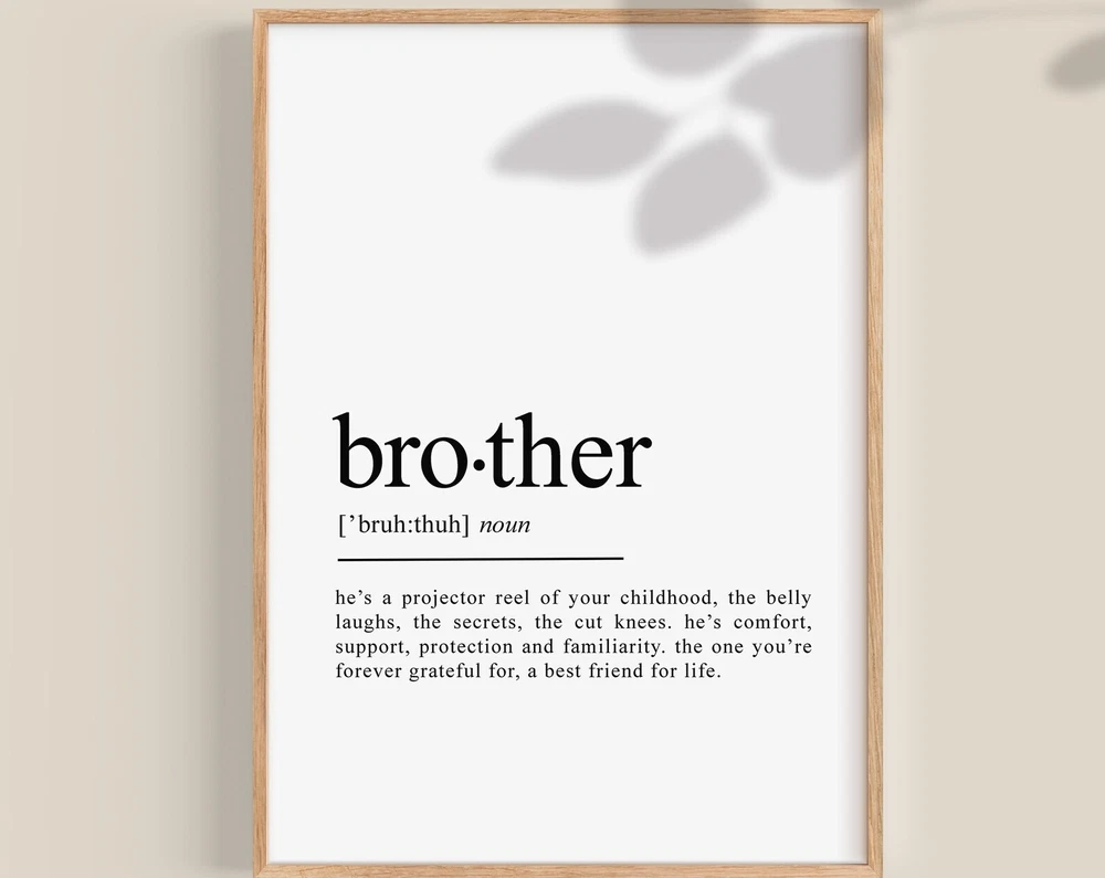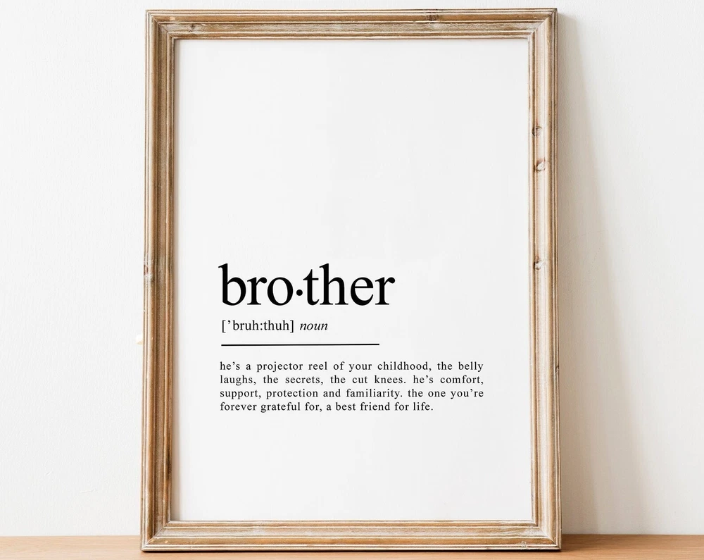 Brother Gift Definition Print Gifts For Brother Little Brother Special Big Brother Gift Wall Art Art Print Material: Premium luster photo paper Print type: Inkjet printing One side printed + The finish provides the highest possible resolution and color saturation + Lasts up to 200 years in color and 400 years in black-and-white + Printed on high-quality resin-coated photo base paper medium + Posters can be hung with double-sided tape, tacks, or framed + Hand washing with a gentle cry cloth is recommended for extended durability I will hand select the best choice of paper for your chosen design to ensure top quality results for a beautiful, bright and luxurious print. All prints are sealed in cellophane slips for protection during transportation, and are shipped in a protective cardboard envelope.