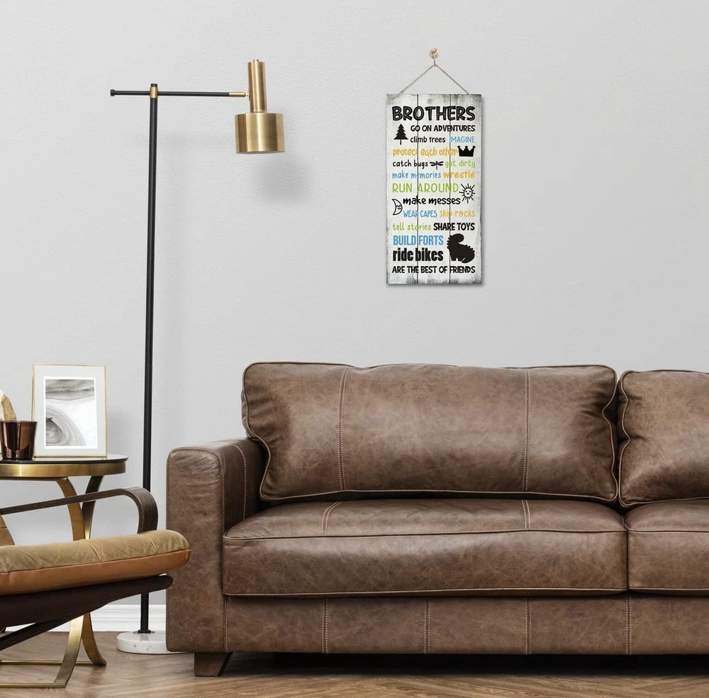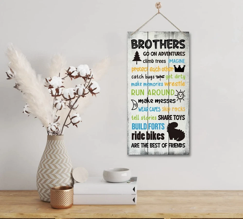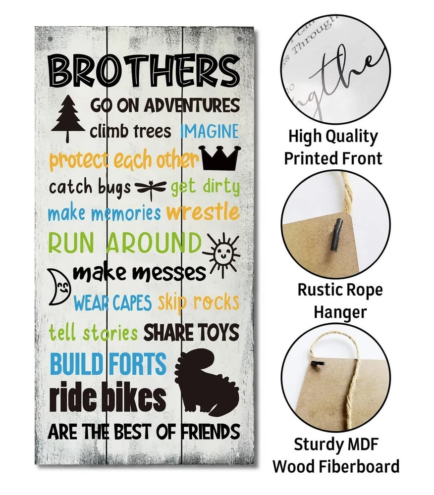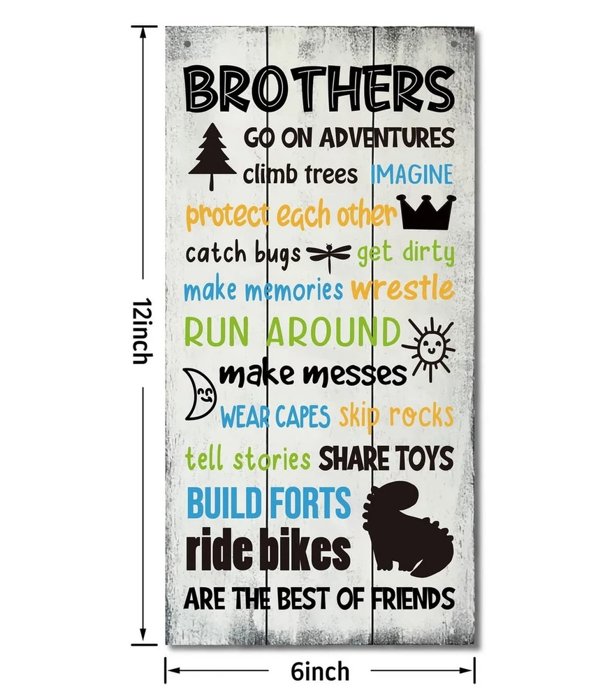 Brothers Rules Home Signs Decor, Go On Adventures, Hanging Wood Sign Home Décor, Boys Room Wood decor, Rustic Wood Plaques Wall Art, Sons Bedroom Decoration, Playroom Sign For Boys Product Details Color: Kids Rules 02 Brand: Gkwa Material: Engineered Wood, Wood Theme: Words & Quotes Recommended Uses For Product: Property Mounting Type: Wall Mount Product Dimensions: 6"L x 12"W Shape: Rectangular Style: Rustic Pre-printed: Brothers Rules Item Thickness: 0.12 Inches Item Weight: 3.52 ounces Manufacturer: Gkwa Country of Origin: China Item model number: M124 Size is: 12 x 6 x 0.12 inch; (30 x 15 x 0.3 cm) Material: Made of high-quality MDF high-density board material, UV printing, the product itself is strong, no peculiar smell, not easy to fade and crack, very durable, not easy to damage. EASY TO INSTALL: The hang tag comes with an eye-catching, convenient and simple twine hang tag that allows you to quickly and easily mount it on the wall and hang it anywhere in your home you want it to appear PREMIUM QUALITY: These wooden signs are durable and well-made, suitable for indoor use to give your house a chic look; of course, they can also be used outdoors, provided they are not placed in areas prone to moisture. GREAT GIFT IDEA: The beautiful hanging tags are great gifts for outdoor or indoor decoration, great decorations for walls, doors or fireplaces, great gifts or perfect decorations for friends Size: 12 x 6 x 0.12 inches; (30 x 15 x 0.3 cm) Material: Made of high quality MDF wood material; This is for your family or friends to find a beautiful gift with unique design, it is suitable for your family birthday, Christmas, Thanksgiving, Mother's Day, Father's Day, New Year's Day and more.