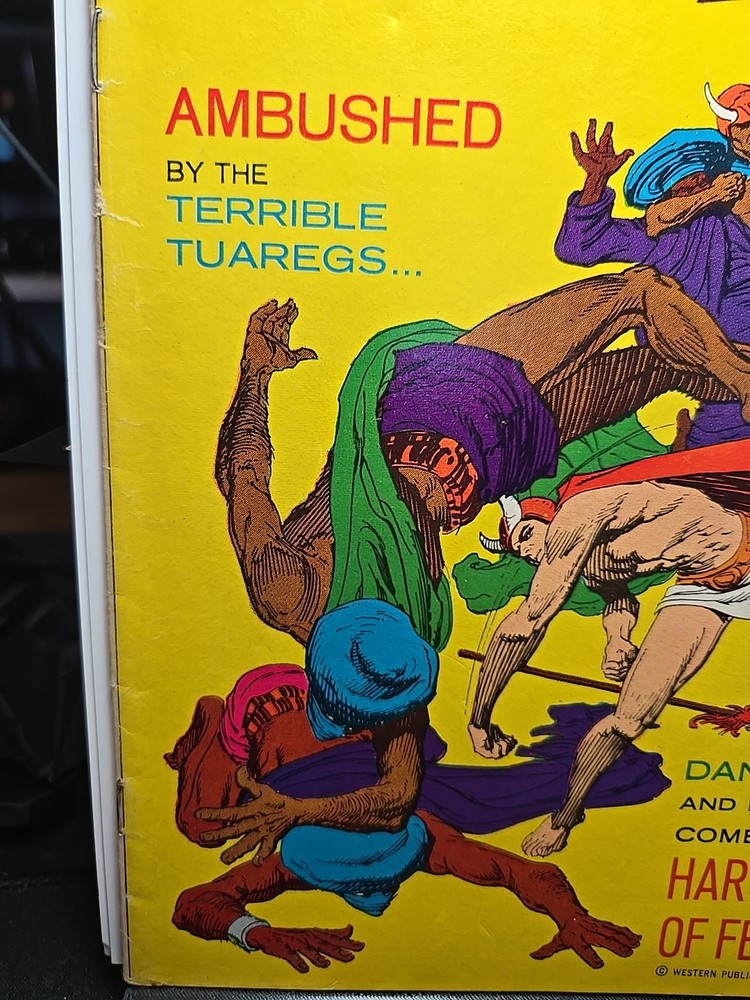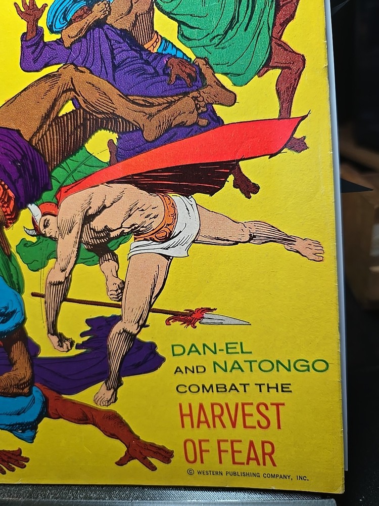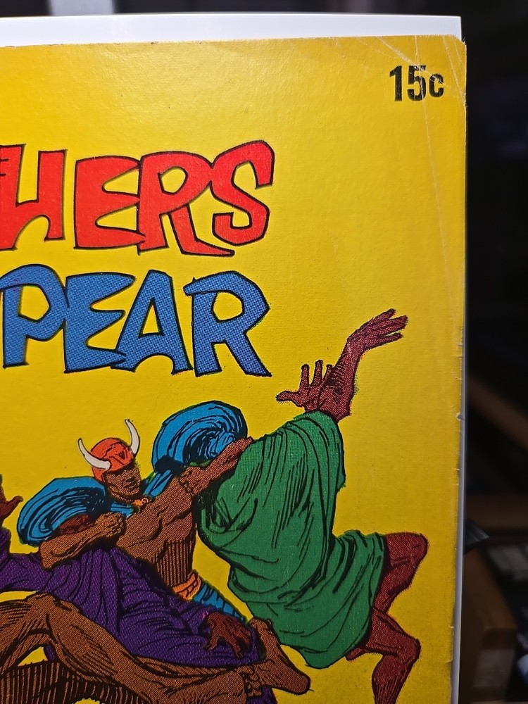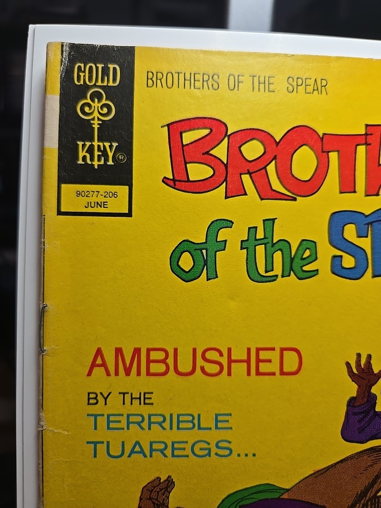 4.5-5.5, spine issues and rusty bottom staple, otherwise great comic. The product is a comic book titled "Brothers of the Spear #1" with a 15-cent cover from June 1972. Featuring artwork by Russ Manning, Jesse Santos, and Jerry O'hara, the story follows characters such as Gutha, Alissa (Muel), Hatima (Mule), and members of the Tuareg Raiders, SET, and Tavane tribes. The adventure and jungle genre comic was published by Western and falls under the Bronze Age era of US Comics. With a mix of English language and a focus on the characters' experiences, this comic book offers a glimpse into a unique world filled with action and intrigue.