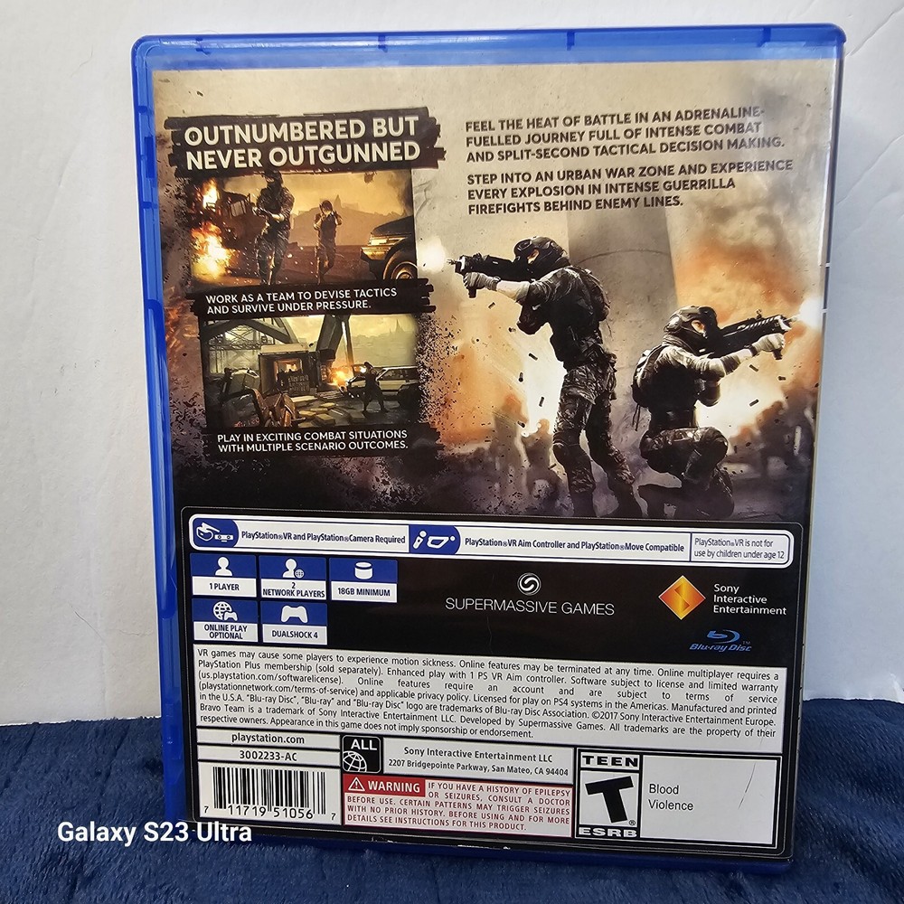 This is a PS4 VR game that requires PlayStation VR and PlayStation Camera. 2 network player, online play optional. PlayStation VR Aim Controller and PlayStation move compatible. TESTED/WORKS Game and case in perfect condition. The product is "Brovo Team: VR" for Sony PlayStation 4, released in 2017. Published by Sony PlayStation, this game falls under the genre of Shooter and Action & Adventure. The game is designed for virtual reality gameplay, offering an immersive experience on the PlayStation VR platform. With an M rating, players can expect intense action and adventure in a virtual reality setting. Made in the United States, "Brovo Team: VR" brings a unique gaming experience to players on the PlayStation 4 console.