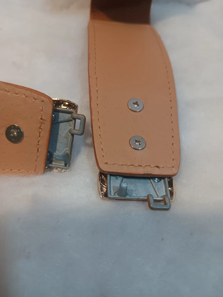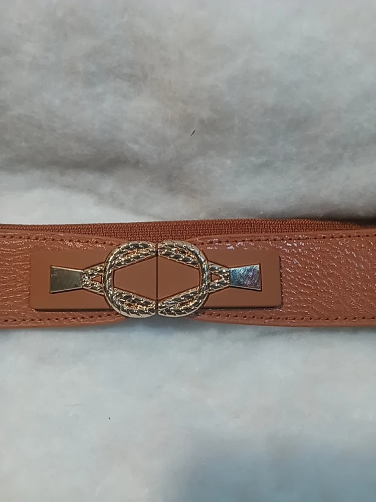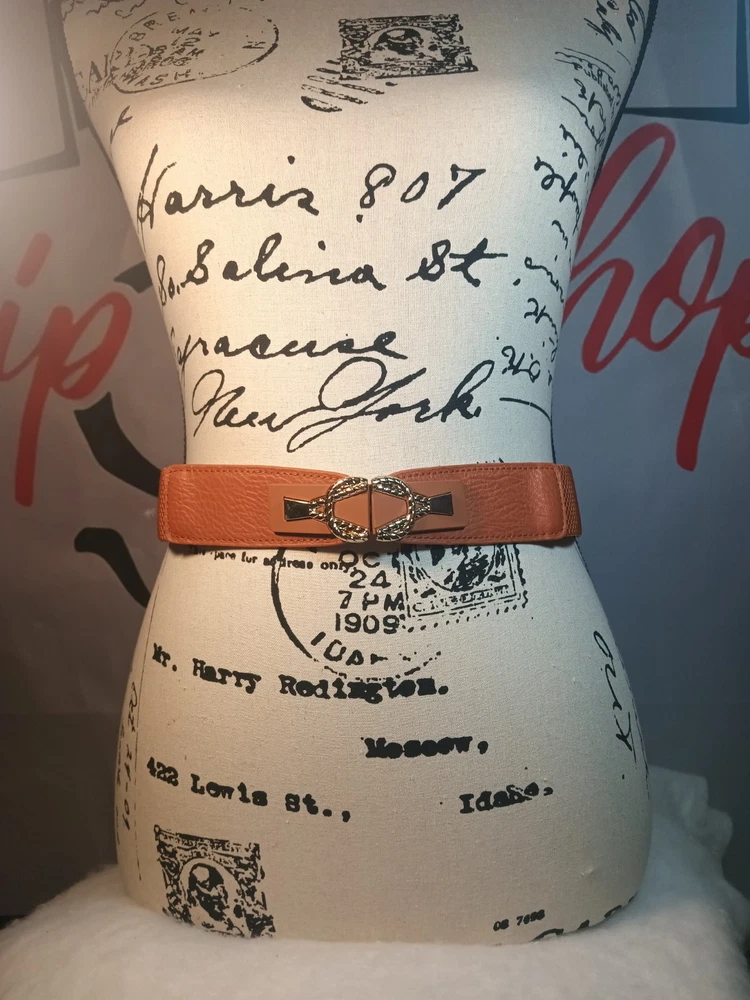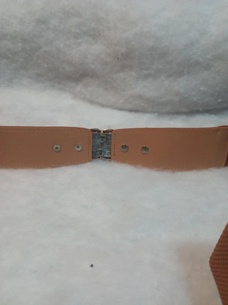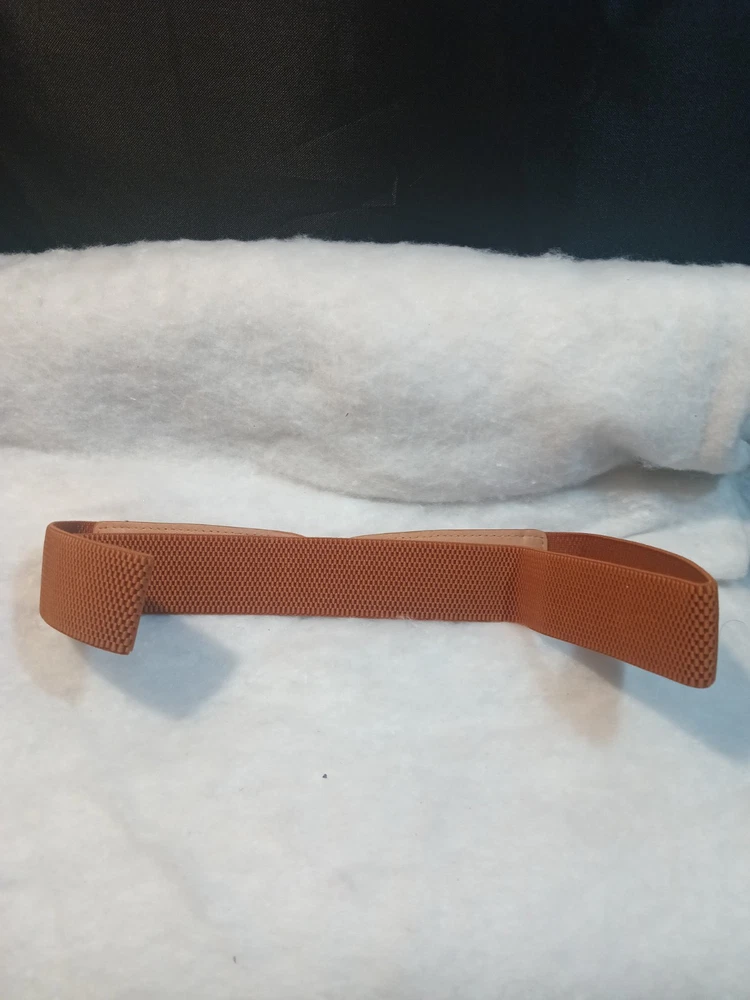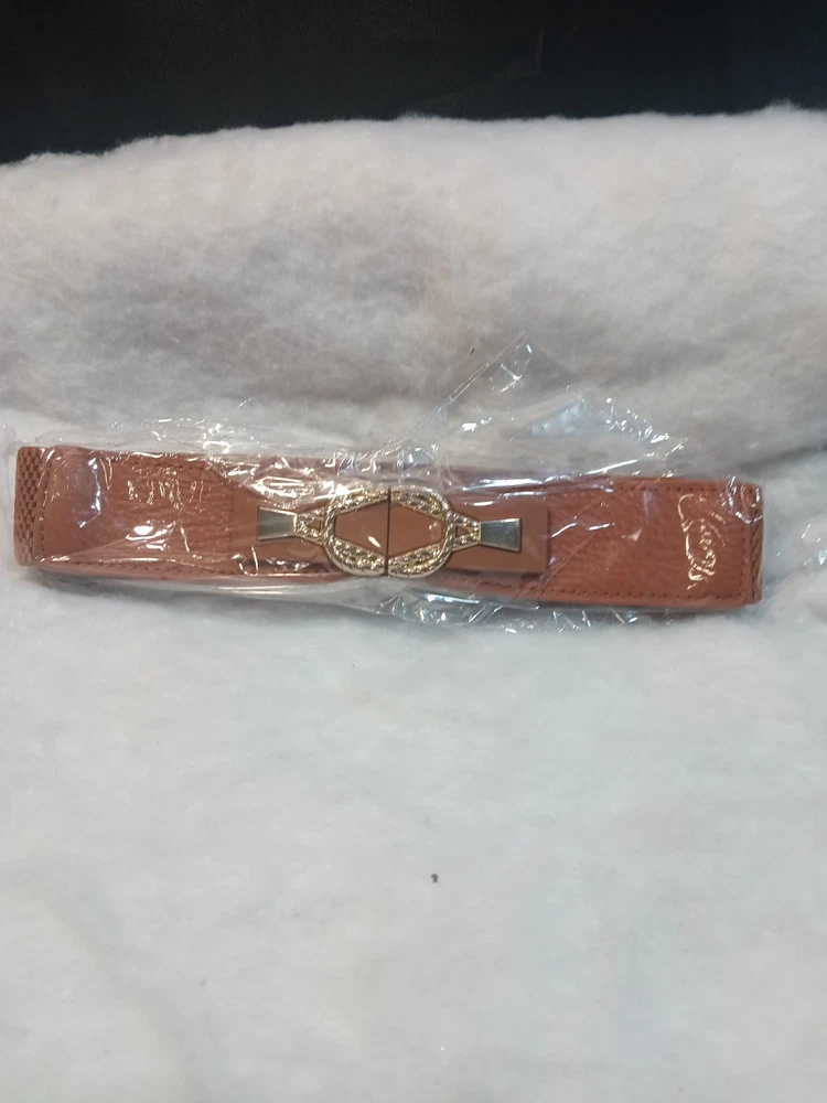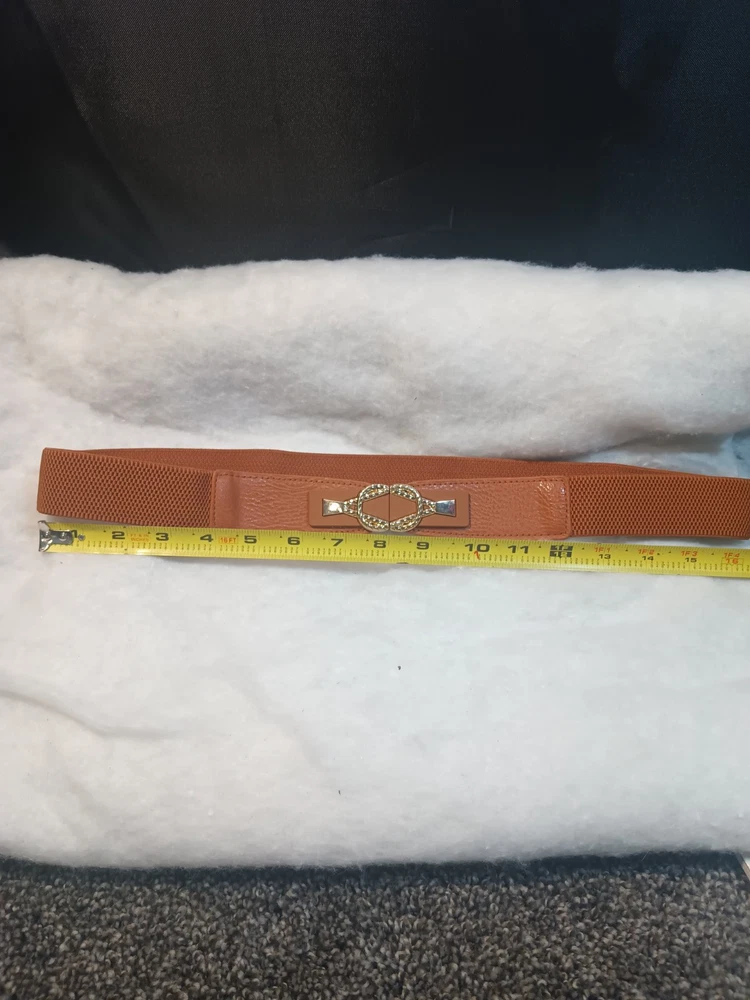 Add some style to your top or dress with this belt. elastic is 1 1/2" wide, faux leather 4". Gold tone establishment
