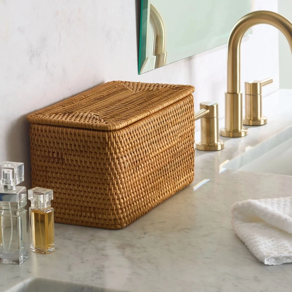 Introducing thattan Organizer Basket with Lid – your chic storage fix! This durable basket is great for tidying up bits and bobs, holding extra toilet paper, or jazzing up any room. Flexible and easy to fit anywhere, whether it's your bathroom, bedroom, or beyond. With its intricate rattan design, it's both stylish and useful. And guess what? It comes with a lid, so you can stash your stuff discreetly and use it as a decor piece. Upgrade your organization game with this classic and handy rattan basket fr Rattan Organizer Basket with Lid Beautiful Honey Color Perfect for bathroom, pantry, and decorative storage Dimensions: 6"W x 6"H x 11" Deep