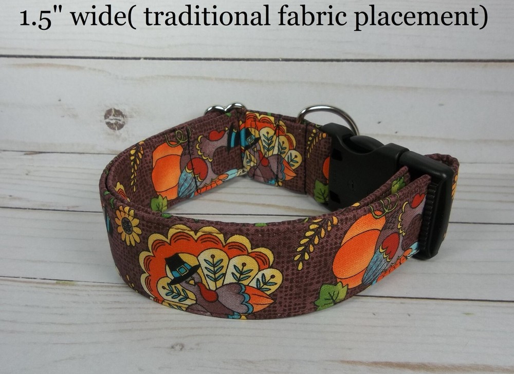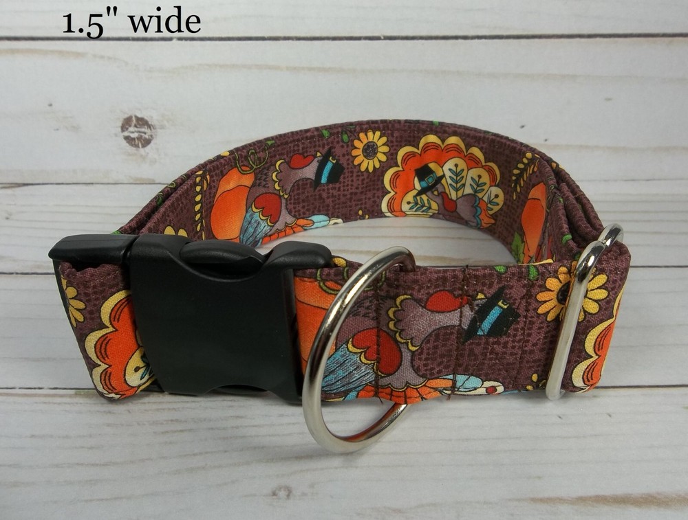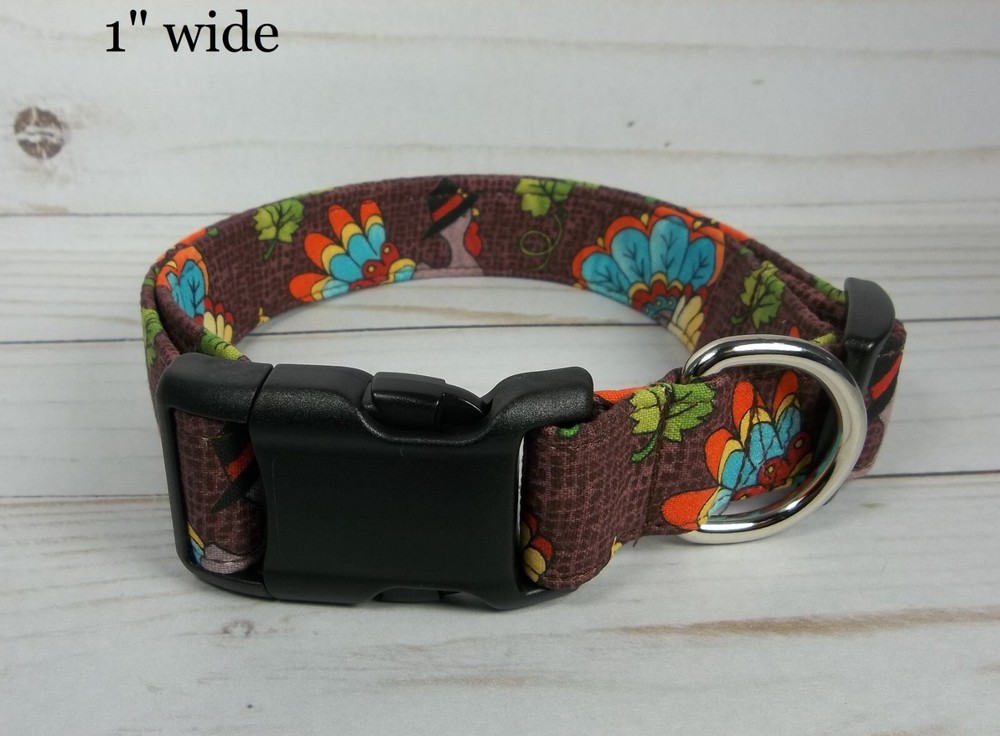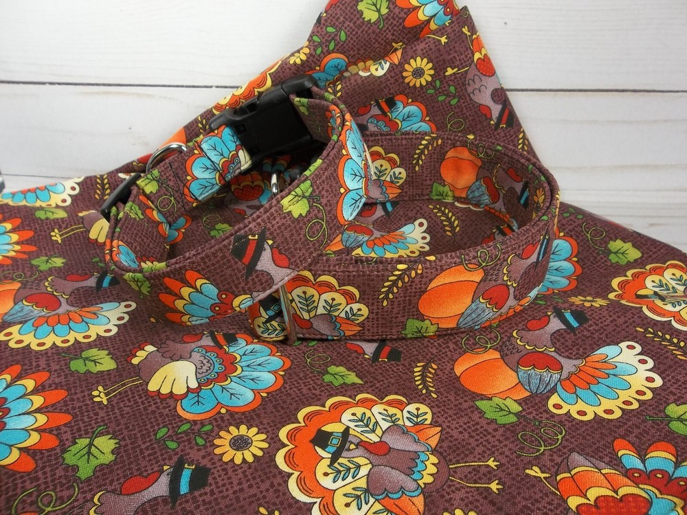 Brown Teal Thanksgiving Turkey Dog Collar made by Terri's Dog Collars ♥ ♥ ♥ ♥ ♥ ♥ Each buy it now of this auction is for one handmade Terri's Dog Collar ~ size your choice Size: adjustable from 7 - 26" depending upon size chosen from the drop down menu Width: varies 5/8" wide 7 - 10" 5/8" wide 10 - 15 3/4" wide 10 - 15" 3/4" wide 12 - 17" 13 - 18" 1" wide 15 - 23" 1" wide 17 - 26" 1" wide 1.5" wide 15 - 23" 1.5" wide 17 - 26" Fabric: thanksgiving turkey Webbing: Poly Pro Buckle: Heavy Duty Contoured Plastic side release We take great pride and care in making our dog collars. We sew high quality fabric over a Poly pro webbing for durability and strength and yet a great weight on your dog's neck. We also use a heavy duty welded D-ring so that your dog can pull as much as he / she wants when walking and you'll still be safe. We use a heavy duty contoured side release buckle. The contour feels great on your dogs neck and the heavy duty stands up to lots and lots of wear. Before you order, you need to measure your dog's neck and make sure it will fit. Please e-mail me with questions or special orders to be listed on ebay for you Other Details : You will receive a collar like in the pictures. The collar in the picture is 1" wide large but has been adjusted to the smallest size of 17". Your collar will be made when you order. We are smoke free / cigarette free work space. However, we do have dogs and love them very much. ♥ ♥ ♥ ♥ ♥ ♥ We accept eBay payments at this time. If you need to change your shipping address, please do so BEFORE you make your payment. Also, please attach any information that you think we will need, to your payment in the comments section. ♥ ♥ ♥ ♥ ♥ ♥ Shipping by first class mail with delivery confirmation: $5.35 We do combine shipping We ship Monday - Friday and will ship most orders within 2 business days (not calendar days) ♥ ♥ ♥ ♥ ♥ ♥ Thank you !!! Thank you for taking time to visit our auction and store. Happy eBaying !! Model NOT included: She just likes showing off her custom made collars !!!!