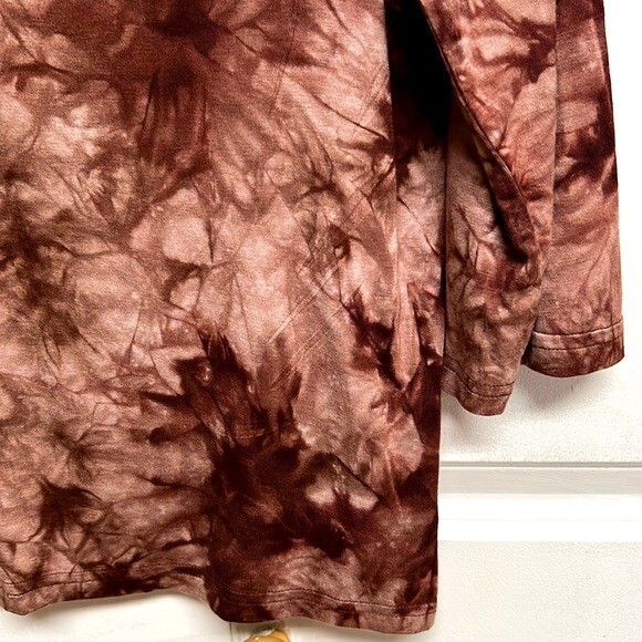 Look stylish and comfortable in this Aces Design brown tie-dye blouse. It features a V-neckline, 3/4 sleeve, and casual sleeve type, making it perfect for travel, casual wear, and work. The blouse is made of polyester and spandex and has a jersey fabric type. The top has lovely accents of beaded detailing and is unlined, lightweight, and stretchy. It is easy to maintain as it requires hand wash only and fits perfectly well with its regular fit. The blouse is a size L and has a designer, hippie, and city theme. This blouse is perfect for any woman who wants to look trendy and comfortable at the same time. 95% polyester 5% spandex super soft stretch fabric hand wash 17’ across shoulders 17.50’ long sleeves 20.50’ across chest 42’ around bottom 24’ long from collar seam to bottom front nice for casual wear