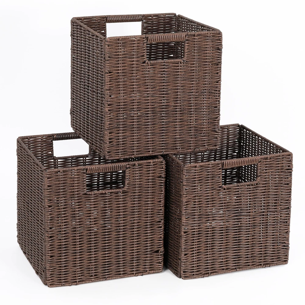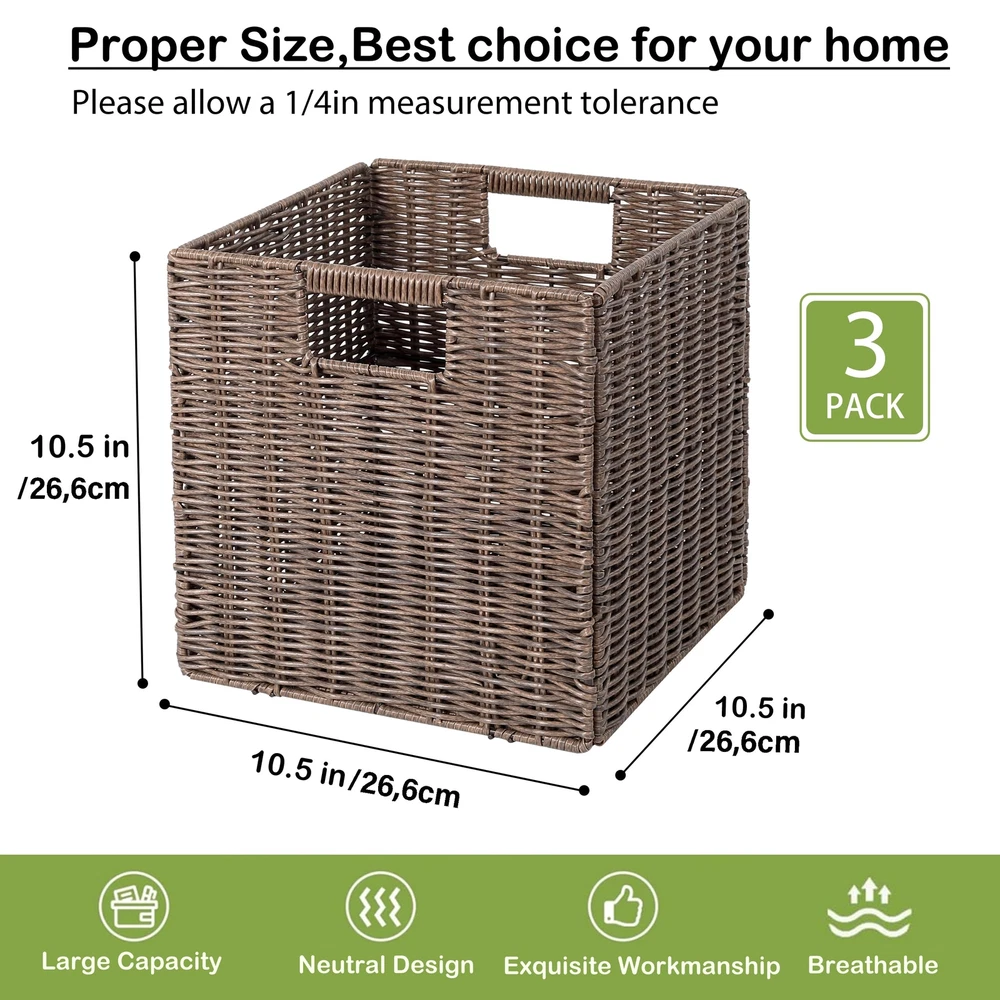 BUILT-IN HANDLES:Our 10.5 in cube wicker baskets with cut out handles which makes these baskets easy to carry from room to room, and its collapsible design makes them easy to store when not in use Material:Handwoven with plastic material, durable and strong bearing capacity.We recommend storing baskets when not in use, they fold for easy storage Size:10.5"L x 10.5"W x 10.5"H, suitable for kallax cabinets with an inner diameter of 10.75 inches or more. (Please know the size of the basket before purchasing to avoid that do not match your shelves and cause you the trouble of returns.) Multipurpose Use:These wicker storage bins are brilliant for storage under tables, or as drawers for square shelves & Kallax. They can store many household items, such as food & snacks in your kitchen, or pillows and clothes in the bedroom. Please Note:please allow a 1/4" measurement tolerance; Suitable for indoor or outdoor use .