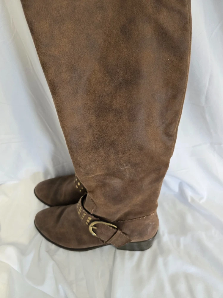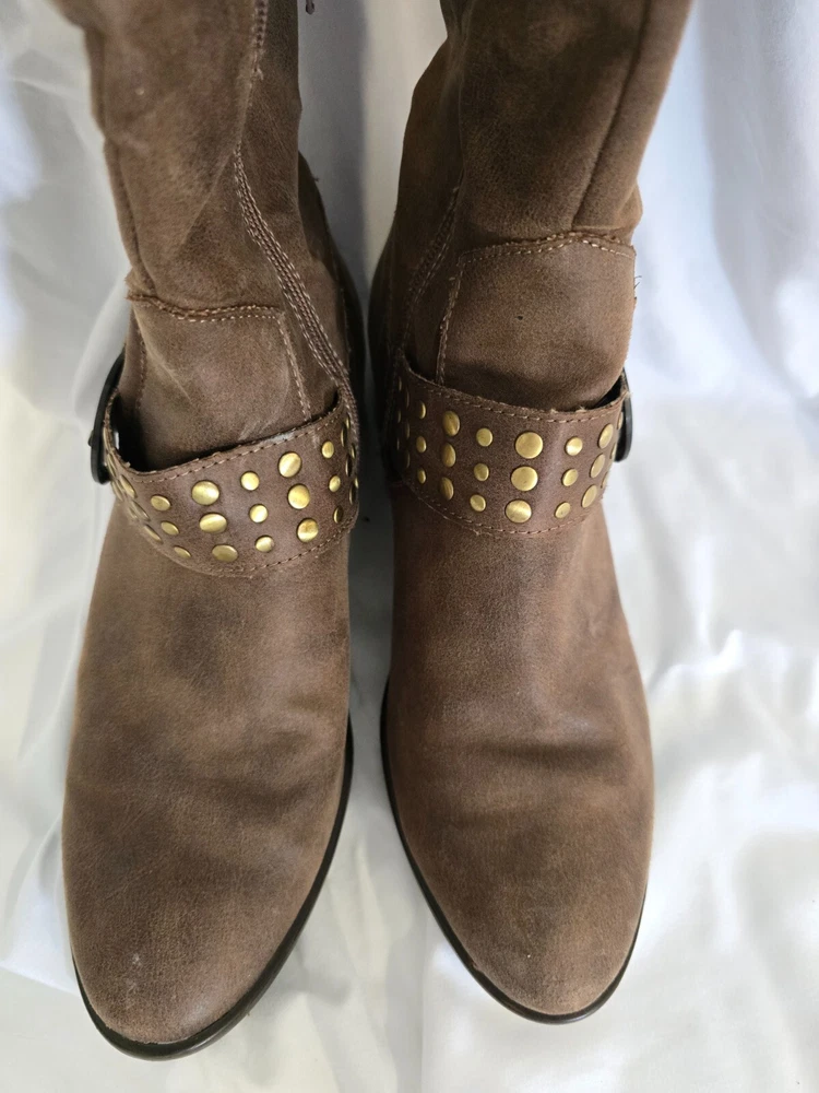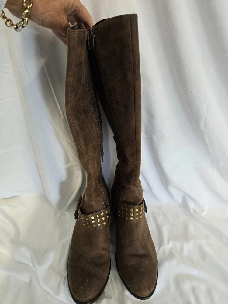 These boots are good for dress casual or riding, adjustable width calf, comfortable sole and around the calf. Barley worn. Size 9.5