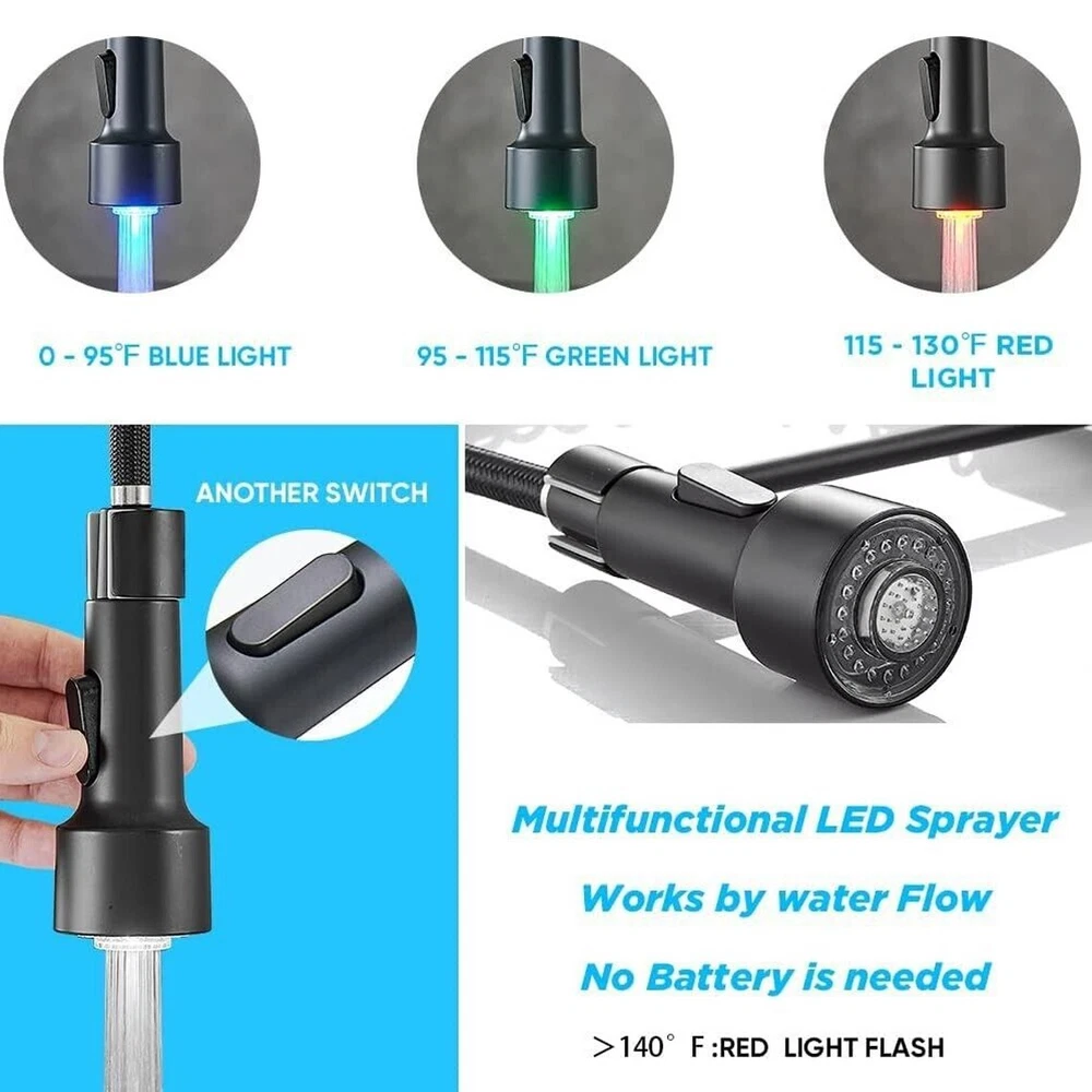 Product Description Function: Kitchen Sink Faucet Feature :Swivel Spout,pull down sprayer Finish: Brushed Gold Black Number of Handles: Single Handle Installation Holes: One Hole Valve Type: Ceramic Valve Faucet Body Material: Brass Faucet Spout Material: ABS Faucet Handle Material: Brass With 2 pipes for cold and hot water(40cm) Water Feature:Mix Hot and Cold Water Pressures:Minimum 0.5 bar, 1.0 bar recommended Water Flow: 1.8 GPM 5 Years warranty Safety first - all bathroom faucet and commercial faucets designed for drinking water use are fully compliant with the latest federal and state lead-free standards Easy to install LED works by water flow,No battery is needed. 3 LED colors will change when water temperature change ,red,blue,green Swivel Spout can make the faucet fit for double bowl kitchen sink 360 degree rotation PACKAGE CONTENT 1 × kitchen faucet 2 × supply hoses,40 cm (if you need longer supply hose,please contact us) Mounting accessories Payment Only PayPal is Accepted. Immediately payment is required after the Winning Bid or Buy it Now Shipping Usually shipment can be arranged within 1 working days after receiving payment. We usually ship by Fedex ,UPS,China Post. Usually the delivery time is 7-20 days. Remote areas will needs extra shipping cost and more time. We ship according to the address on PayPal. (After you make the payment, PayPal will send us an email automatically, informing us the payment and shipping address.) So please make sure your address on PayPal is the right one.We do not ship to PO.BOX address Mail transit time is best estimated, but not guaranteed. As transit time varies. Contact us Shipping damage has to be reported within 7 business days of which the product was delivered. If you have any questions, please be free to contact with us by eBay massage,we will answer your questions ASAP. Feedback I describe items as well as I can. If I have missed something, please let me know. Please e-mail me before leaving feedback if you are unhappy with your item, so we can work it out. International Buyers – Please Note: Import duties, taxes, and charges are not included in the item price or shipping cost.