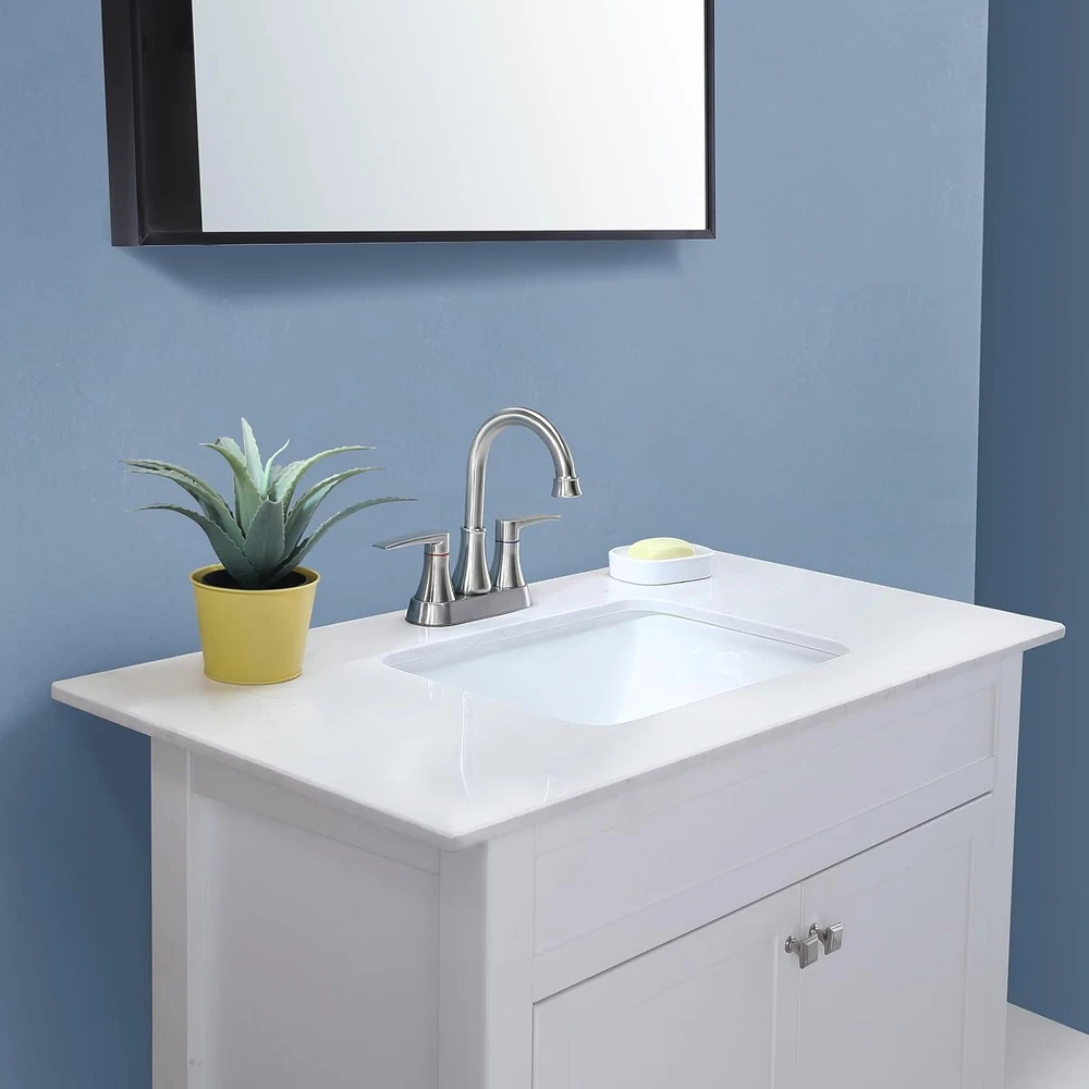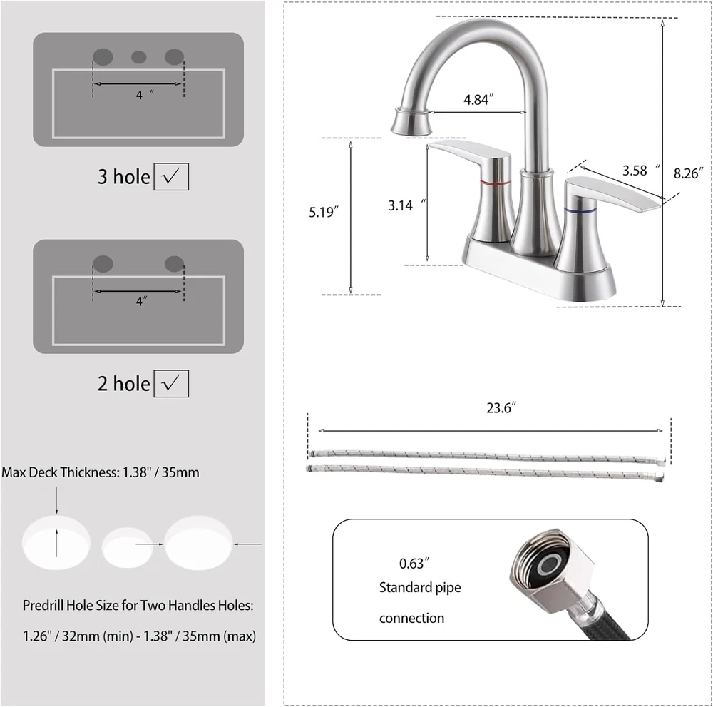Menu Other Items Feedbacks About Us Contact Us Add To Favorites Brushed Nickel Bathroom Faucet, 2-Handle Lead-Free 360° Swivel High-Arc Spout 4 Inch Centerset Bath Lavatory Vanity Sink Faucets Set for Bathroom Sinks with Pop-Up Drain & Water Hoses Pop-up Drain & Water Inlet Hoses are INCLUDED in package. Dimensions: Overall Height: 8.26'';Spout Height: 5.51'',Spout Reach:4.72'' Exraordinary Quality: Lead-free material. Drip-Free ceramic disc cartridge with 500,000 times cycle testing ensures durable performance in daily life. Humanized Features: Brushed Nickel Finish. 360° swivel high arc spout makes your cleaning tasks much easier. 2 handles design for controlling water flow and temperature precisely. CUSTOMER SUPPORT : We stand behind our product and offer exceptional customer support. If you encounter any issues, Valisy's excellent customer support is always ready to assist you,ensuring your complete satisfaction. Product Description Elevating your bathroom’s look with sleek detailed design, VALISY Two Handles Brushed Nickel Bathroom Sink Faucet provides your bathroom timeless fashion with premium quality, resisting rusting,tarnishing,dripping or leaking. Reliability. VALISY Two Handle Lavatory Sink Faucet 360° swivel high arc spout makes your cleaning tasks much easier. Drip-Free Ceramic Cartridge,Valve: Ceramic Disc Cartridge.Ensure water stream comes out smoothly without dripping and leaking. Durable Premium Brushed Nickel Finish. Handle material: Stainless Steel.Resist rust and Easy to clean without tarnishing,corroding,or flaking off. SIZE Overall Height:8.26'' Spout Height: 5.19'' Spout Reach: 4.84' What will you get from a package? A Bathroom Faucet A Pop-up Drain 2 Water Hoses Moungting Accessories Feature Water Mode: Stream Water Feature: Mixed Hot and Cold Water Pressures: Minimum 0.5 bar, 1.0 bar recommended Durability Durable quality for use. Each VALISY faucet is protected by parts . Item Specification Style Classic Spout Height 5.51 Inches Spout Reach 4.72 Inches Material Type Stainless Steel, Brass Warranty Type limited Is Electric No Number Of Handles 2 Finish Types Brushed Number of Pieces 1 Material Stainless Steel, Brass Model Number VABM80008L Installation Method Centerset Model Name VABM80008L Finish Type Brushed Included Components Pop-up Drain, Water Inlet Hoses Spout Design High Arch Gooseneck Number of Handles 2 Special Features Lead Free Special Feature Lead Free Mount Type Deck Mount Mounting Type Deck Mount Color Brushed Nickel Handle Material Stainless Steel Handle Lever Placement Center Recommended Uses For Product Bathroom Handle Type Lever Dimensions Shipping Returns Additional Info Product Dimensions: 10.28 inches x 12.76 inches x 2.95 inches. Weight: 2.18 lb Fast shipping is very important for us. Our standard shipping service is FREE. Your order will be shipped within 1-3 business days upon full payment received. Most items are delivered within 3-5 business days, however, please allow 3-10 business days. We are shipping only to USA. We only ship to the confirmed Paypal address. We reserve the right to cancel any order for any reason at any time. We are not responsible for undeliverable addresses. We offer a 30 day return policy from checkout winning date. Your satisfaction is guaranteed! If for any reason you are unhappy with your item, just return it within 30 days for a full refund, minus shipping cost. Please contact us prior to initiating a return so that we can issue you a refund authorization. Items defective upon receipt must be packaged in their retail packaging as if new and returned with a detailed description of the problem. Return shipping fees are not refundable. We reserve the right to decline any returns if the above guidelines are not followed. All of our items, unless otherwise stated, will only run on 120 volts. Please check to make sure your country complies with these specifications. If you have a problem or question regarding your transaction please contact us before leaving any type of feedback. We will work with you to resolve any problem you may have.