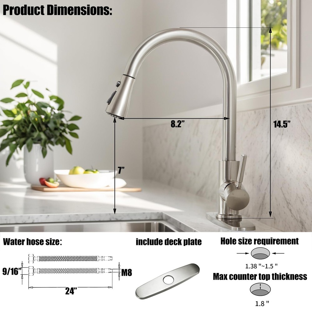 Weight: 3.47 Pounds Color: Brushed Nickel Number Of Pieces: 1 Handle Location: Center Style: Modern Number Of Handles: 1 Model Name: Kh-Kyt010L-D Spout Reach: 7.0 Handle Material: Stainless Steel Brand: Kingo Home Recommended Uses For Product: Bar, Kitchen Type: Does not apply Mounting Type: Deck Mount Hose Length: 23.0 Package Dimensions LxWxH: 16.51x13.12x2.84 Inches Handle Type: Lever gtin13: Does not apply Finish Type: Brushed Included Components: Deck Plate Material: Stainless Steel Part Number: Kh-Kyt010L-D Maximum Flow Rate: 1.8 UPC: Does not apply Model Number: Kh-Kyt010L-D Hole Count: 1 Spout Design: Pulldown With 360° Swivel Installation Type: Single Hole