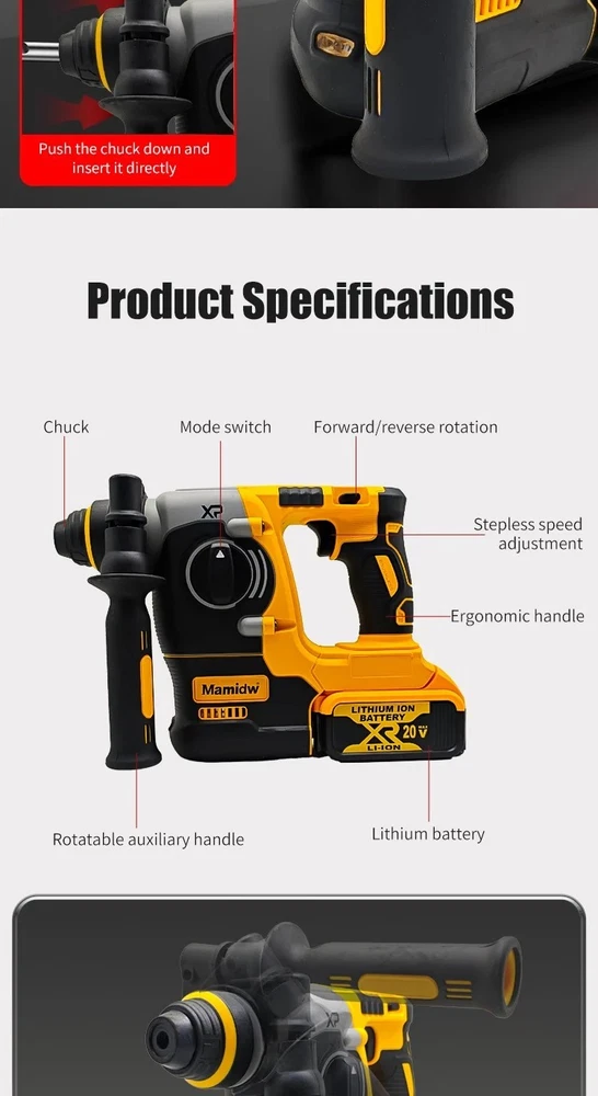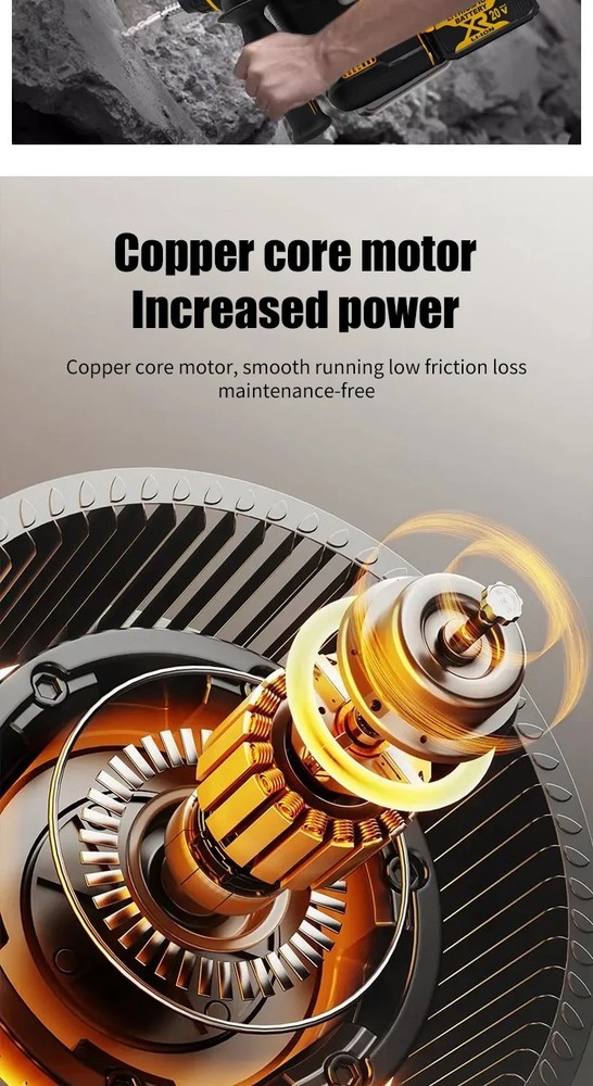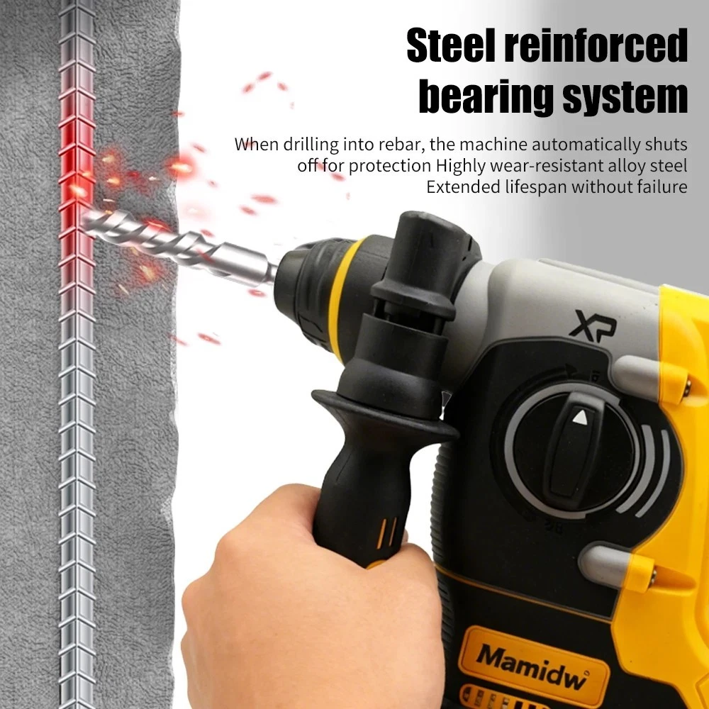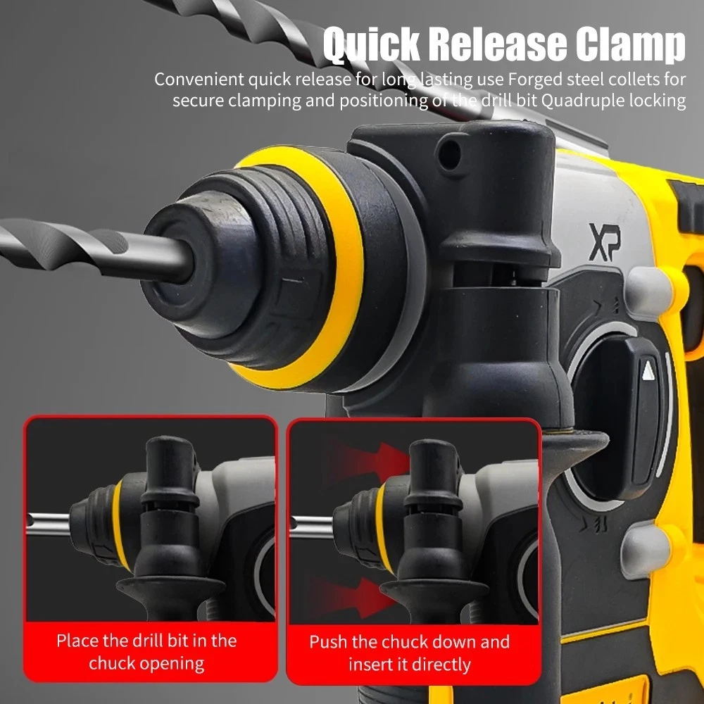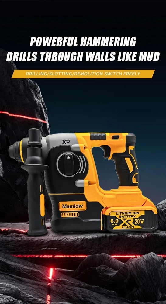 US SELLER Product Overview: Powerful cordless brushless rotary hammer drill designed for drilling and light demolition work. Compatible with DEWALT 20V batteries , this SDS hammer delivers strong impact energy for concrete, brick, and metal applications. Key Features: Brushless motor for higher efficiency & longer life 2 working modes: drilling & hammer drilling SDS chuck system for quick bit changes Cordless design — portable and easy to use Heavy-duty performance for concrete and masonry Ergonomic grip for better control Applications: Concrete drilling, wall installation, renovation work, metal & masonry tasks. Package Includes: 1 × Cordless SDS Rotary Hammer