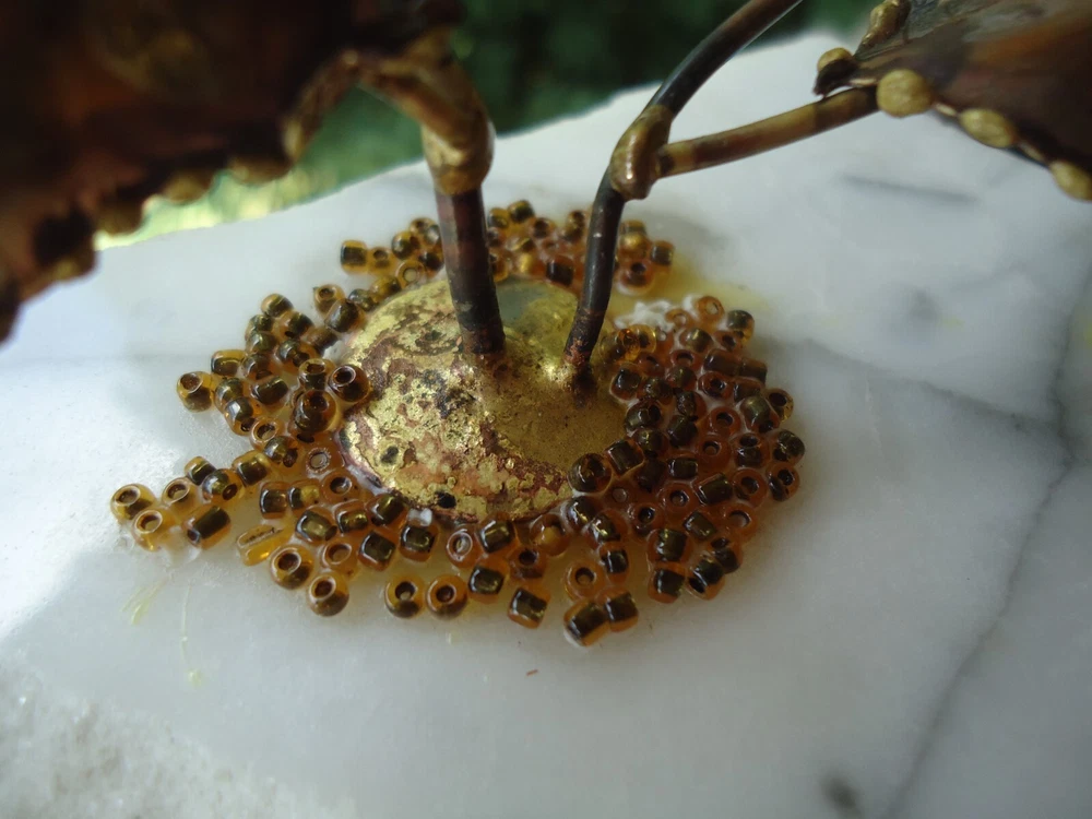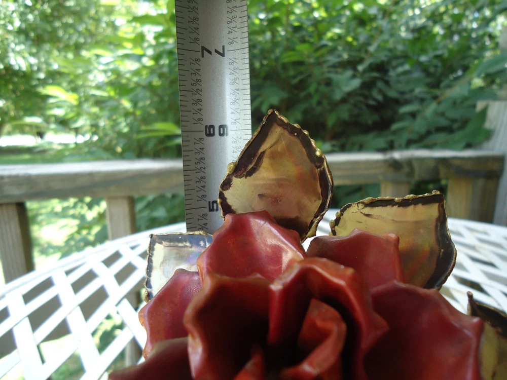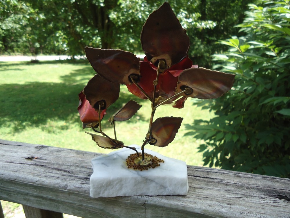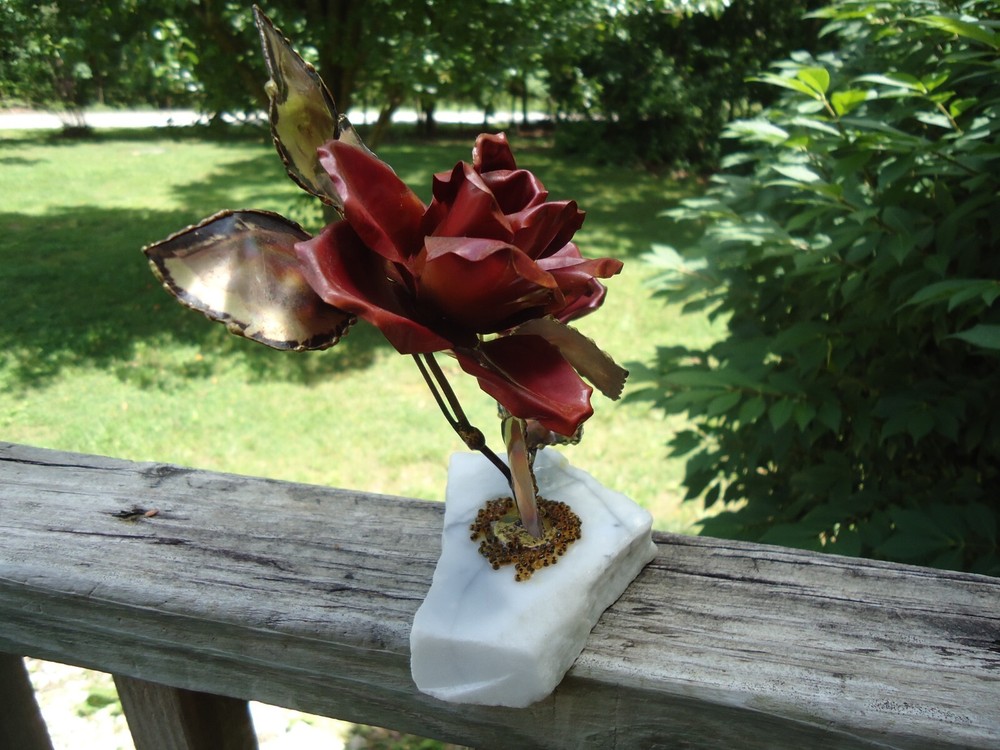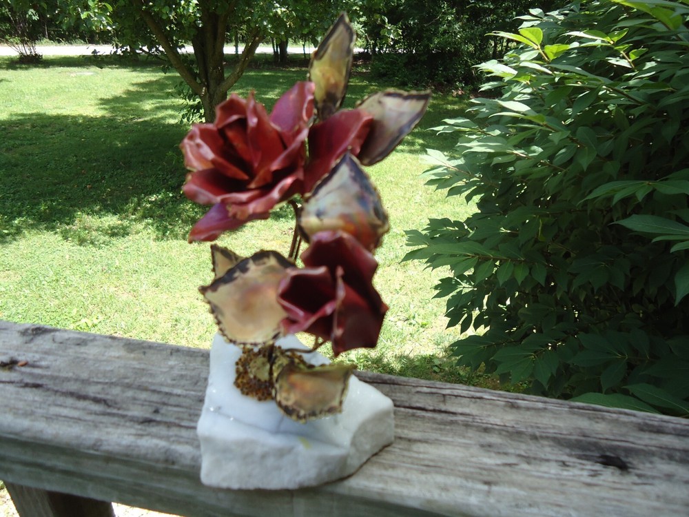 Roses on Marble Brutalist Metal Sculpture Red Floral Forever Flower 6" Decor Note that some of the seed beads at the base of the flower are missing.