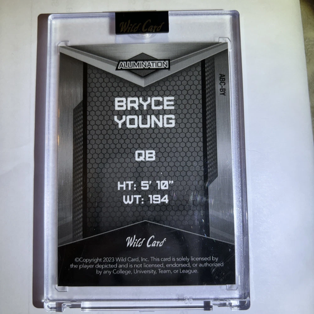 This trading card features Bryce Young, a rookie player in the National Football League (NFL) who is expected to shine in the upcoming season. The card is manufactured by Wild Card and has a card number of ABC-BY. It is a sports trading card that is perfect for avid collectors who love football. The card is in excellent shape and is near mint or better, making it a valuable addition to any collection. It has features that make it stand out, such as its unique design and the player's impressive skills. This card is a must-have for fans and collectors who want to own a piece of sports history. This card would make a great, affordable Christmas gift or stocking stuffer. Thank you for your time and your business!!