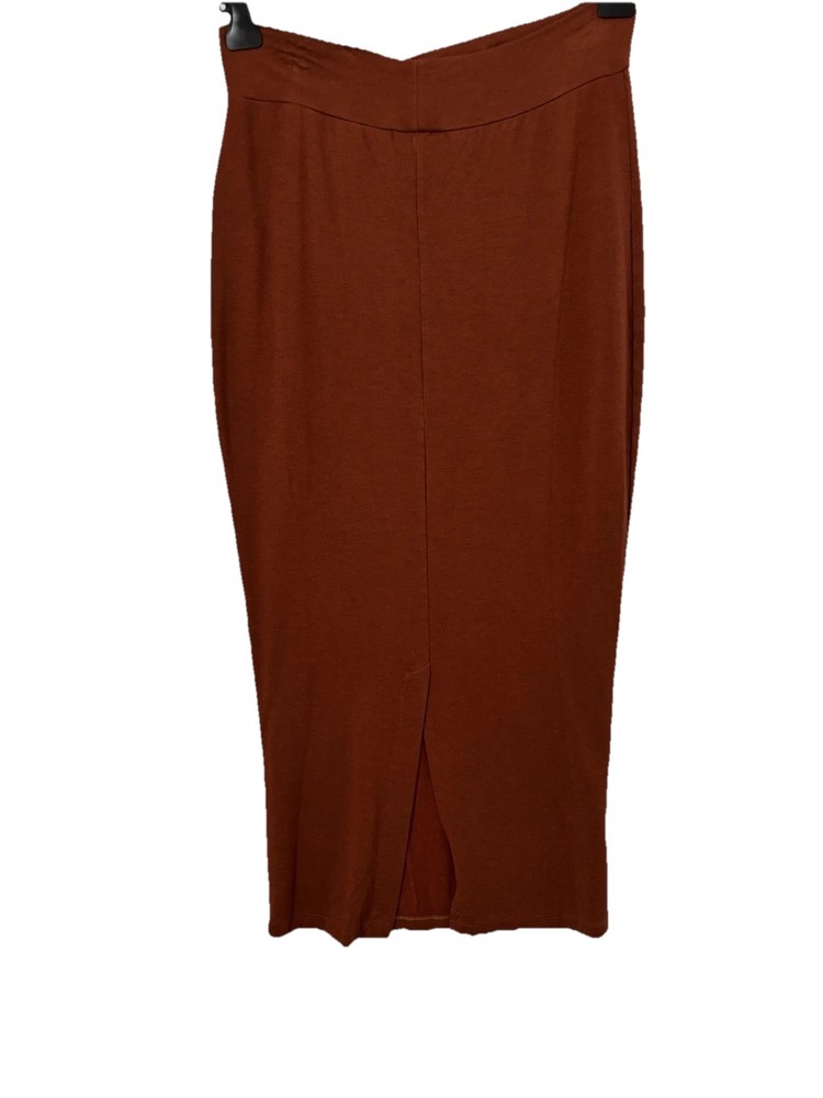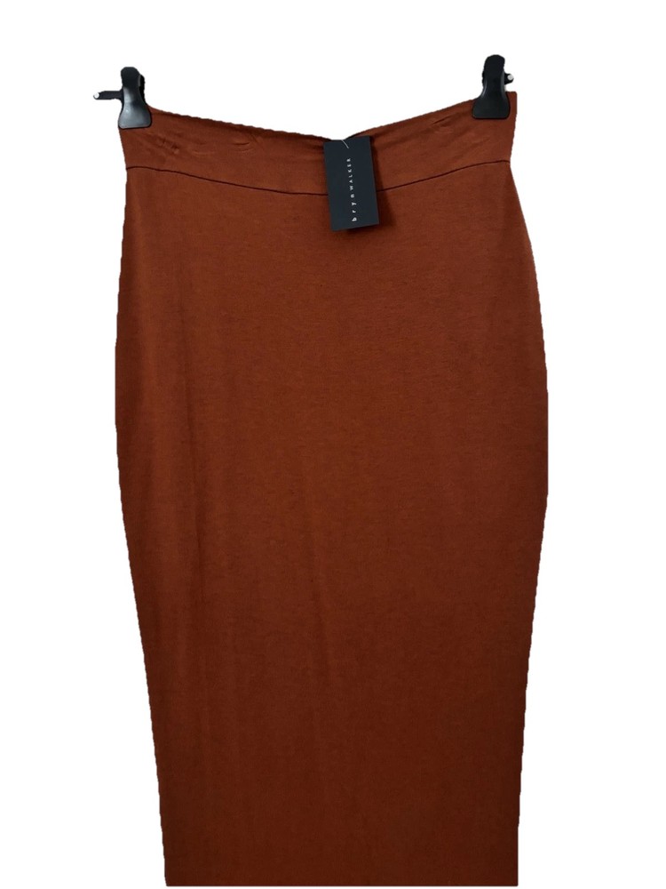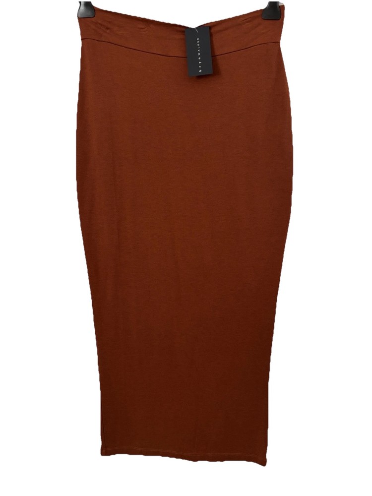 From Bryn Walker, this skirt features: French terry knit fabrication Pencil silhouette Elasticized waistband Straight hemline with back slit Pullover construction Approx. 38" length Siro Rayon/Spandex Machine wash/Tumble dry Made in the USA Waist 34” unstretched Hips 44” unstretched Length 40” if waistband is not folded. 38” if folded over New with tags attached Retail $145