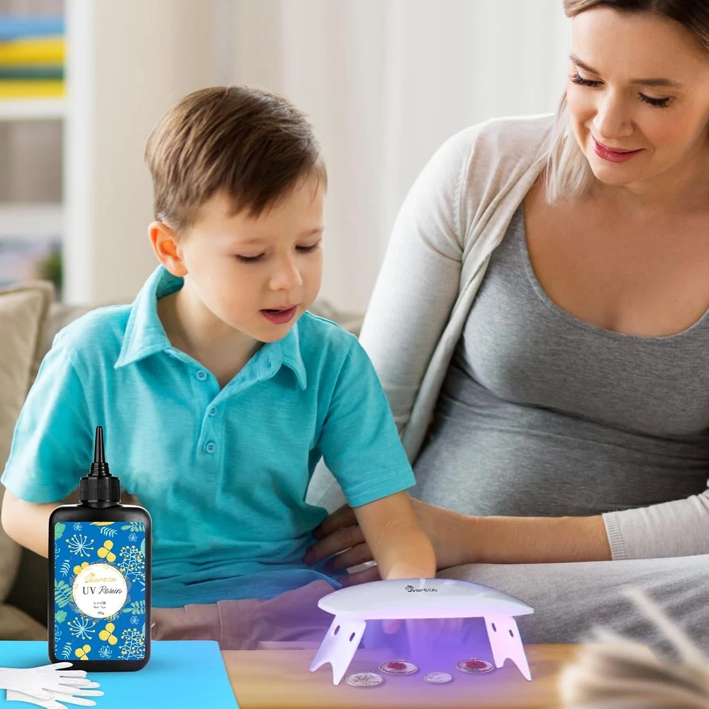 Bsrezn 200g UV Resin Kit with Light, Crystal Clear Solar Activated kit Product Details Product Dimensions : 7.87 x 5.91 x 1.18 inches; 11.64 ounces Item model number : BR-VN200K-1 Manufacturer : Bsrezn Country of Origin : China Brand: Bsrezn Specific Uses For Product: Craft Material: Epoxy Resin, Resin Compatible Material: Wood, Glass, Ceramic, Plastic, Metal, Rubber Item Form: Gel ALL-IN-ONE STARTER KIT: The UV resin kit includes: 2 x 100g UV Resin, 1 x UV Light, 1 x Silicone Mat and 2 pairs of Disposable Gloves. One UV resin kit with light sufficient to get you started on your resin journey. EXPLORE THE VERSATILITY OF UV RESIN HARD: UV epoxy resin is ideal for crafting exquisite small jewelry pieces like earrings and pendants. Moreover, it serves as an excellent protective coating and adhesive for repairing small items. Make colored UV cure resin creations by adding colorants such as mica powder, alcohol ink pigments, universal tints, glitter, or pigment dispersions. SAY GOODBYE TO MESSY MIXING AND POTENTIAL ERRORS: Unlike the traditional epoxy resin, Our UV resin glue arrives expertly pre-blended, ready to be used straight out of the bottle. Needs to mix a hardener is eliminated. You'll get a rock-hard finish under the glow of a UV resin light in 2-4 minutes, not hours! SELF-DEGASSING UV GLUE WITH LOW VISCOSITY: Creating bubble-free UV resin clear items often proves challenging for beginners, as achieving a thin, even layer is crucial. But with Bsrezn UV resin, its impressively low viscosity of 2000cpcs simplifies the process, eliminating the hassle and ensuring smooth, bubble-free results. The quicker flow ensures that you have greater control over the amount used and usually leads to better results. YELLOW-RESISTANT AND ULTRA-DURABLE FINISH: By utilizing resin UV with a shrinkage rate of less than 2% and a hardness rating of 85D, you can produce high-gloss, rock-hard pieces that are resistant to scratching and staining. The clear UV resin's yellow-resistant characteristic ensures that items crafted from it maintain their clarity and brilliance over the years, even under prolonged exposure.
