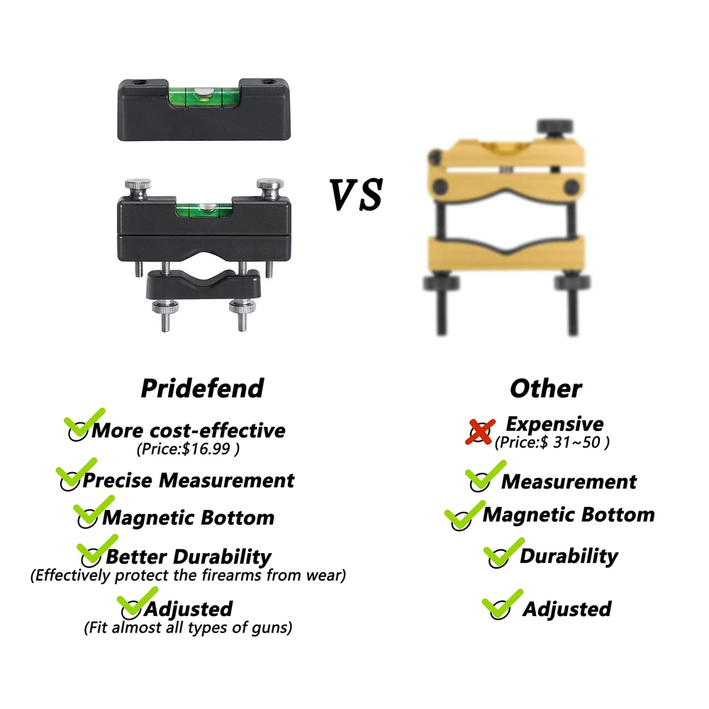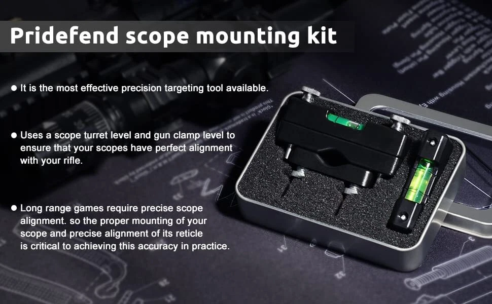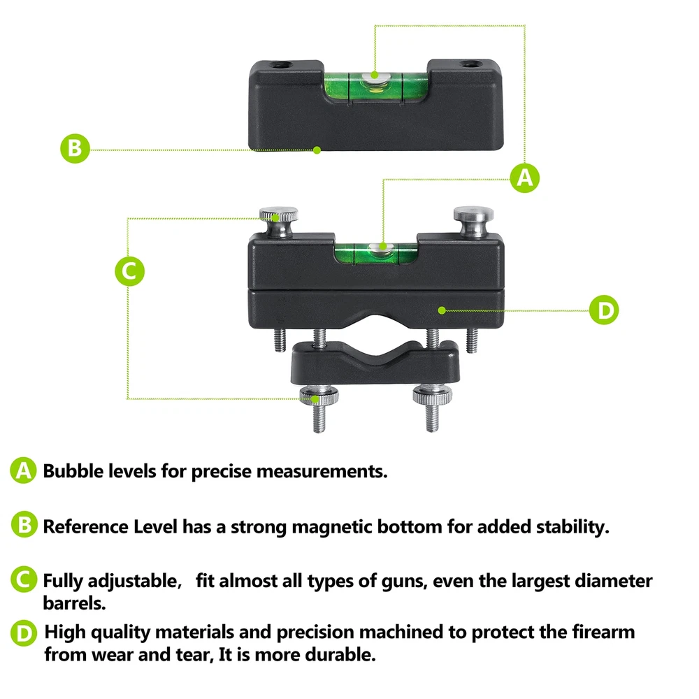 【Advantages】We are committed to meeting user needs,Scope Mounting Kit is designed to combine theideal features available on the market,Allow a scope to be perfectly leveled on any firearm with ease. And you only need to spend half of the market price to get it 【Highly Accurate】 Each scope leveling tool has a bubble level, both on scope turret level and gun clamp level. They are precision calibrated at the factory and work with your gun stand to ensure perfect alignment between your firearm and its optics. 【Easy to Install】 There is a strong magnet at the bottom, put the scope turret level on the scope mount base, place the gun clamp level above the bolts to start testing whether it is level. 【Prevents Scratches】The scope mounting kit is made of precision machined acrylic. High-quality material can effectively protect the gun from wear, and it's more durable. 【Compact Storage Case】Comes with a custom case. The case's surface is transparent, so you can see what's inside without opening it. And the built-in soft foam can protect the level better.