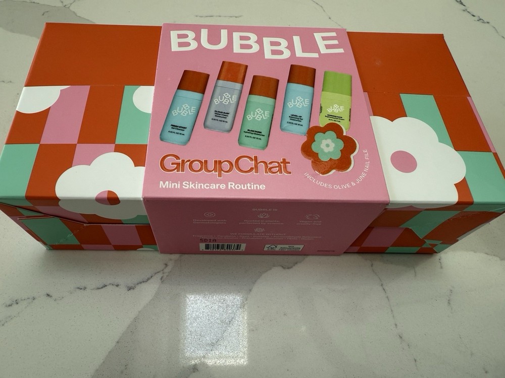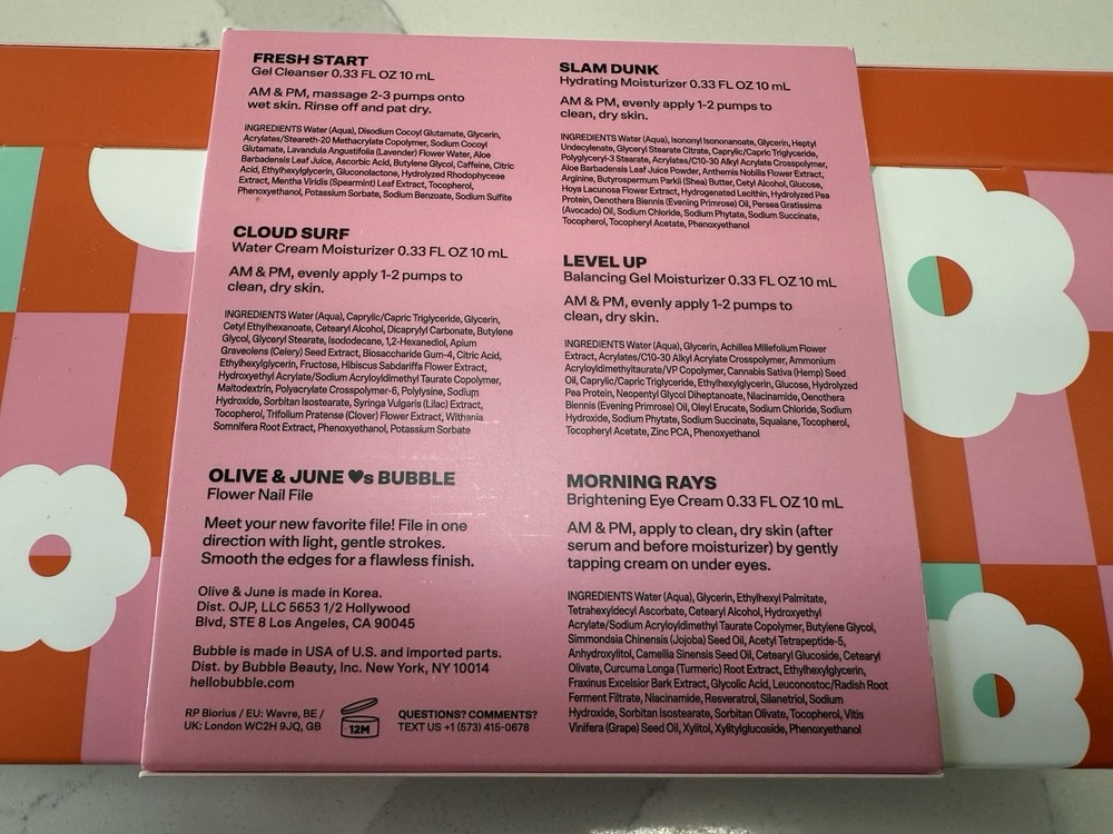 Bubble Skincare Group Chat Mini Routine 6-Piece Set, Includes Fresh Start 10ml, Morning Rays 3ml, Level Up 10ml, Cloud Surf 10ml, and Olive & June Flower Nail File. New friends for your face! This set from Bubble x Olive & June cleanses, brightens, and hydrates skin, and the matching nail file glams your hands. Benefits Promotes clean, calm, and hydrated skin Helps soothe dryness and balance oiliness Helps brighten the under eye area Bubble products are developed with dermatologists Mini sizes are perfect for trial and travel Includes a limited-edition matching nail file