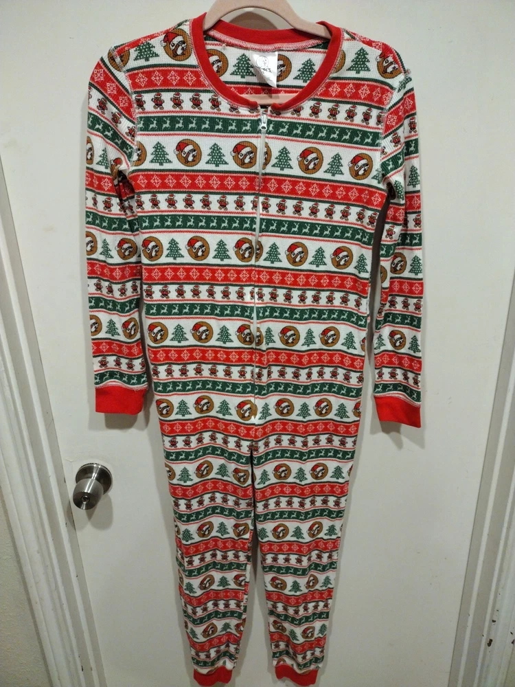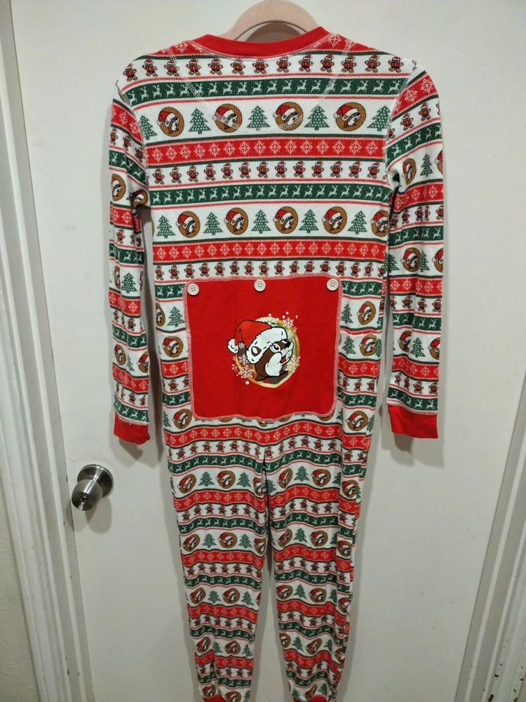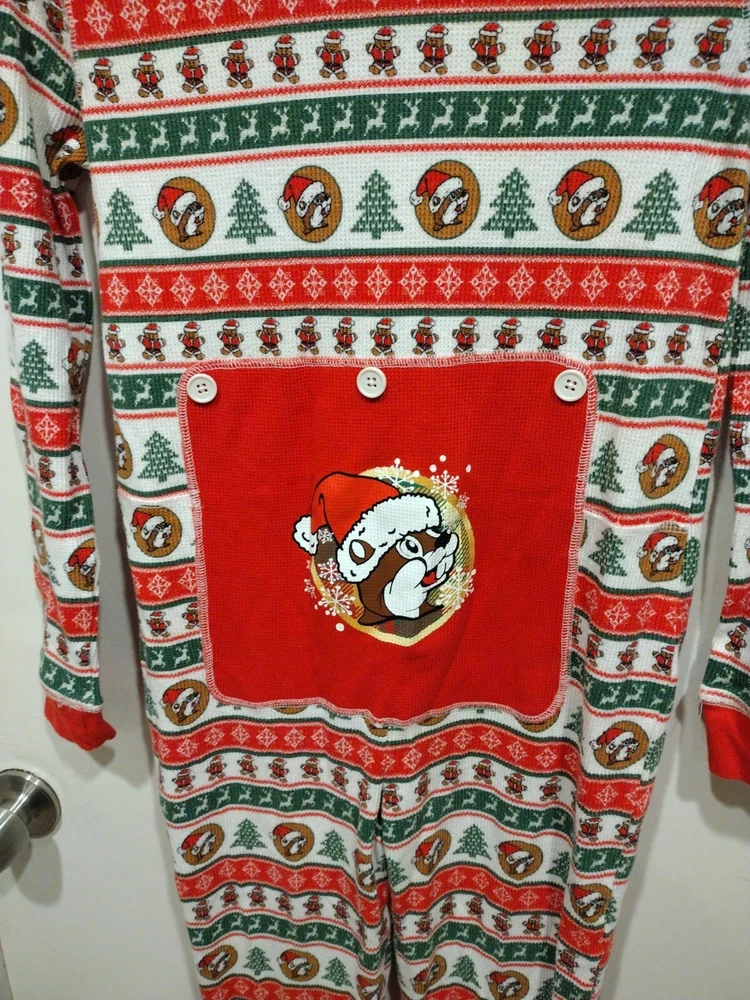 Get into the holiday spirit with this cozy Buc-ee's Merry Christmas Thermal One Piece Union Suit Pajamas. This zip-up piece is perfect for boys who want to stay comfortable and warm during the colder months. Made from a soft cotton blend with thermal fabric type, it features a multicolor Buc-ee's Christmas theme and is size youth L. The one-piece suit has a zip closure and is perfect for lounging around the house or sleeping. It's an excellent addition to any sleepwear collection and is ideal for those who want to embrace the festive season in style. This is in good condition. The back flap doesn't open. Chest 17" Sleeve 23" Length 50" Inseam 26"