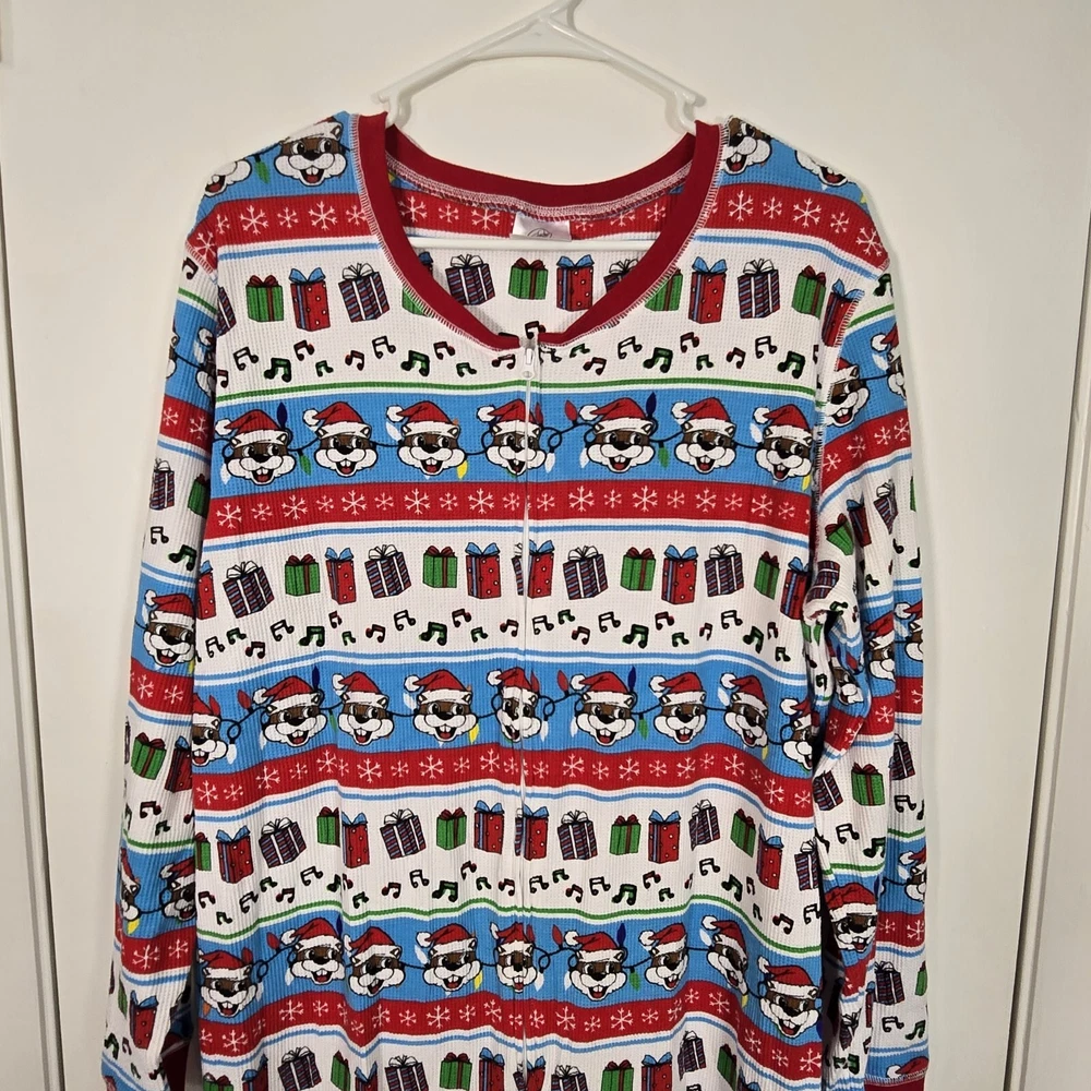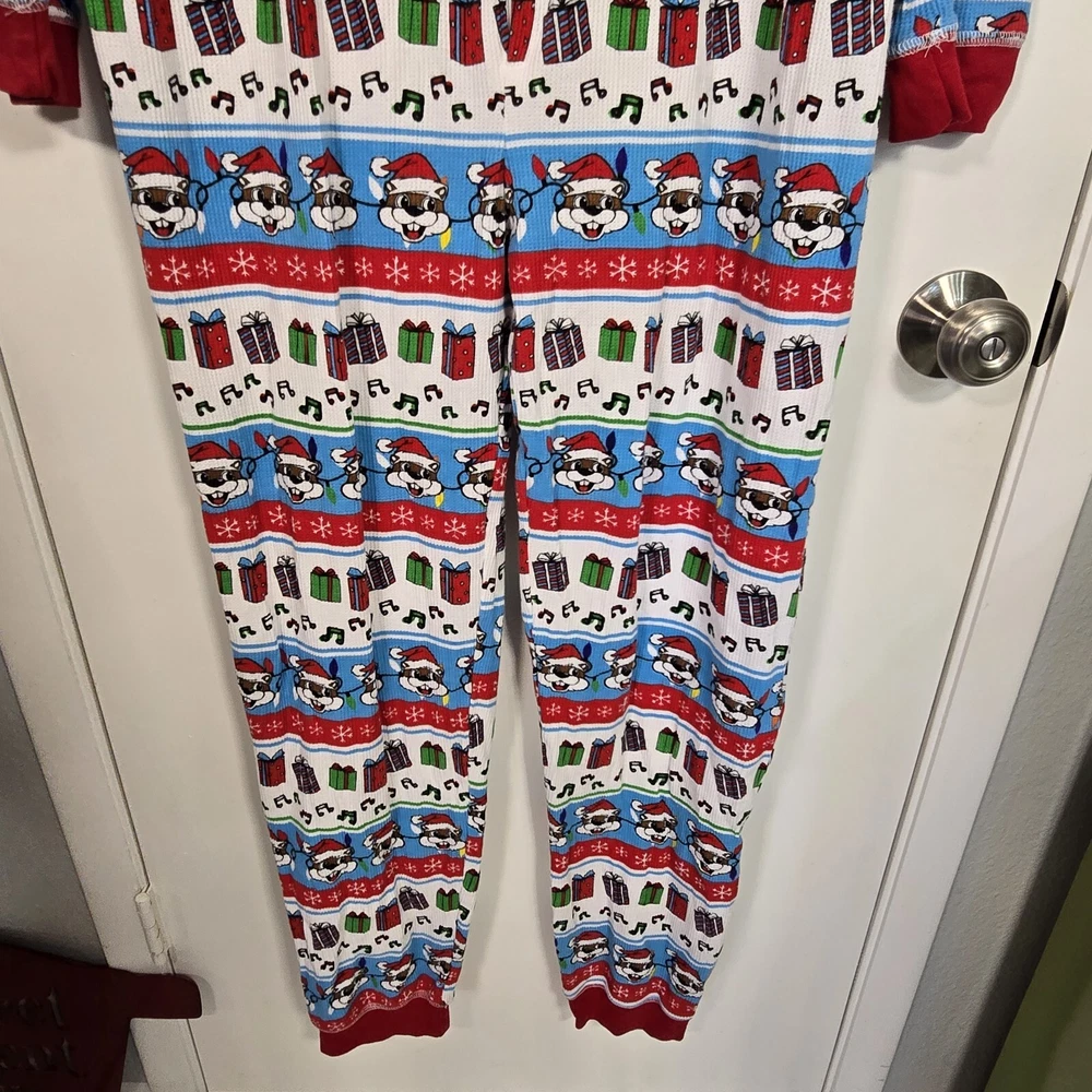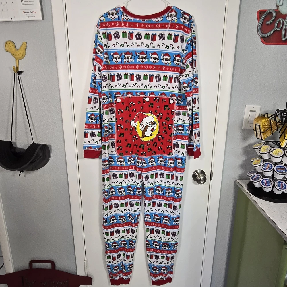 Get ready for the holiday season with these festive Buc-ees one-piece pajamas. Featuring a striped pattern, long sleeves, and a crew neckline, these pajamas are perfect for staying cozy and comfortable during the chilly winter and fall seasons. The zip closure ensures a secure fit, while the lightweight cotton blend material makes them easy to move around in. These pajamas are machine washable for easy care and maintenance. The multicolor design and Christmas theme add a fun touch to your sleepwear collection. Available in size XL, these pajamas are made in China and are perfect for any woman who wants to stay comfortable and stylish while she sleeps. *Please inspect all photos of item(s) before purchasing. If you have any questions, please feel free to ask.
