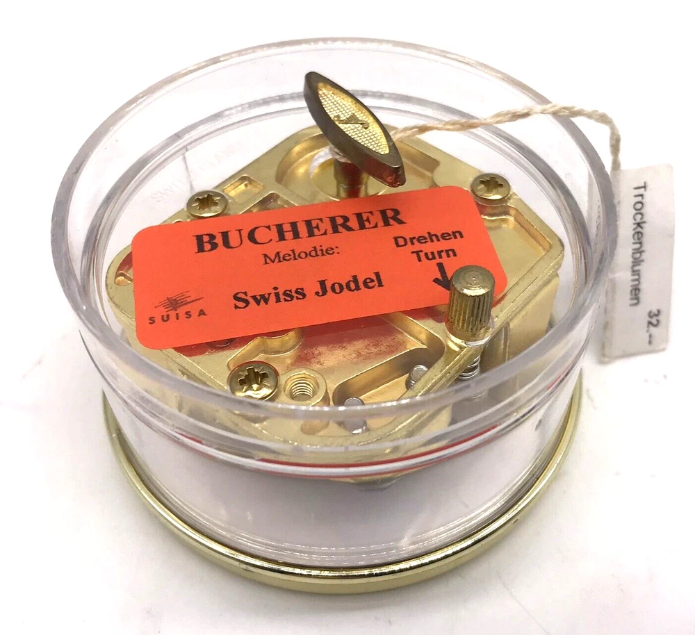 Bucherer Dried Flowers Lid Music Box Plays Swiss Jodel from Switzerland. Beautiful pressed dried flower arrangement on the lid protected by an acrylic top. The music box plays “Swiss “Jodel. There is a crack on the side of the lid that looks like a seam.