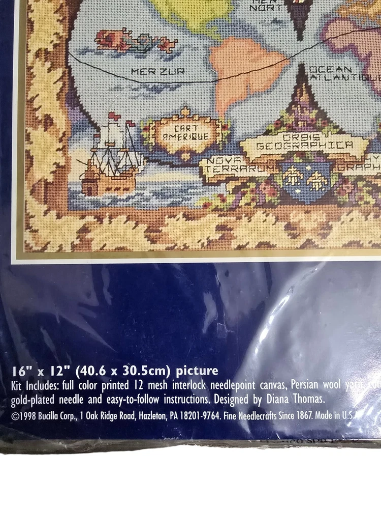 Non-Domestic Product: No Bundled Items: Canvas, Fabric/Cloth, Needle, wool yarn Format: Picture/Pillow Theme: Map Size: 16" X 12" Title: Old World Map Model: 4785 Country/Region of Manufacture: United States Modified Item: No Custom Bundle: No MPN: 4785 Artist: Diana Thomas Brand: Bucilla