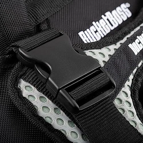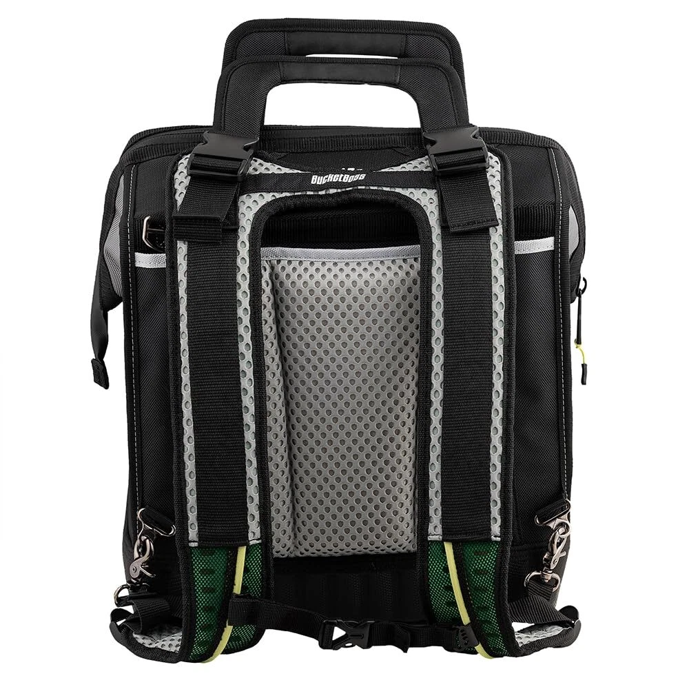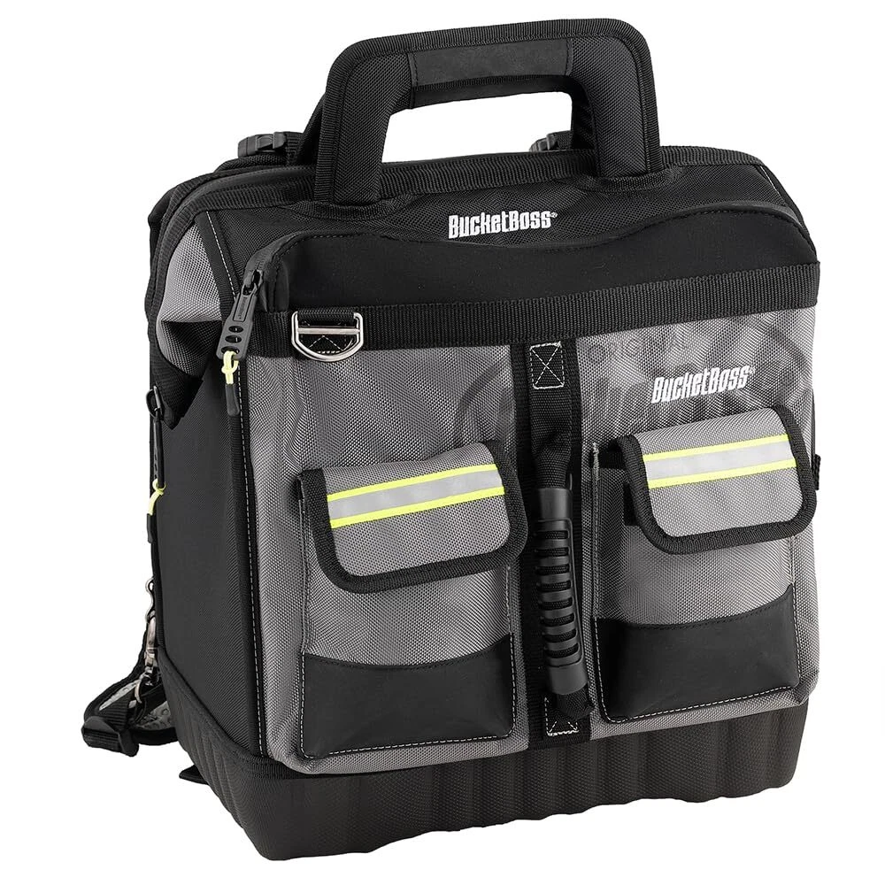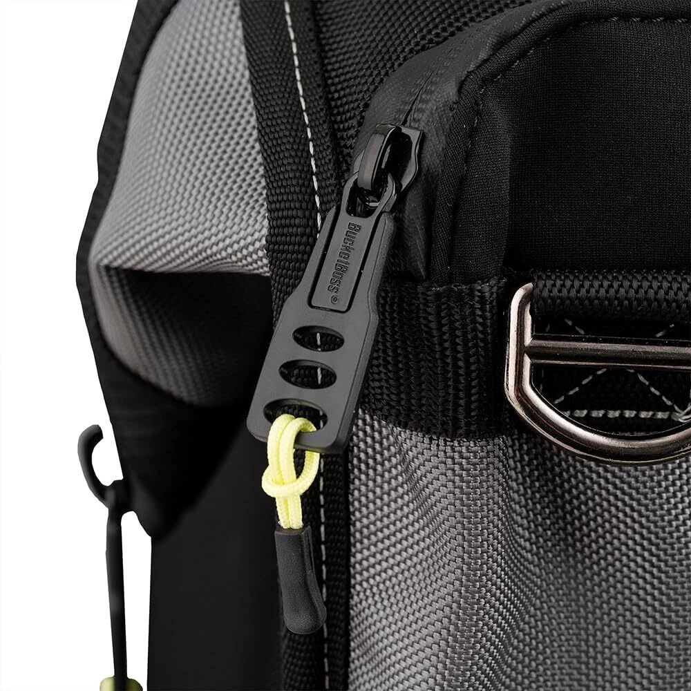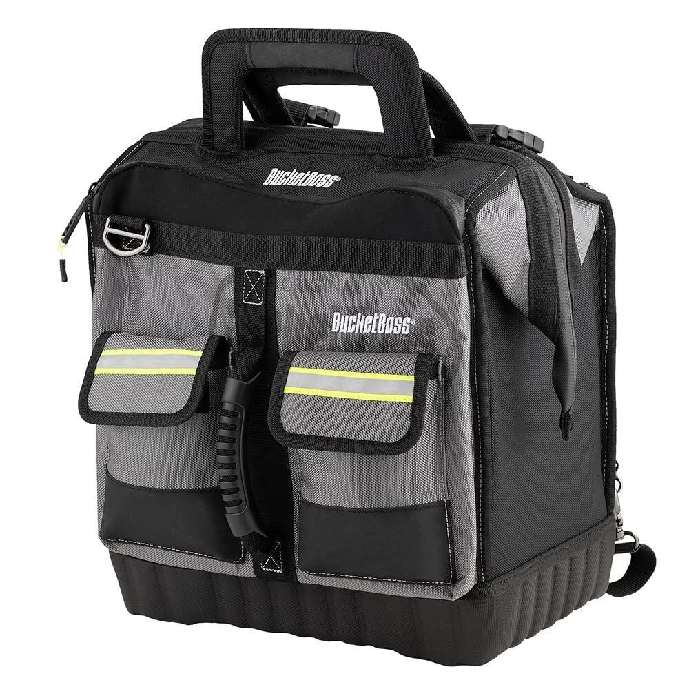 From the Bucket Boss Professional High-Visibility Series, the 14 in. High Visibility Professional Tool bag tool case has 23 total pockets and is built more like a case than a bag, hence the name. Equipped with 3M Scotchlite Reflective that meets ANSI and EN1150 Retro-Reflective worldwide standards for high-visibility and job site safety. Made for the professional, this tool bag is constructed with heavyweight 1680 2-ply poly fabric and boasts a molded, waterproof bottom to protect bag contents. This tool bag also features oversized StayPut handle grips that remain in an upright position, but also an innovative removable, adjustable strap system allowing the tool bag to be worn as a backpack, or tucked behind a cushioned back panel, or be removed altogether. D-Rings allow shoulder strap (not included) to be easily attached to the tool bag case. The front molded grip allows the tool bag to be repositioned easily while sitting upright, allowing the case to be used on a bench as a workstation. The zippered tech-pocket is lined with thick, flexible neoprene and holds up to a 13 inch laptop or tablet. Other features of this high visibility professional tool bag case include a waterproof zipper to keep its 28-liter capacity dry, and 23 total tool pockets - 19 interior pockets and 4 exterior pockets. 1680 heavy-duty poly fabric Molded, waterproof bottom and oversized StayPut handle grips Front laptop compartment fits 13 in. laptop and tablet, 14 internal pockets, 2 external HV Retro-Reflective meets EN1150 worldwide standard Removeable, adjustable straps and front handle allows handling as a work station