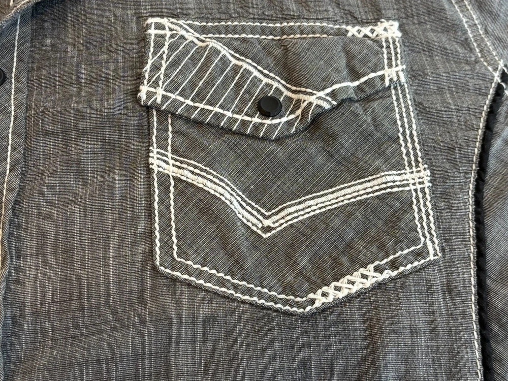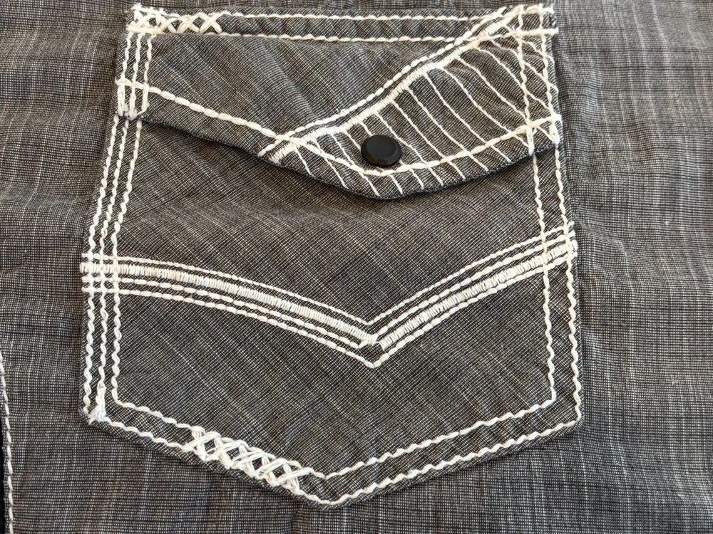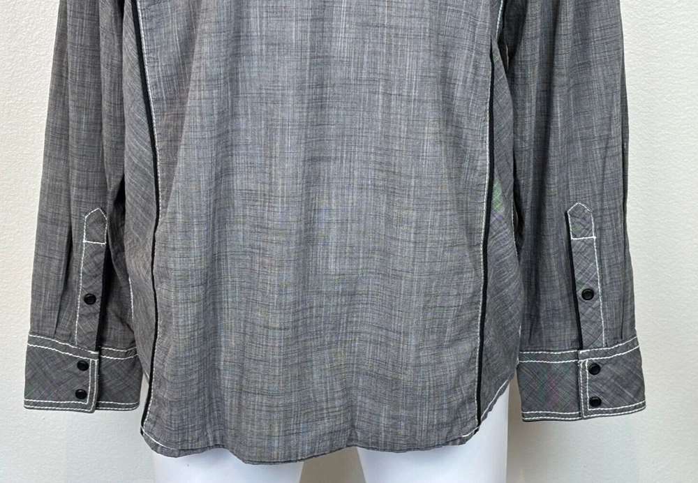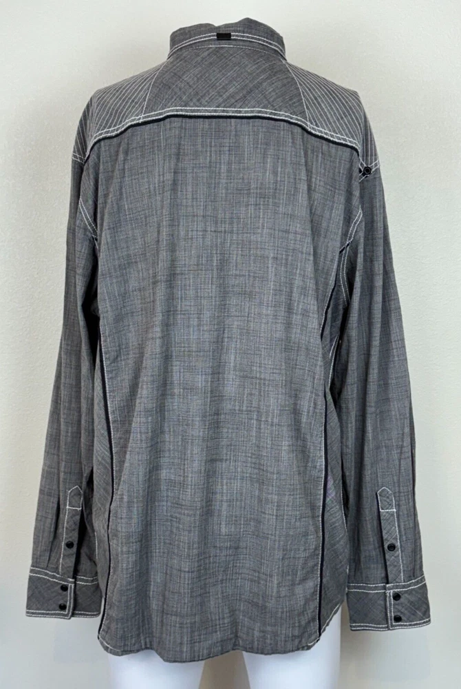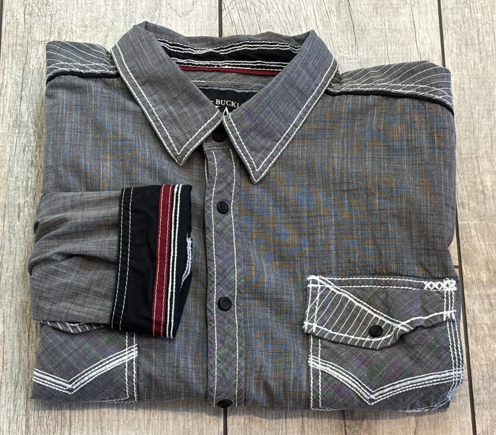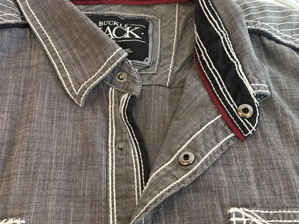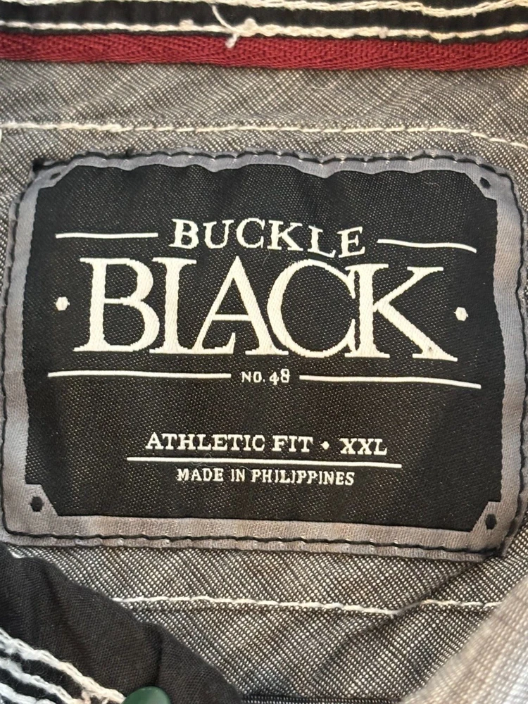 Gorgeous Buckle Black Athletic Fit charcoal gray stretch long sleeve snap up shirt in men's 2XL. The shirt has beautiful white stitching and black trim. It is lightweight and perfect for any occasion. This shirt is in excellent condition. No rips, tears or stains. Features: • Style Profile: Cowboy, Western, Classic, Retro, Rock, Grunge • Black snap buttons, stretch, point collar, flip cuffs, black trim, white stitching, embroidery, 2 button pockets, lightweight. • Machine Washable • Chest: 50 in •Length: 32 in This is a previously owned and used item. It may have signs of wear and previous use. We offer combined shipping to help save you some money!! Simply reach out to me to apply discount PLEASE NOTE: All measurements are approximate and taken with garment laid flat. Please look closely at pictures for measurements before purchasing. If you're not sure about the size, lay flat a similar item of your own and measure that item to compare with our measurements and feel free to message us with any questions. Colors may differ slightly in shade from photos to actual item due to variances caused by photography lighting and monitors. We greatly appreciate your business! Please remember to leave positive feedback if you are happy with your purchase! Thanks for looking!