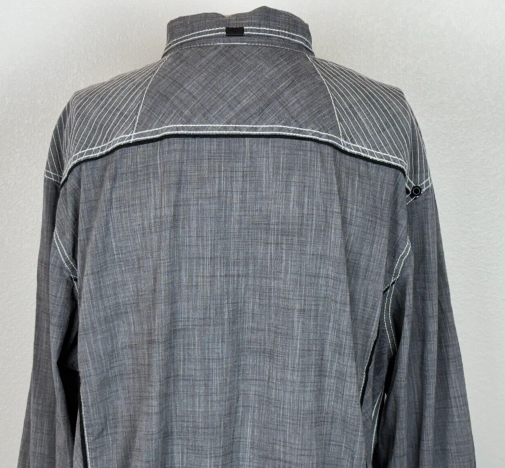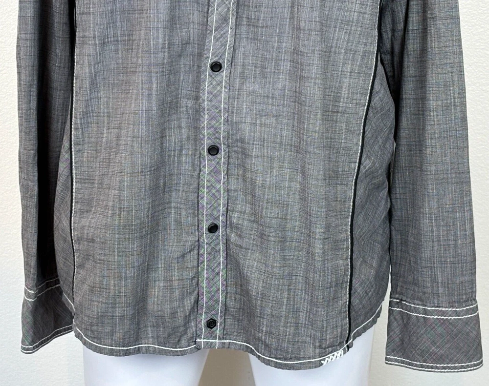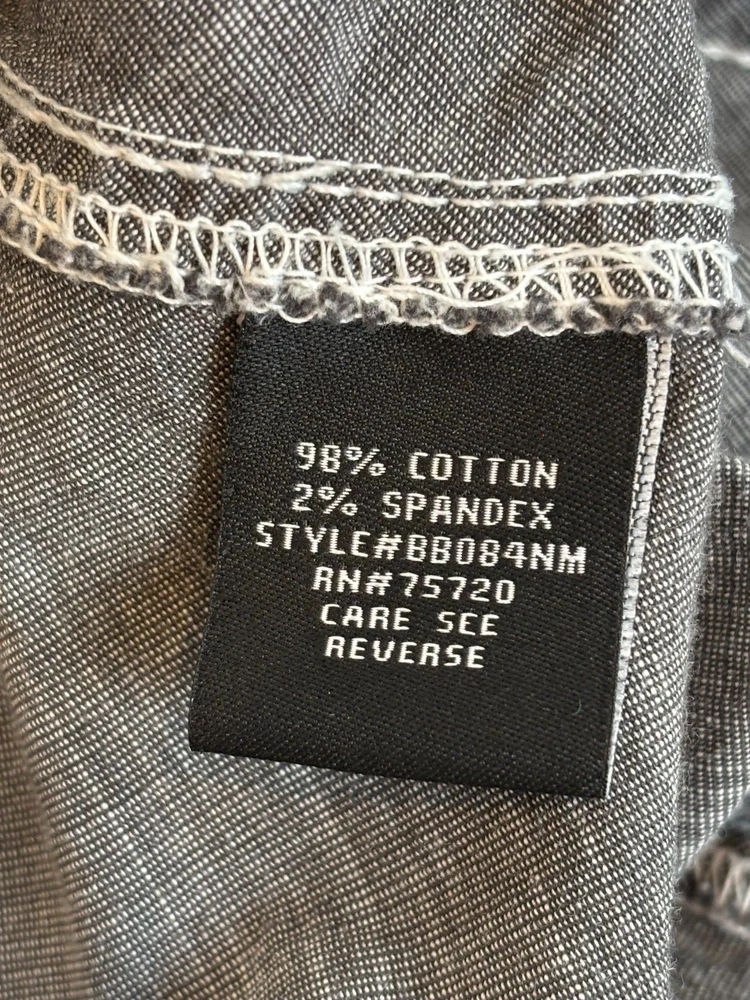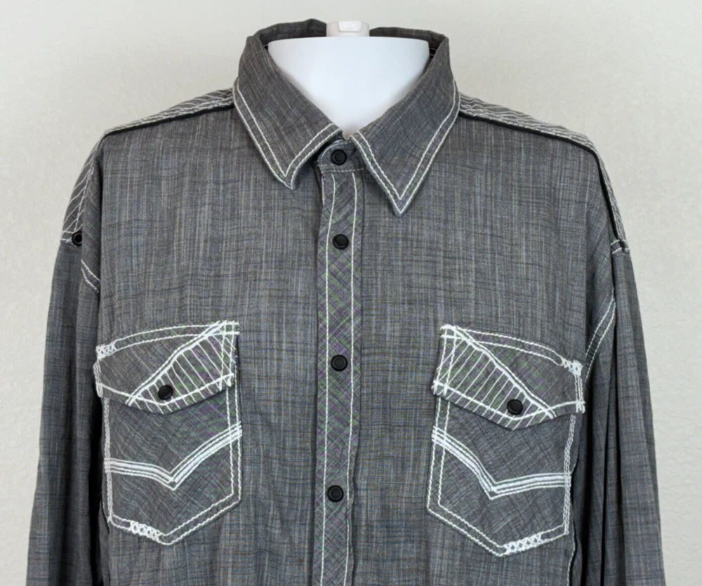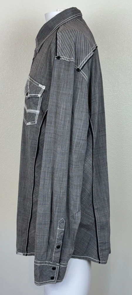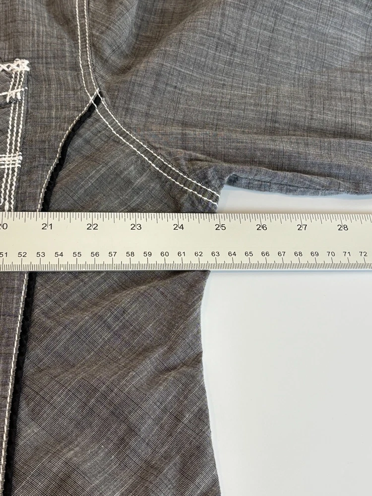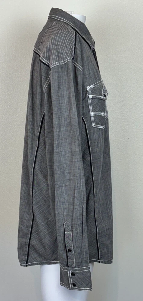 Gorgeous Buckle Black Athletic Fit charcoal gray stretch long sleeve snap up shirt in men's 2XL. The shirt has beautiful white stitching and black trim. It is lightweight and perfect for any occasion. This shirt is in excellent condition. No rips, tears or stains. Features: • Style Profile: Cowboy, Western, Classic, Retro, Rock, Grunge • Black snap buttons, stretch, point collar, flip cuffs, black trim, white stitching, embroidery, 2 button pockets, lightweight. • Machine Washable • Chest: 50 in •Length: 32 in This is a previously owned and used item. It may have signs of wear and previous use. We offer combined shipping to help save you some money!! Simply reach out to me to apply discount PLEASE NOTE: All measurements are approximate and taken with garment laid flat. Please look closely at pictures for measurements before purchasing. If you're not sure about the size, lay flat a similar item of your own and measure that item to compare with our measurements and feel free to message us with any questions. Colors may differ slightly in shade from photos to actual item due to variances caused by photography lighting and monitors. We greatly appreciate your business! Please remember to leave positive feedback if you are happy with your purchase! Thanks for looking!