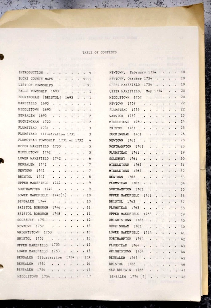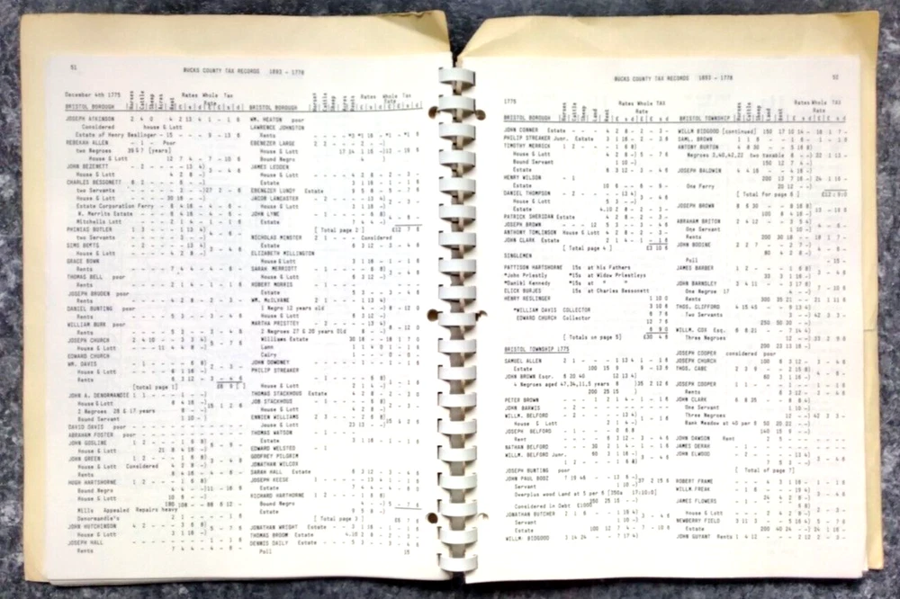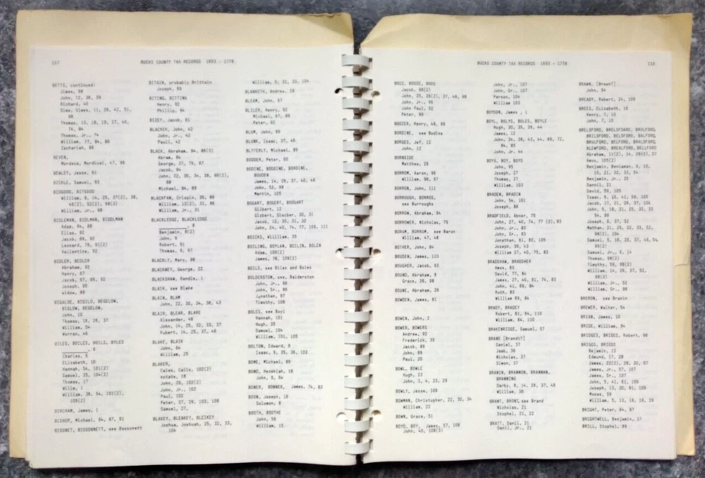 Bucks County Tax Records 1693 - 1778 compiled by Terry McNealy and Frances Wise Waite published by the Bucks County Genealogical Society 2nd printing 1983. 163 page 9 1/2 by 12 inch spiral softcover. lots of genealogical information