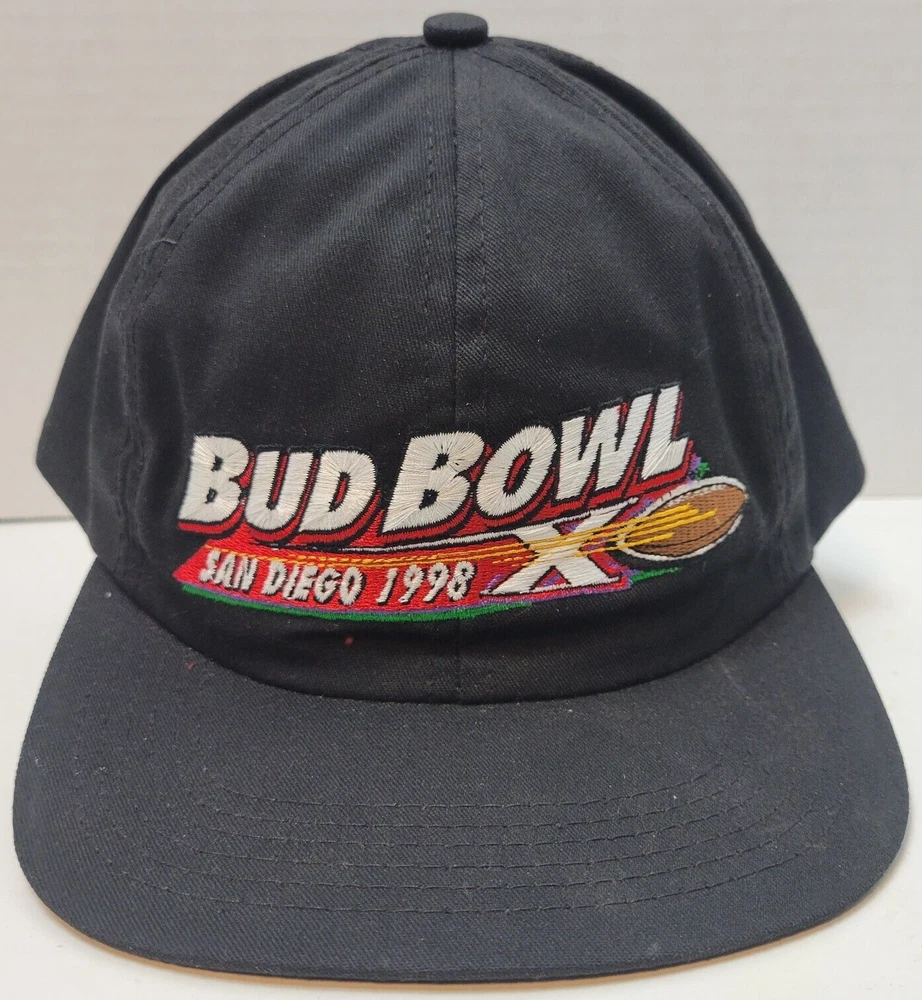 Show your love with thisVintage Bud Bowl 1998 Super Bowl cap! This black embroidered cap is perfect for any fan looking to support their team. It's a one-size fit for both men and women, making it a great accessory for any game day outfit. With its sleek design and high-quality embroidery, this cap is a must-have for any football fan. It's the perfect addition to any collection of fan apparel and souvenirs. Get ready to cheer on the Chargers in style with this Bud Bowl 1998 Super Bowl cap! Thank you for viewing this listing. Please reach out to us directly if you have any questions you may have. Please Check out my Other Items. Note that we offer free, no question asked returns for up to 30 days after purchase. If you're not happy with the item for any reason after purchasing, simply open a return, send it back for free, and we will refund your money in full. Thanks, and have a great day!