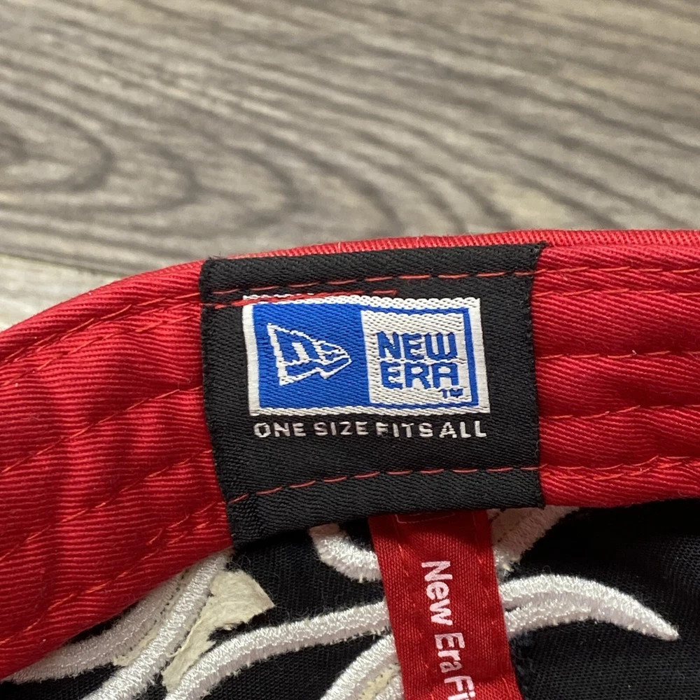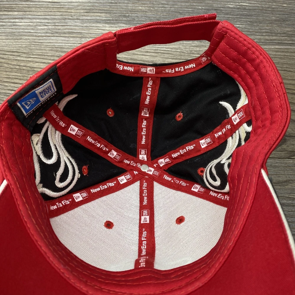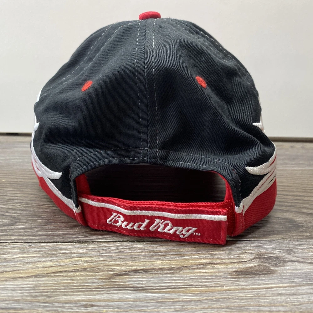 Budweiser King Red Cap Hat New Era Flames with Signature One Size Preowned hat in good condition. Has some wear and fuzz. Please see all photos.