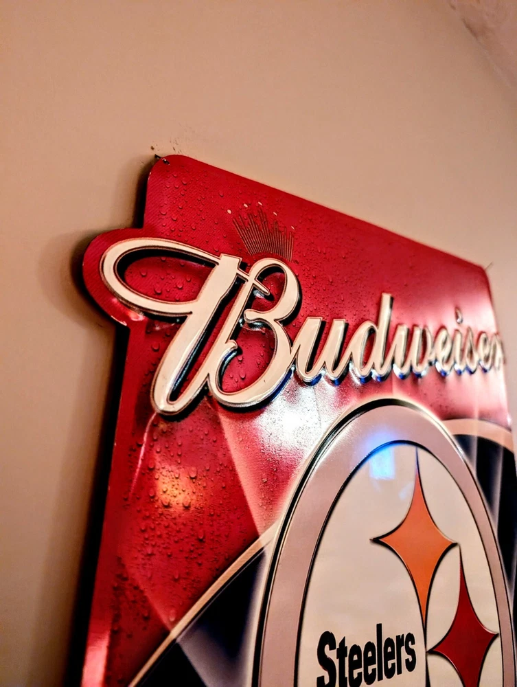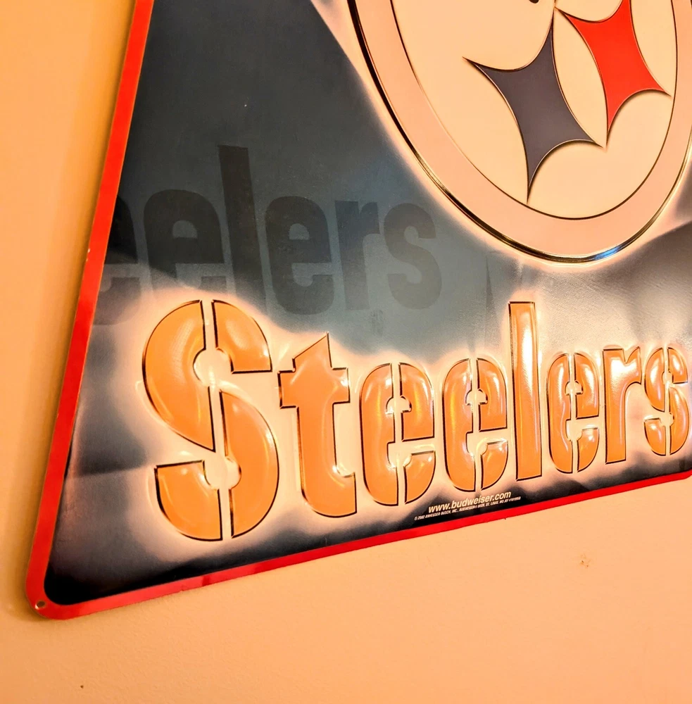 Budweiser and Pittsburg Steelers metal sign from 2002. This sign was only available to bars at the time and is in almost perfect shape. Hung in my aunt's bar in Parkersburg, WV.