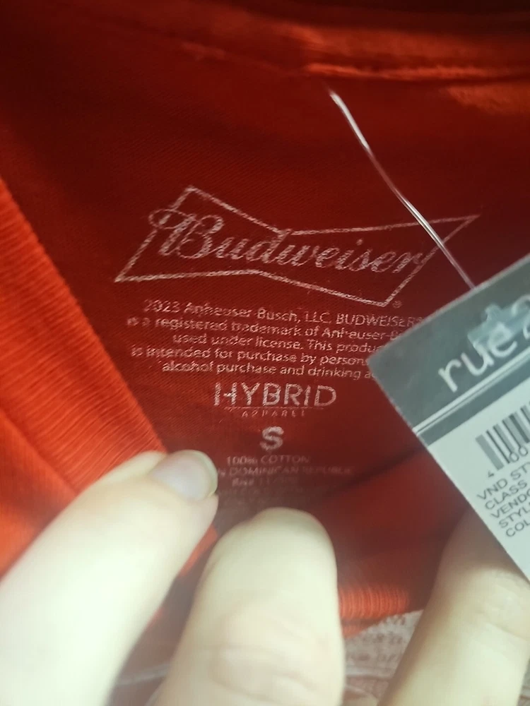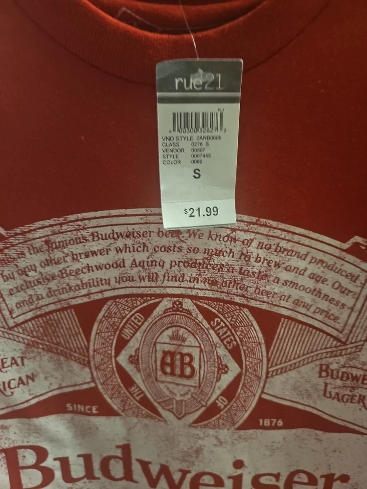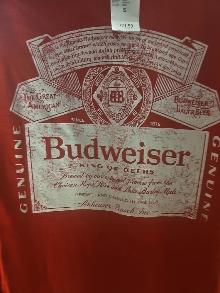Show off your love for Budweiser with this vibrant red tee. The classic T-shirt design is perfect for both men and women, and the size small fits regular size types. Represent your favorite brand in style with this comfortable and stylish shirt. The shirt is made for unisex adults and comes in a bold red color. The Budweiser logo is prominently displayed on the shirt, showcasing your love for the brand. This tee is perfect for casual outings or events and is a must-have for any Budweiser fan.
