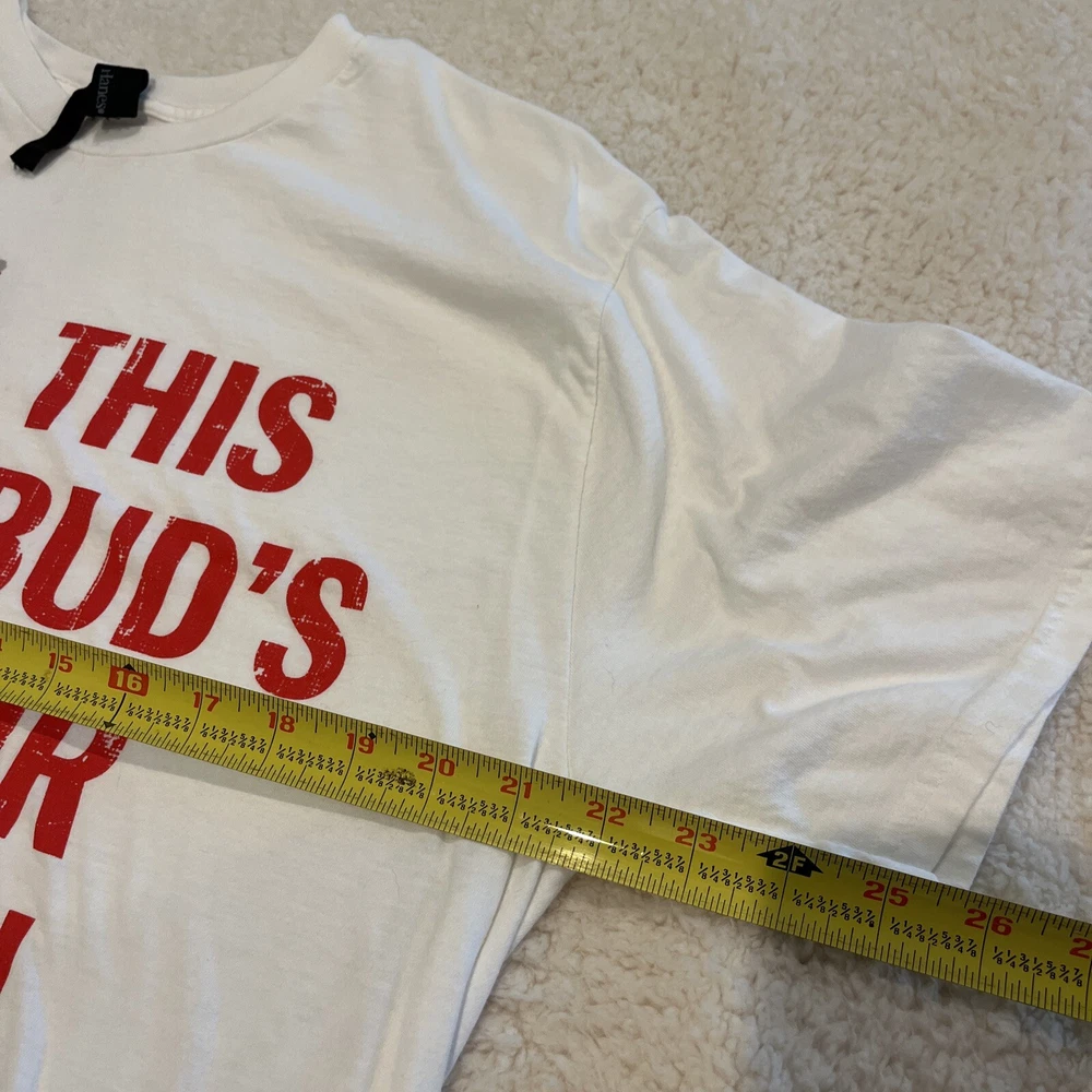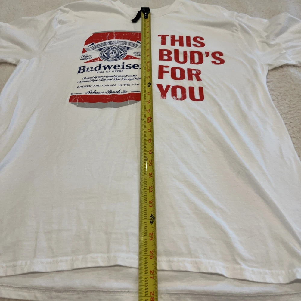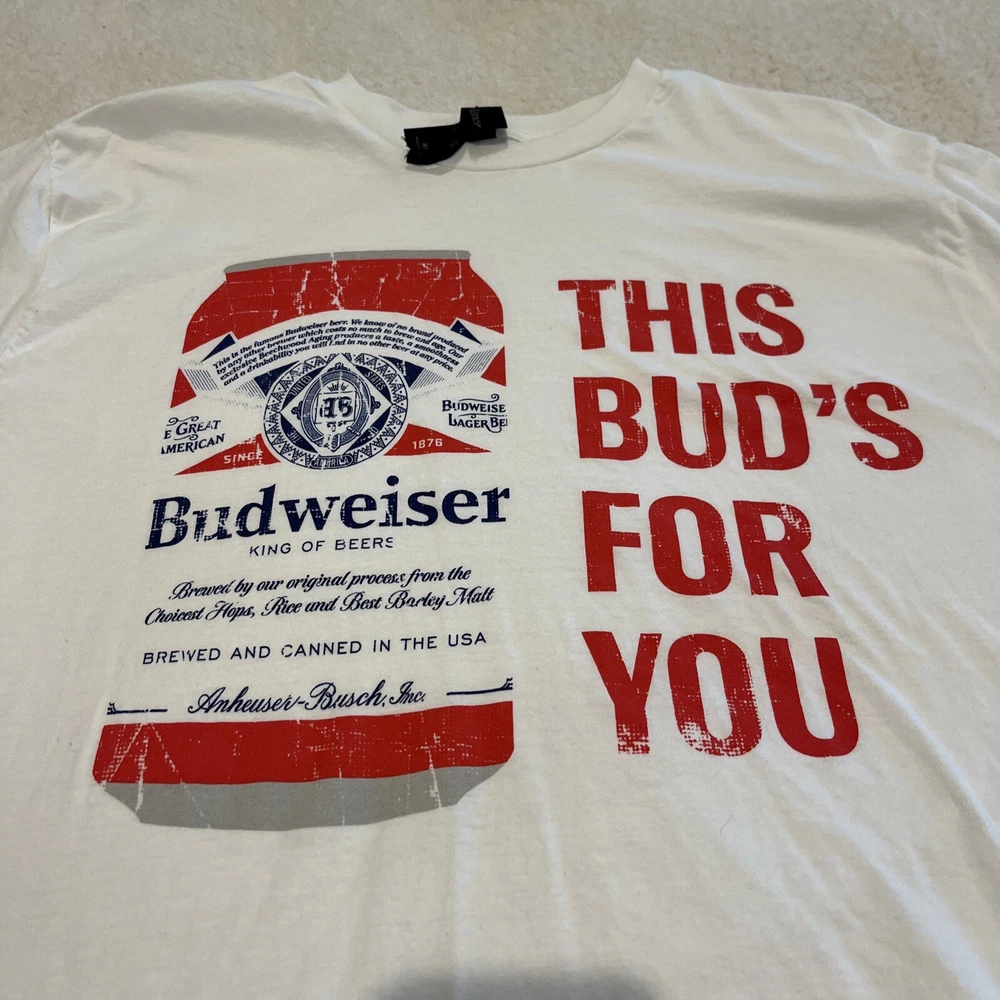 Elevate your wardrobe with this classic Budweiser This Bud Is For You logo t-shirt from Hanes. Made with 100% cotton, this regular fit graphic tee features short sleeves and a crew neck neckline. The white color shirt is perfect for any casual occasion and is available in size XL for men. The shirt's logo accent adds a touch of uniqueness to the design, making it a great addition to any collection. This beer-themed t-shirt is perfect for anyone who loves a good Budweiser and wants to show off their style. Add this Hanes t-shirt to your wardrobe today!
