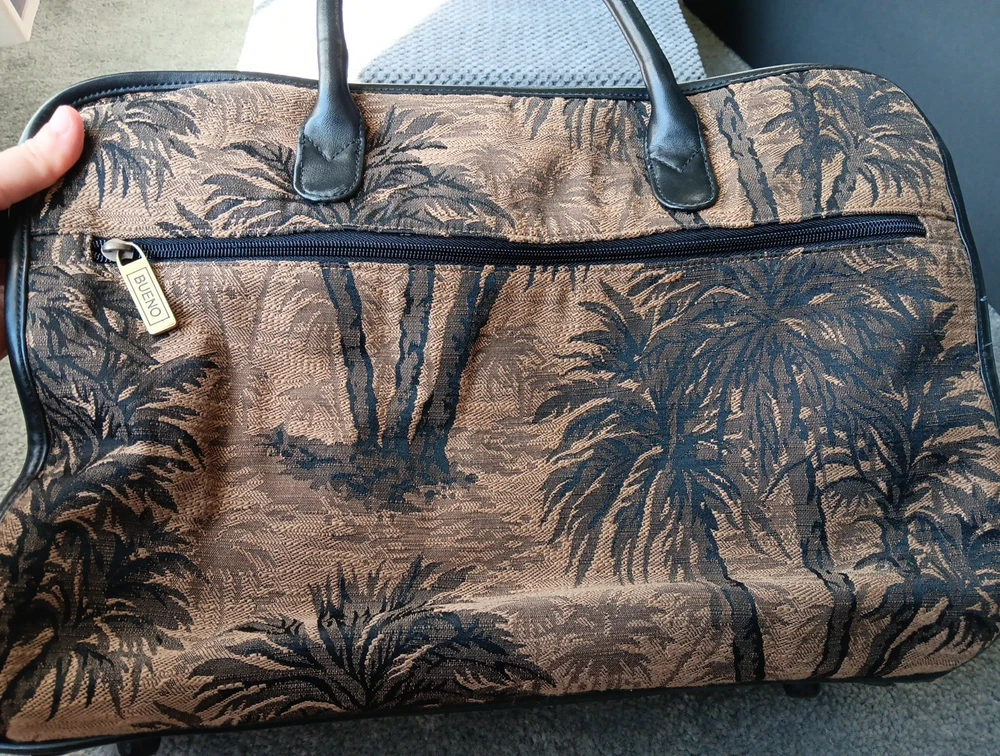 Nice size pre-owned overnight, carry-on, weekend bag by Bueno. It has many compartments and pockets. It's a bronze tone of brown with black trim and tropical/palm tree pattern. Good condition handles. It is missing the shoulder strap. There's is minor wear to the bottom. Please see photos. Please message me for additional photos or information.