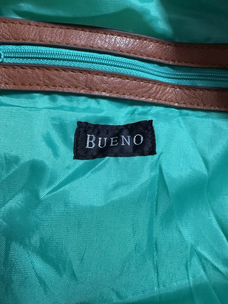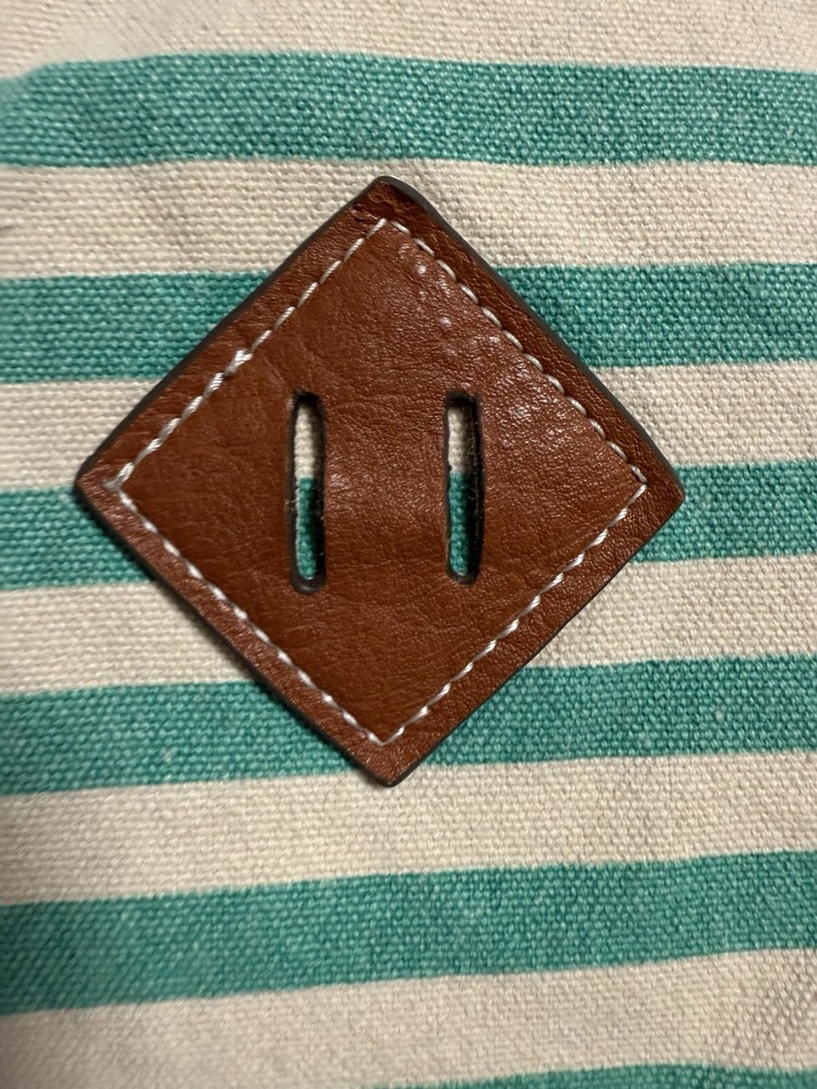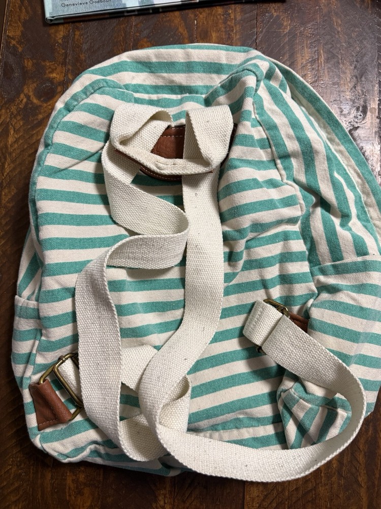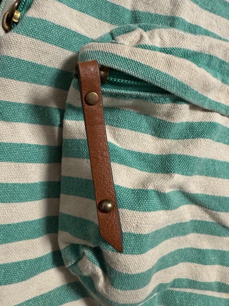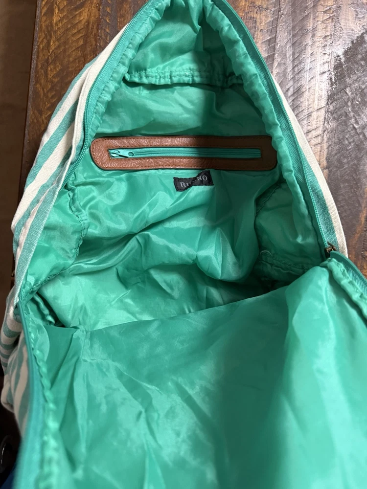 Bueno back pack green and white stripes 3rd pic shows the zipper lost it string but still works