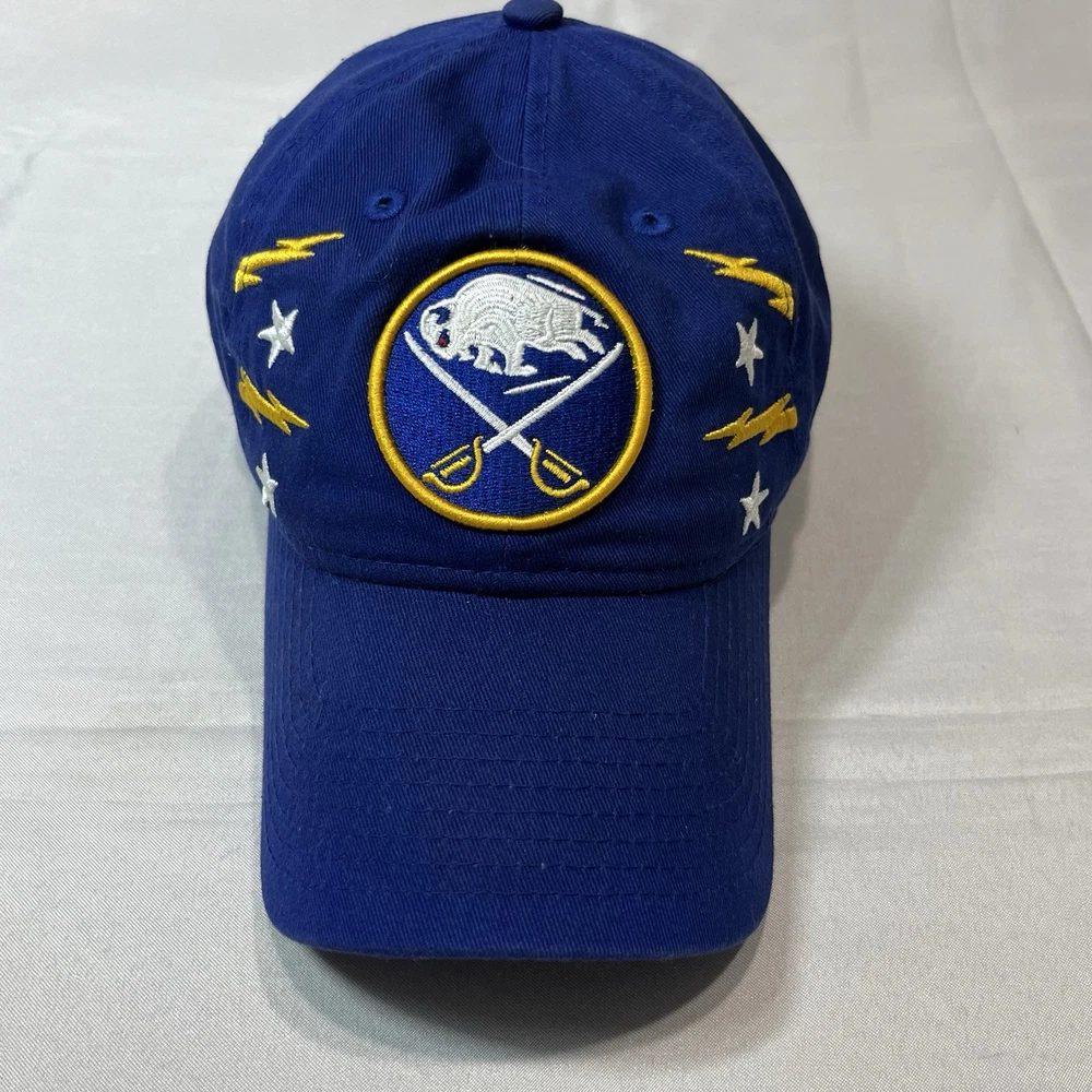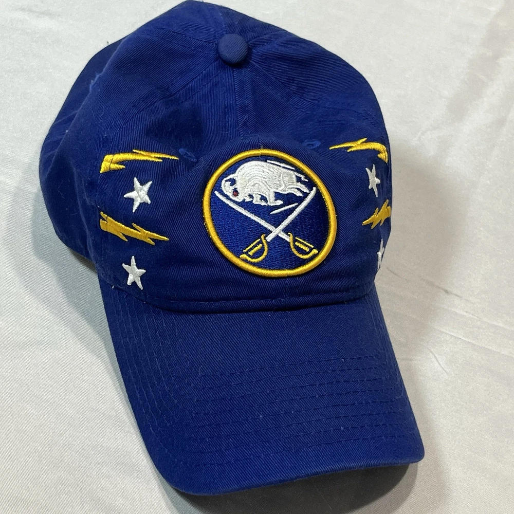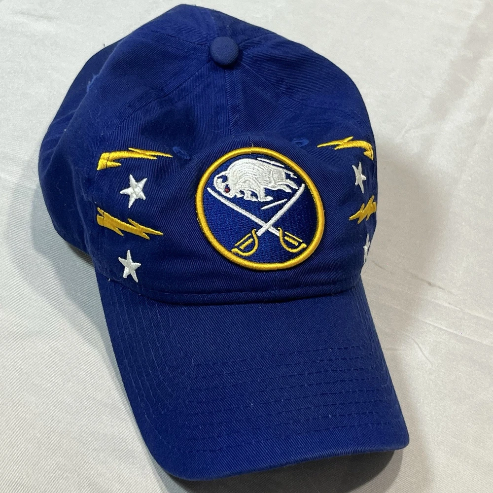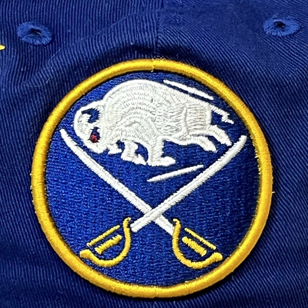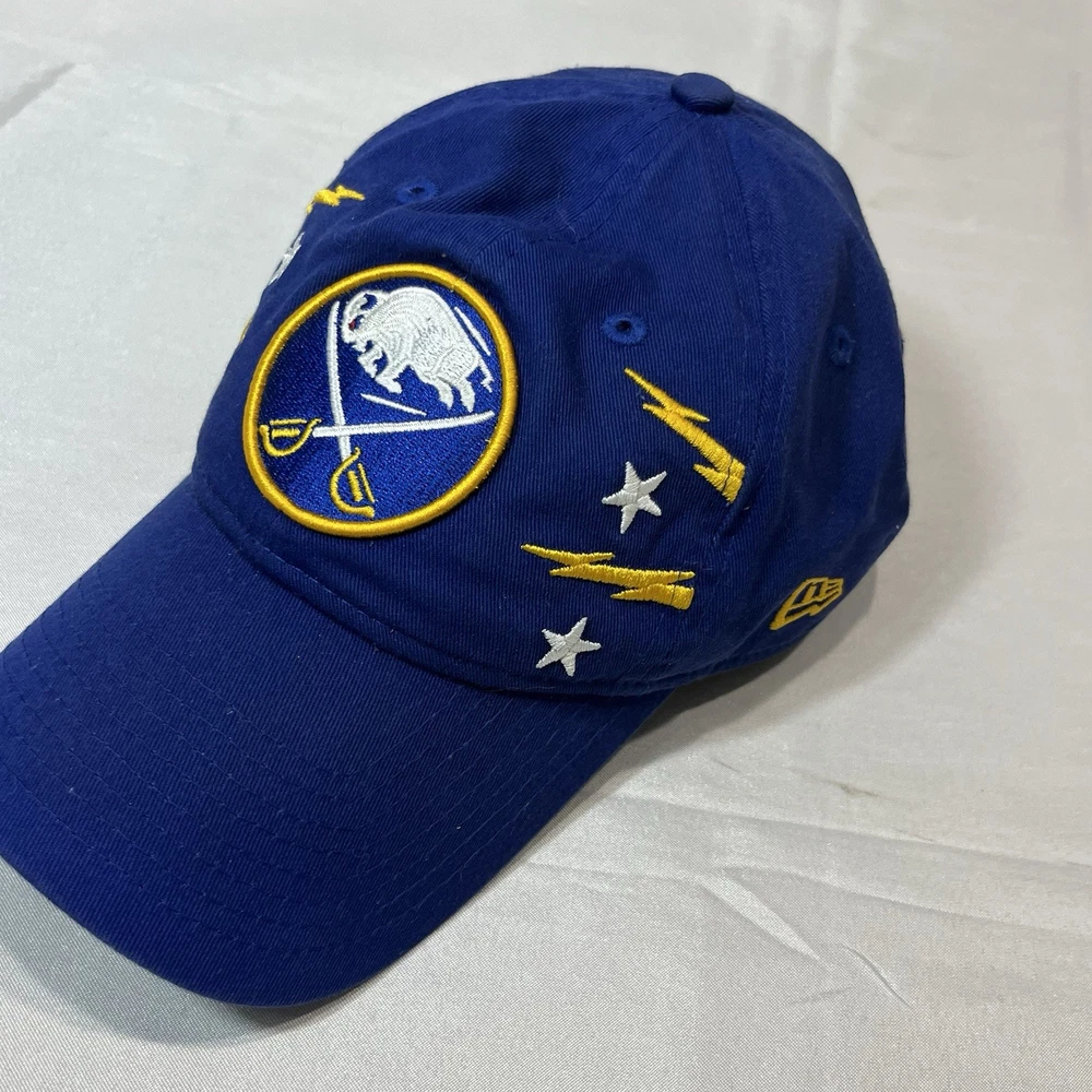 The Buffalo Sabres Hat by New Era is an officially licensed retro cap featuring the team's iconic colors and logo. This adjustable strap back cap is perfect for hockey fans looking to showcase their support for the Buffalo Sabres during the regular NHL season. Made in China, this one-size-fits-all cap is a stylish accessory for fans of the team and the sport of hockey.233.π